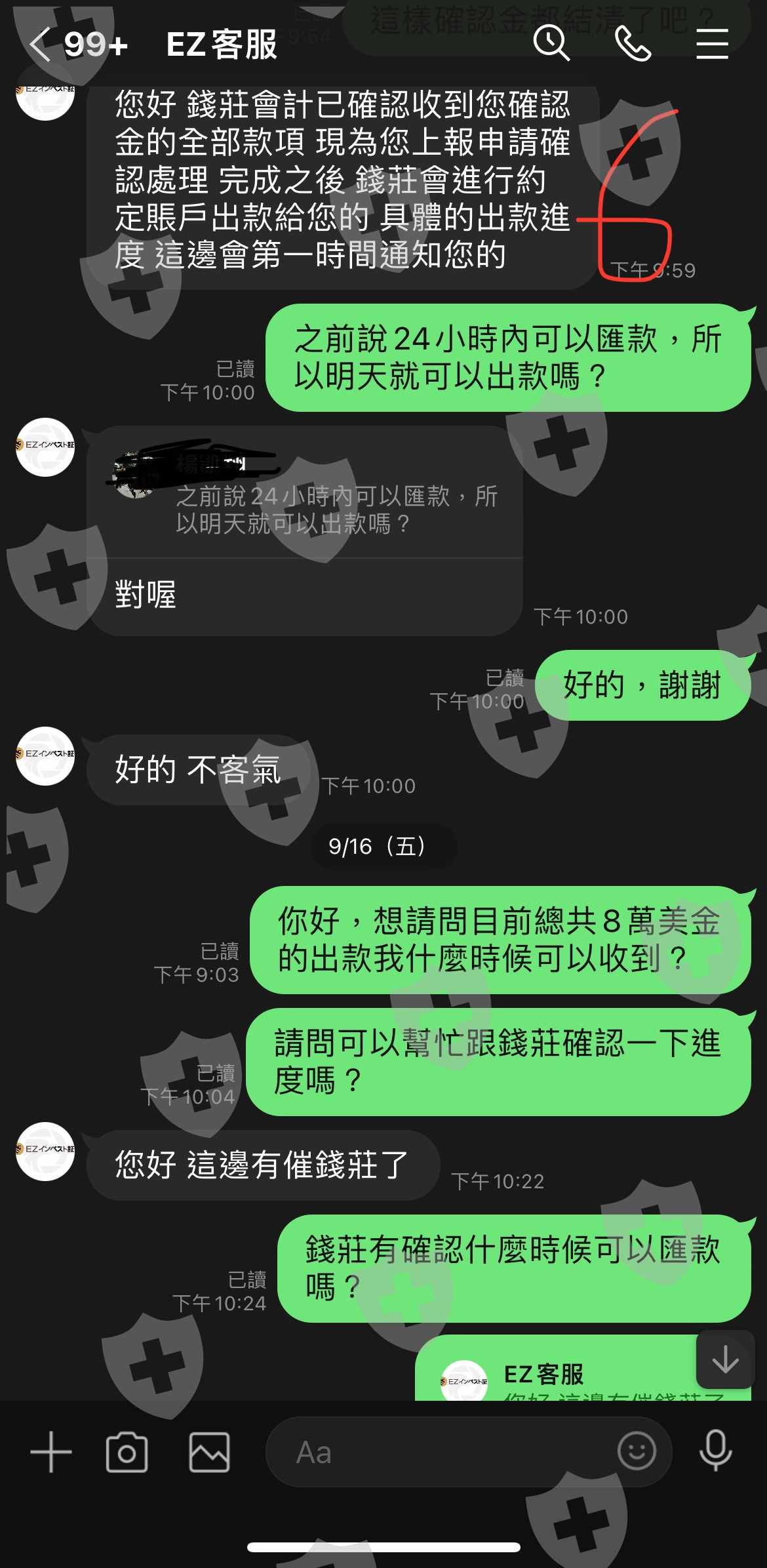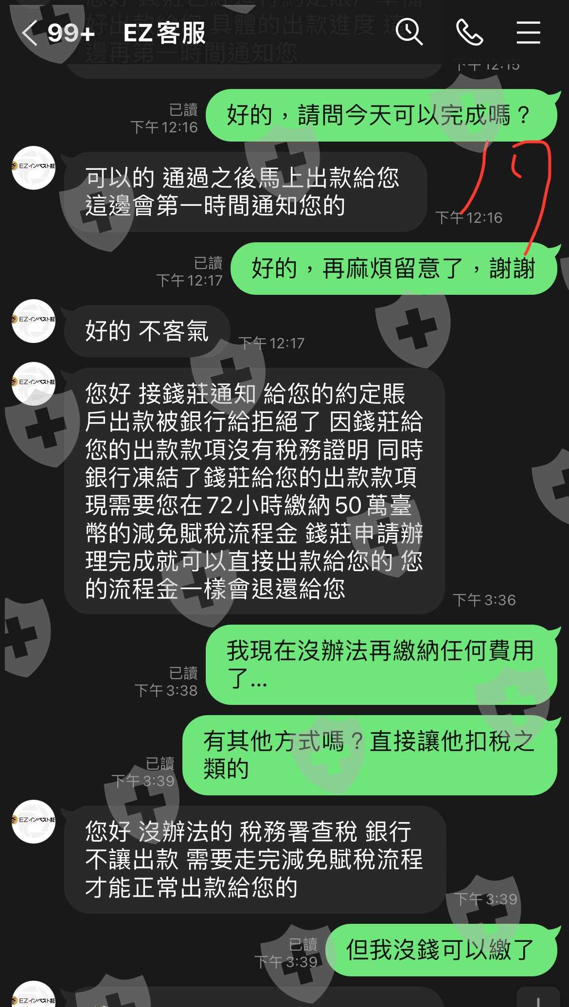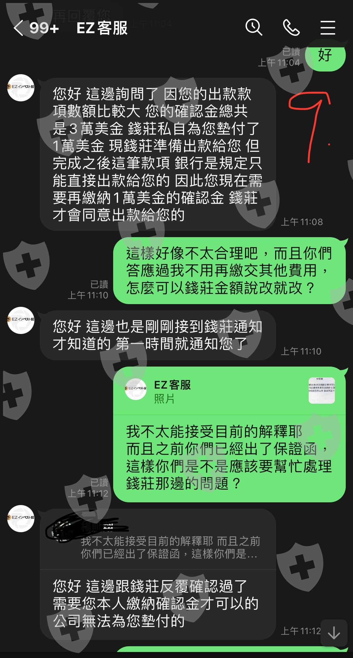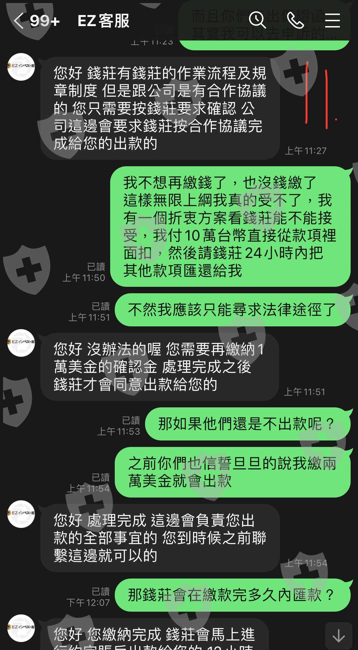 接續前一則擅自將出金交由錢莊匯款,後續持續要求繳交確認金,流程金...等各種名目的款項,並遲遲不匯款,也不履行保證函內所承諾的內容,最後說是稅務機關凍結了所有款項,卻還要求繳流程金才成完成匯款,總計90K USD, 連一塊都沒有退還