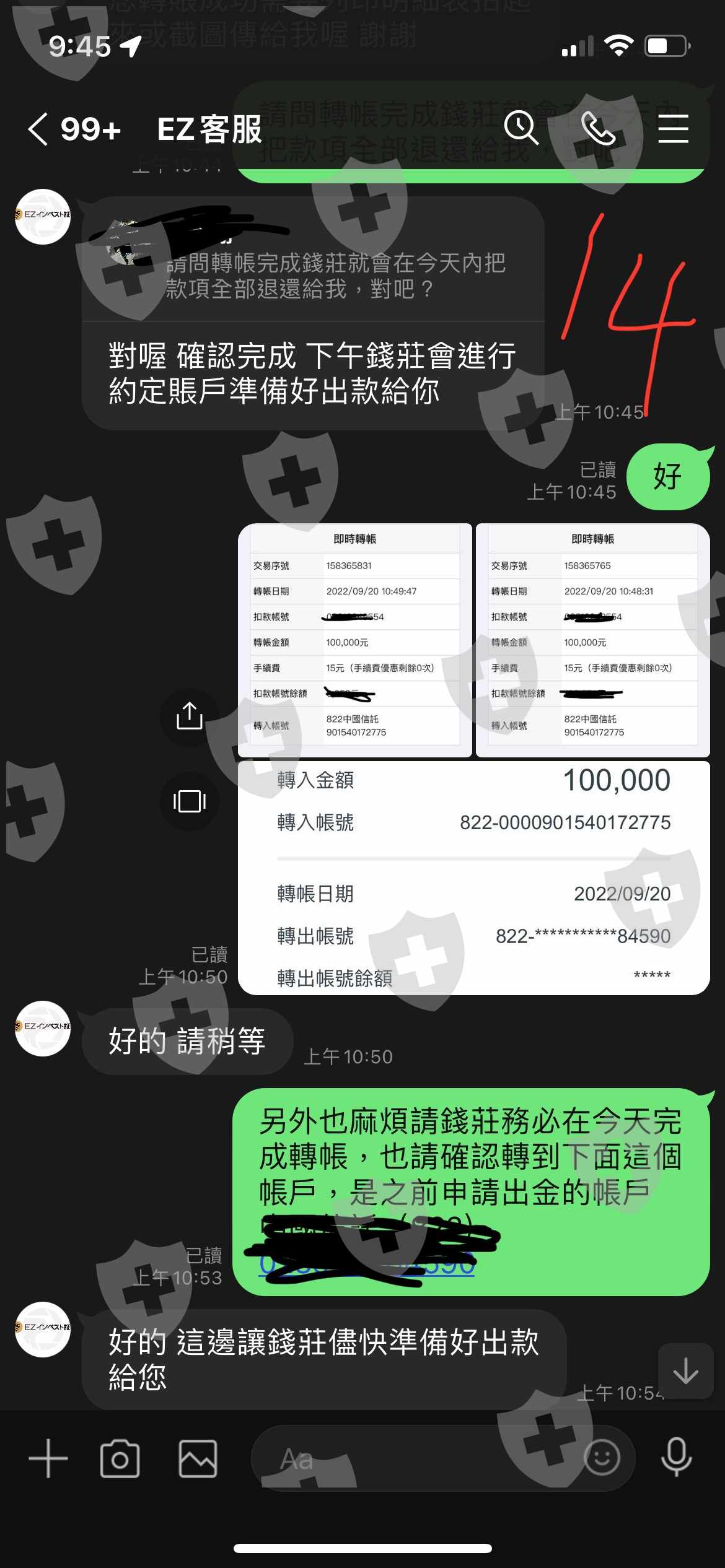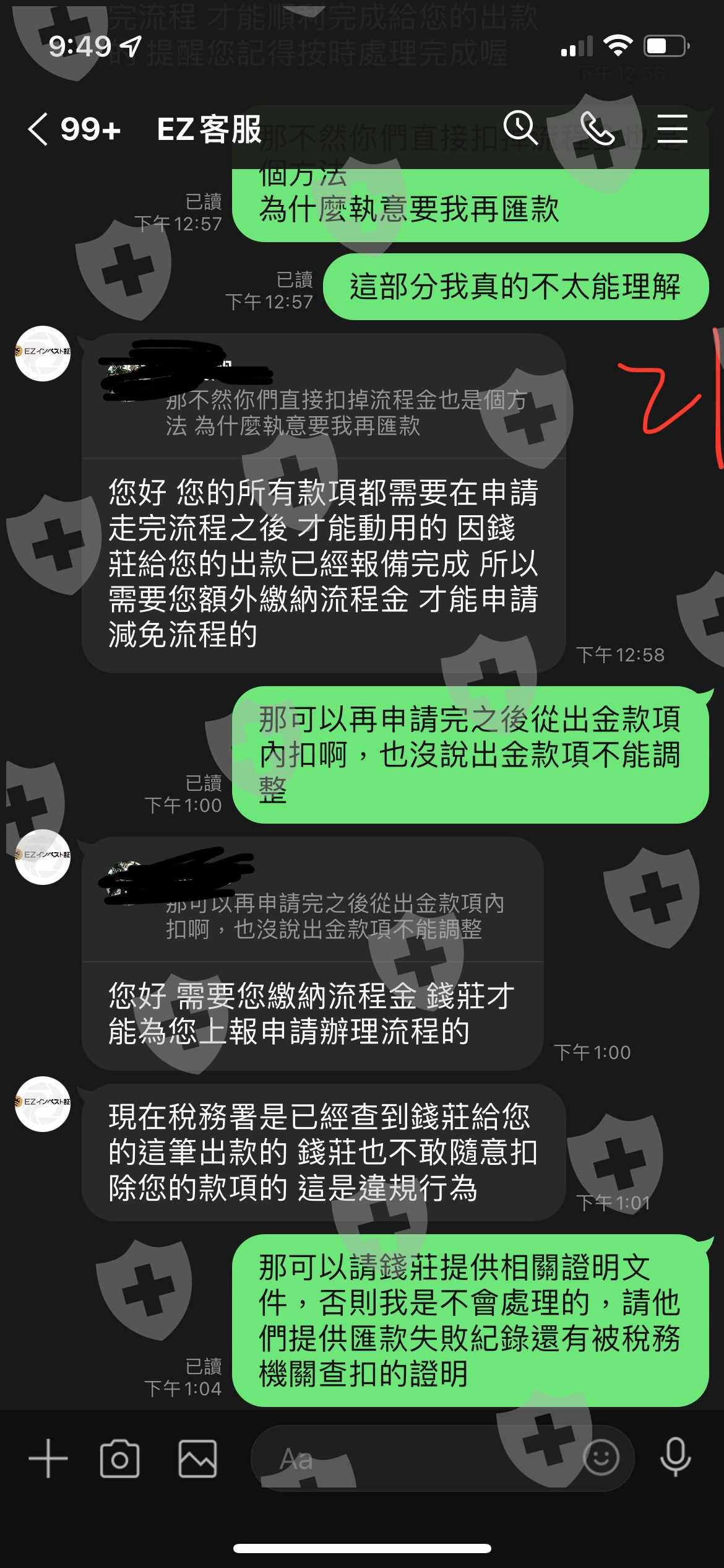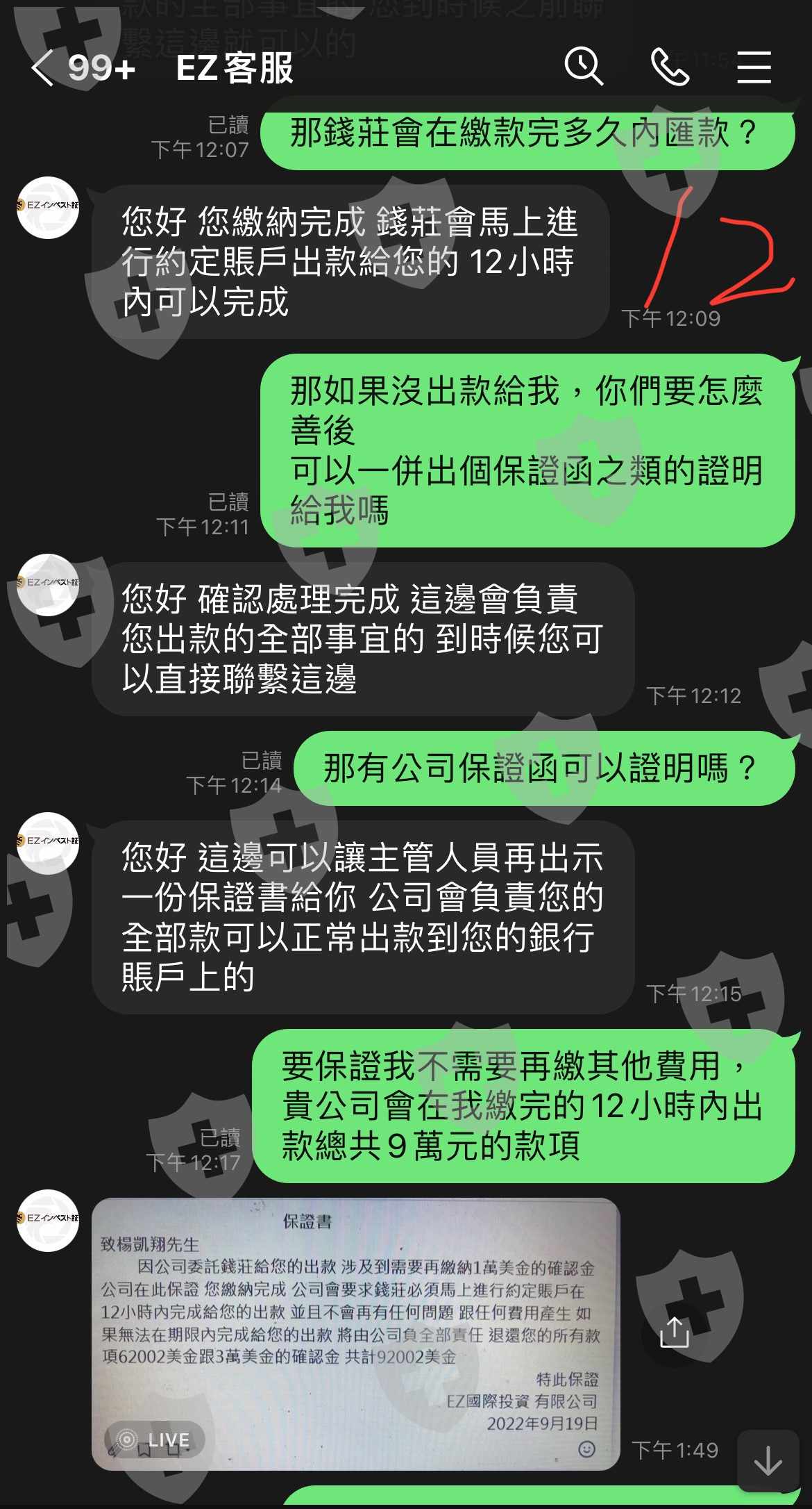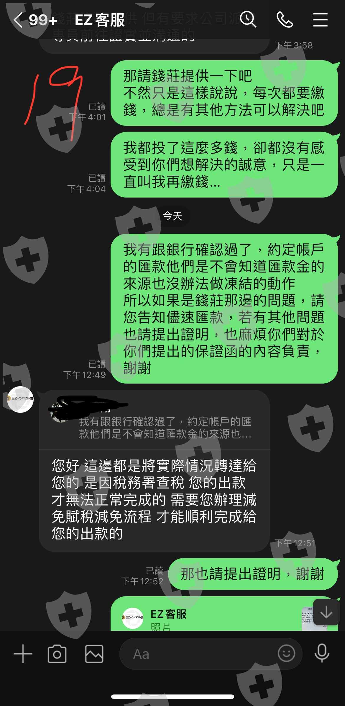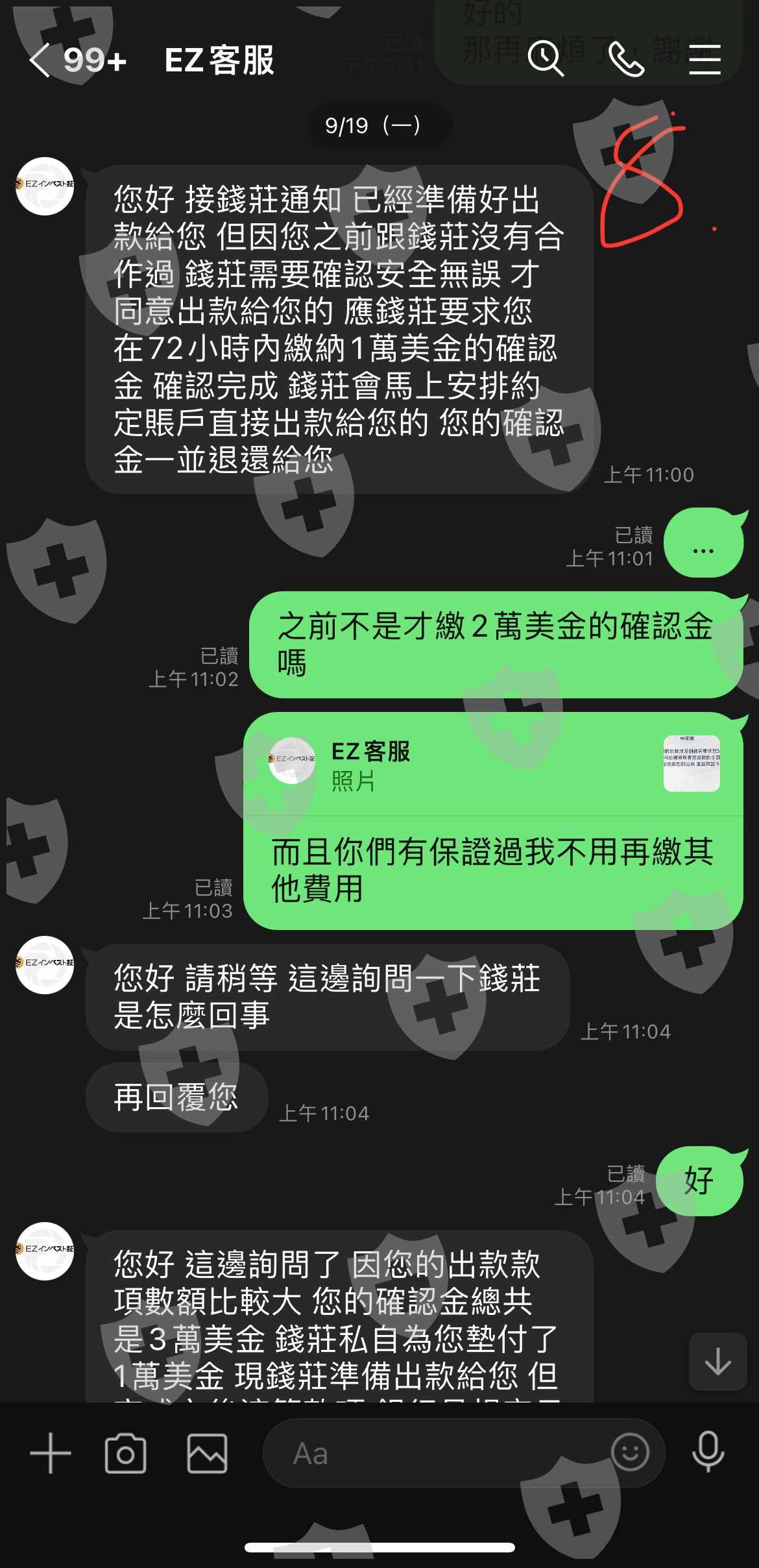 接續前一則擅自將出金交由錢莊匯款,後續持續要求繳交確認金,流程金...等各種名目的款項,並遲遲不匯款,也不履行保證函內所承諾的內容,最後說是稅務機關凍結了所有款項,卻還要求繳流程金才成完成匯款,總計90K USD, 連一塊都沒有退還