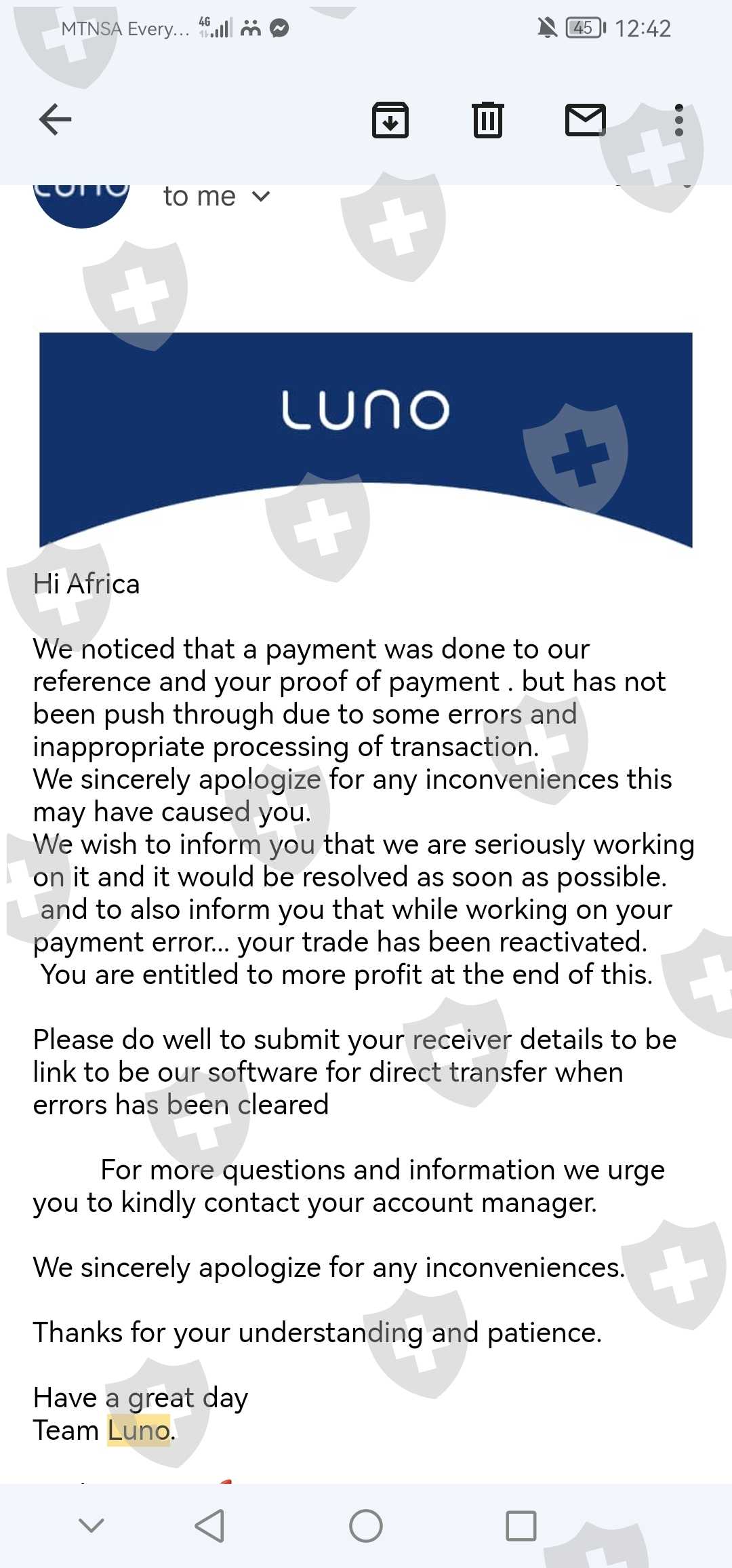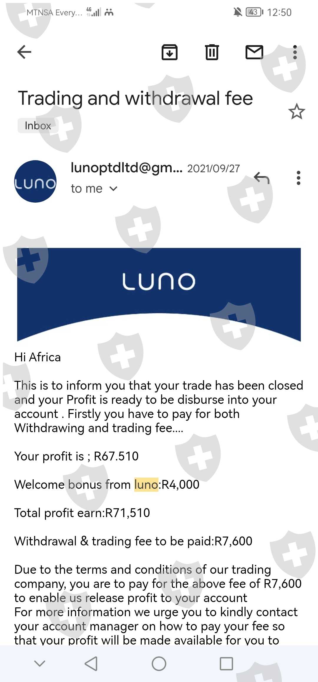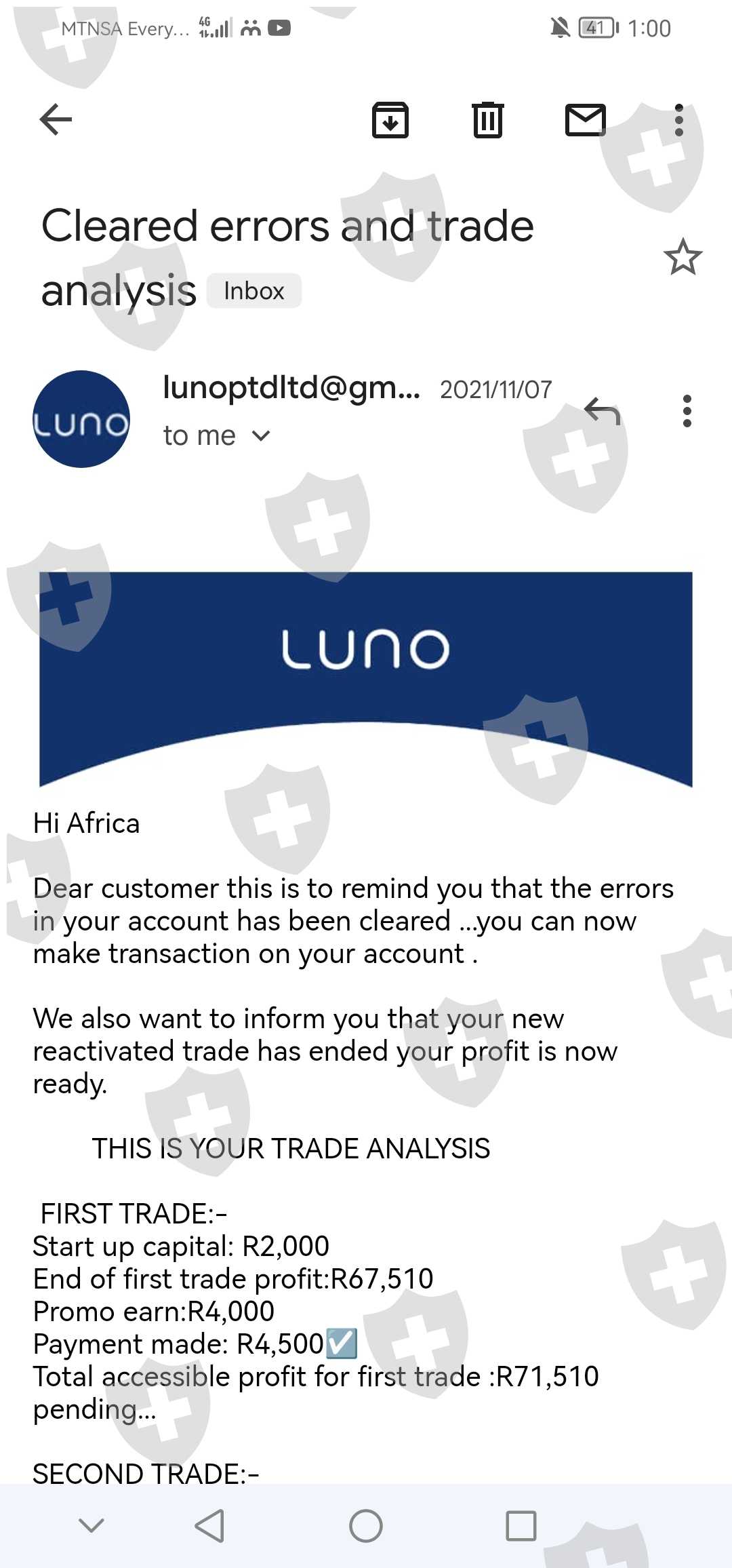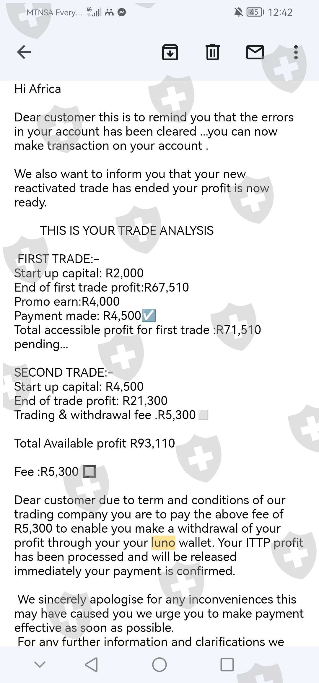 您好,我的名字是Africa Motlhabi,来自南非西北部,我于2021年9月21日开始交易,我开始交易的金额是R2000,这个帮助我的女士的名字是Moreki Tebogo.. 我在入金3次后才意识到费用... 存入的总金额为R7 648 包括我开始交易的第一笔金额 无法提款
