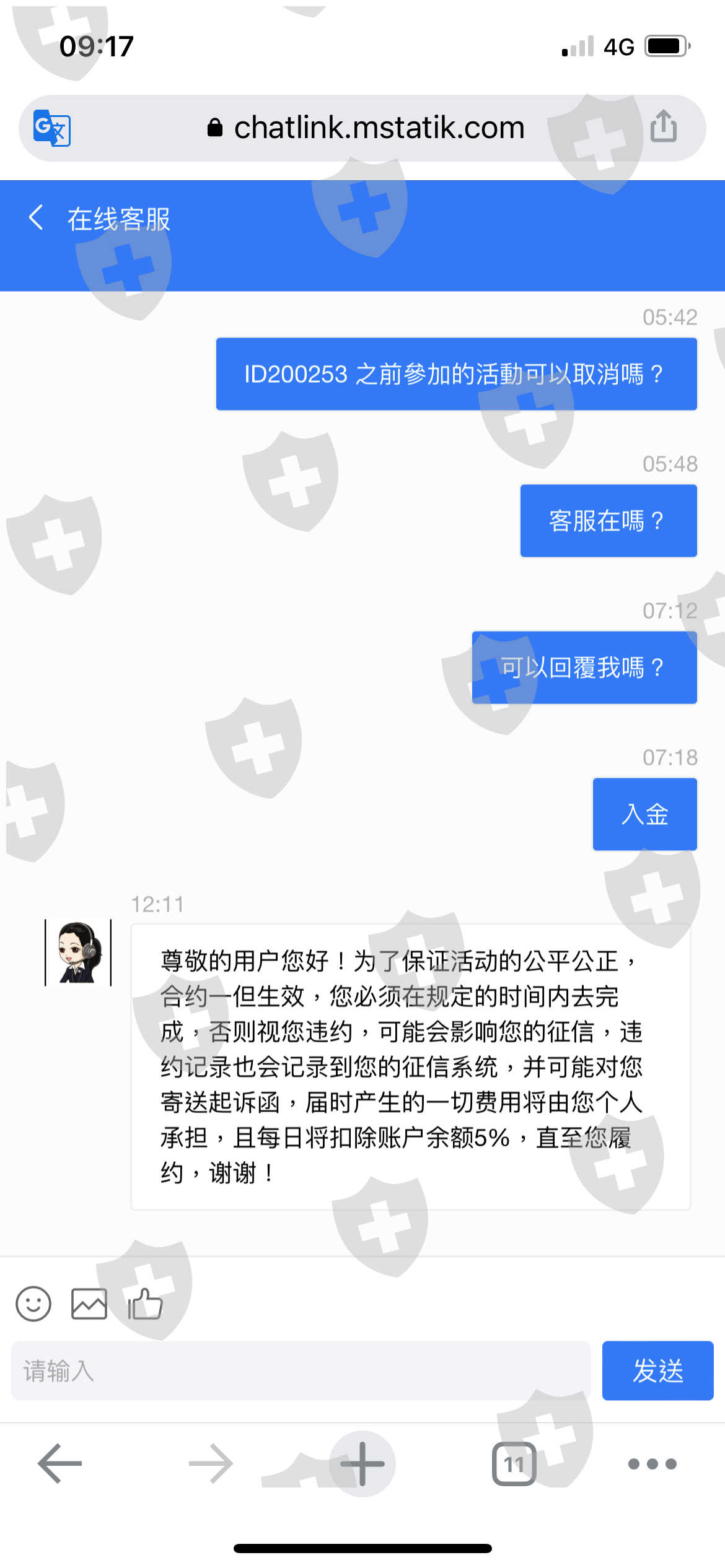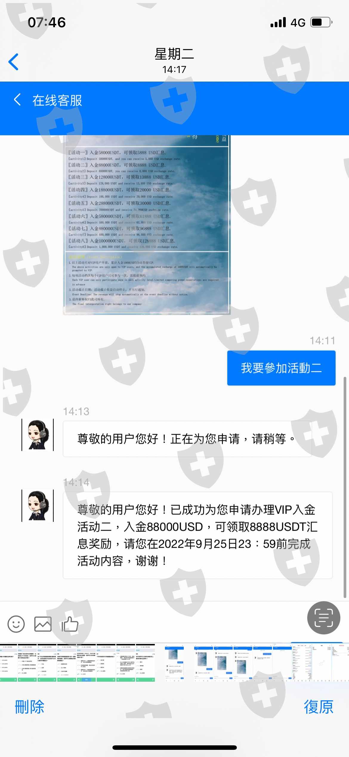 有一个来自香港中国的人带我入金USDT,刚开始先入3万台币等值的USDT,买黄金赚收益小赚,第二次叫我入金为了本金可以增加收益也会赚比较多,第三次直接叫我贷款我贷到70万台币等于是2万多USDT也是有赚,但是后来叫我参加的入金活动就很奇怪,要入金88000USDT,就送8888USDT收益,我参加了真的有看到帐户里有8888的收益奖金,但是活动上没说清楚,没有说入金不到活动的金额会扣除余额5%而是每天扣,也不能取款。