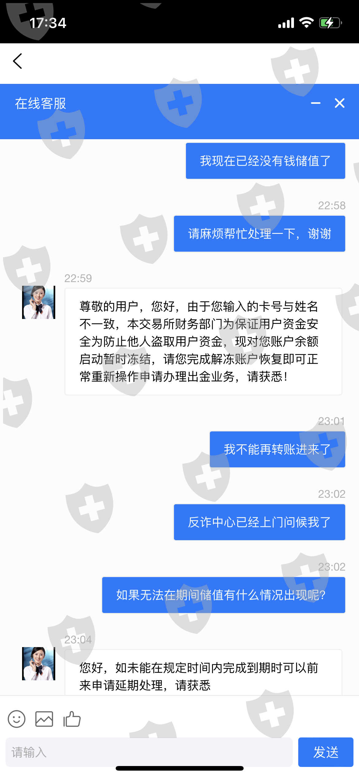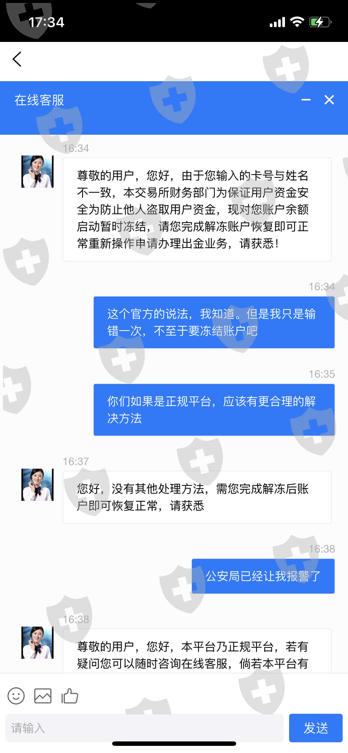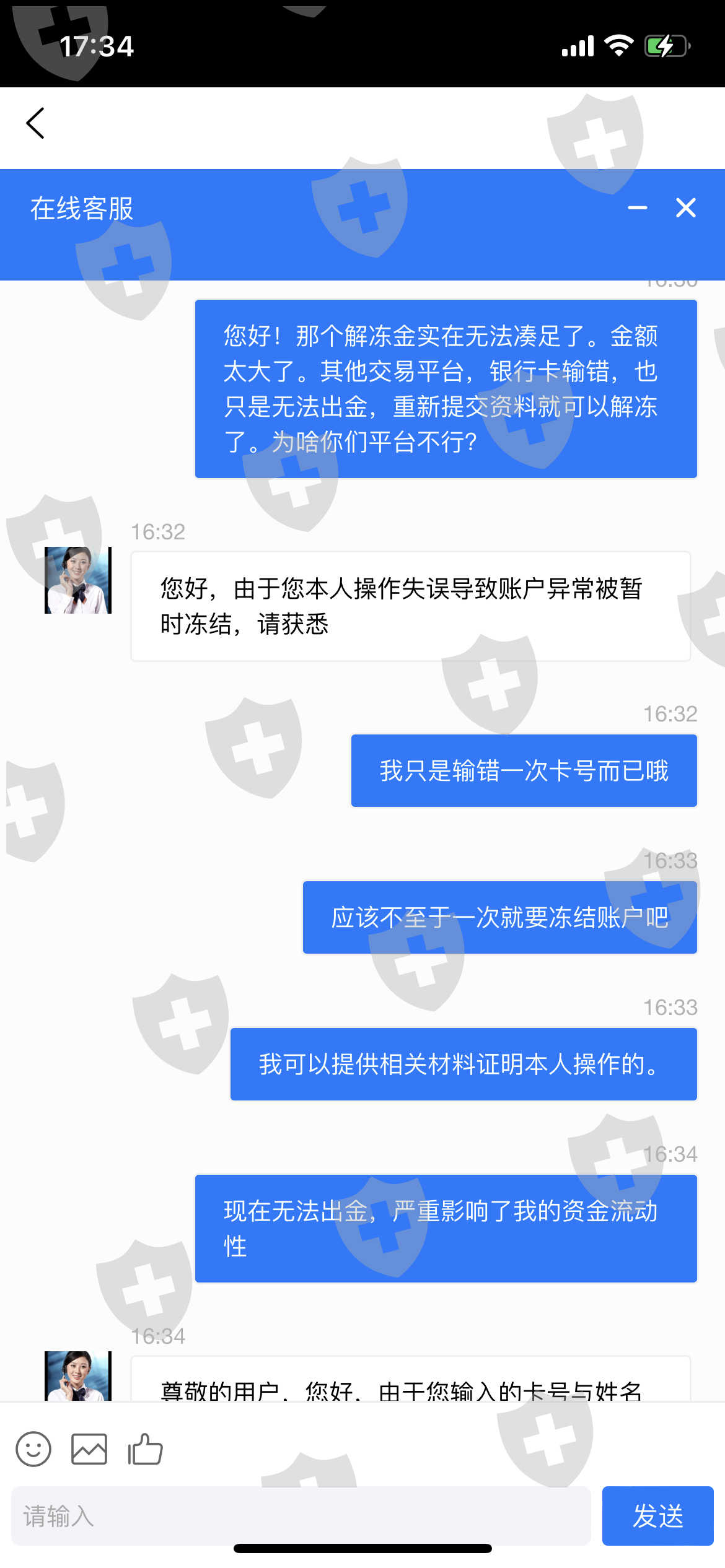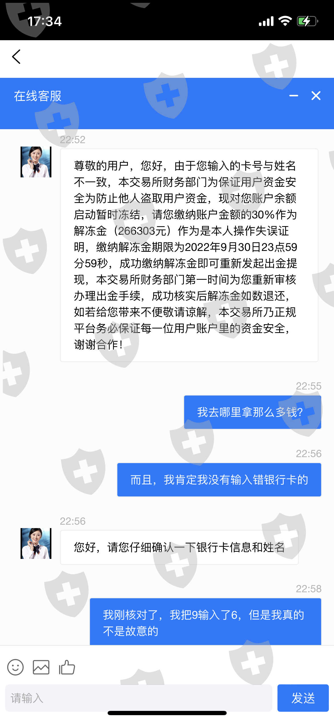 客服说我卡号输错,把我的账户冻结了。需要我在2022年9月30日23点59分前缴纳30%的解冻金,但是我已经没有那么多资金缴纳了,她就说可以申请延期,但每日要缴纳1万元的延期金。这简直就是无底洞。申请追回本金和收益,安排正常出金。