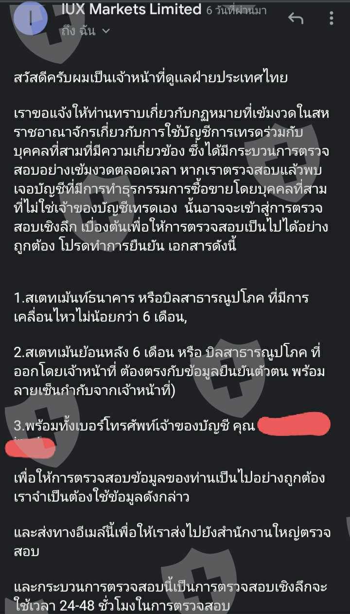ซึ่งก่อนหน้านี้ก็ฝากและถอนเงินมาสักพักแล้ว แต่ครั้งนี้สั่งถอนเงินไปแล้วทางโบรคก็เมล์มาเพื่อให้ส่งเอกสารยืนยันซึ่งทางเราก็ส่งไป ตั้งแต่วันที่ 28/09/65 จนถึงตอนนี้ 03/10/65ทางโบรคก็ยังไม่อนุมัติก่อนถอนเงินเลยคะ ซึ่งเขาอ้างว่าเราใช้ IP กับบุคคลที่สาม ซึ่งโทรศัพท์ของเราแทบจะไม่ได้ต่อ Wifi เลยเพราะส่วนมากจะใช้ internet sim เพราะกลัวเรื่องมิจฉาชีพต่างๆเพราะในเครื่องเราก็ติดตั้งแอฟ Banking ธนาคารต่างๆไว้ด้วย