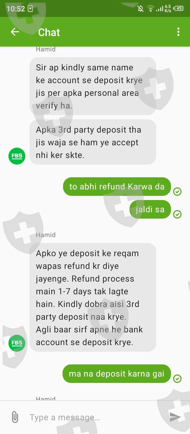 在FBS入金,但是他们说第三方不允许。在7天内会退还。但是已经7天了,还没有收到退款