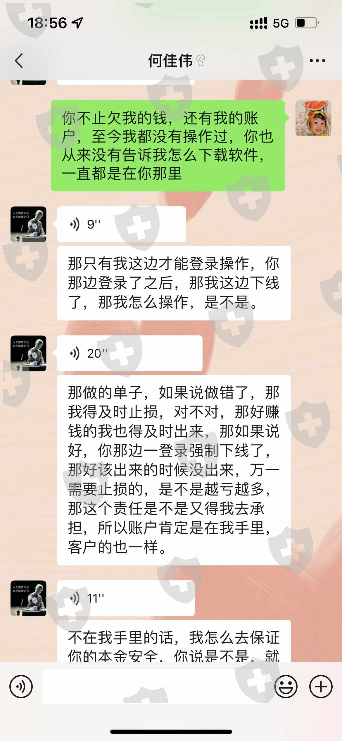 本人实名曝光NAG代理何佳伟(广东南山人)7月份何佳伟以他是该平台的代理,他是自己开公司,做了很多次金九银十,并且都是保本收益,金九银十公司有活动获得增金为由,诱导我投资,第一次投资5000美金获得500美金,第二次投资5000美金获得650美金,在此期间,他只教我注册跟改密码,手机app软件也不教我下载,说他保证本金,只认他就行,期间我也问过他邮箱的每日确认书,他说那都是广告,不需要管。第二次投资放15个工作日就能出来本金跟增金,到期之后,何佳伟以我的账户是主账户,说我的账户挂了其他人的单子现在取不出来,只能等到11月份,1我找他索要账号密码跟下载软件,他也是不给我,在此期间,我没有收到他任何一笔外汇利润,我要本金他也是一直推脱,一直说他在想办法,说我账户有亏损,现在也出不了金,不给我出金,10月1号我还收到了一封邮件,我怀疑现在我的账户已经没有钱了,我外行人看不懂,还请平台帮我看下账户到底是怎么回事?何佳伟到底是不是你们平台的代理?每个人的钱不是大风大浪吹来的,都是辛苦钱,还请平台实事求是