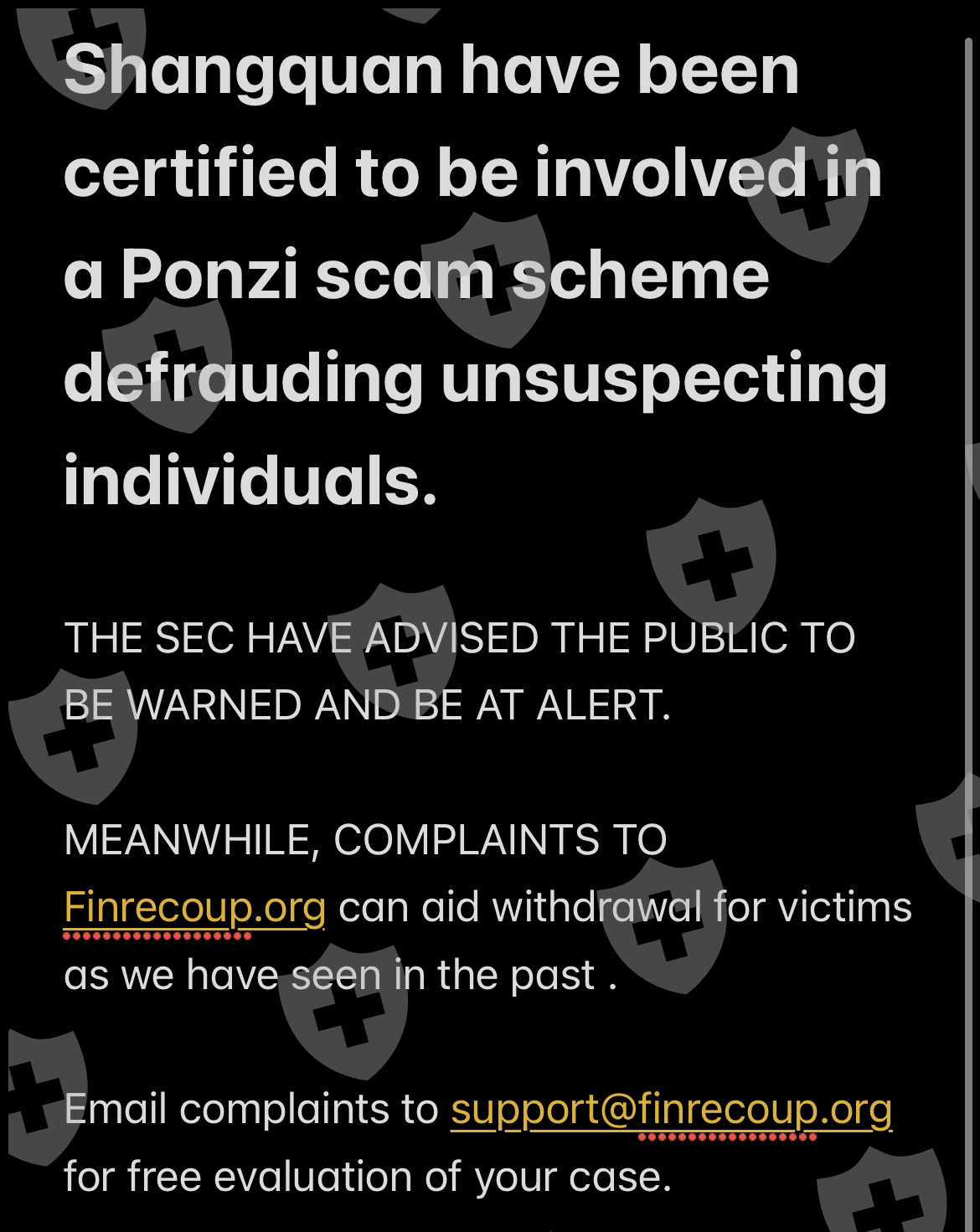 Shangquan is that broker to be avoided at all cost because of the manner in which they operate and the bad part is they never allow withdrawals to happen. My trading account was funded from my crypto exchange and after receiving notification of deposit in my MT5, I started trading and grew my investment portfolio to a stage where I got satisfied to withdraw. the very strange part happened when I requested withdrawal and I was told that I have to reach a certain amount in trading balance before I could withdraw. this raised the first red flag and I emailed them why? they responded that it is the usual but my instincts told me otherwise which was why I researched into Shangquan existence as a broker and I found that they have scammed a lot of people . I feel bad to be a victim but I am glad to expose them. I have shown my deposits in the pictures below to their wallet address and as well validation from the relevant authorities that they are running a scam scheme which would be helpful.