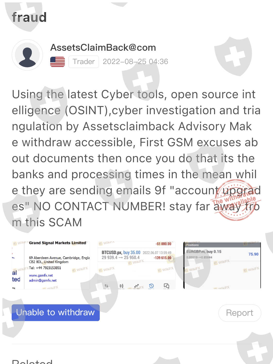 他们以可疑行为为由拒绝了我的提款并关闭了我的帐户,并向我发送了电子邮件作为他们的理由。对我的交易账户进行了安全检查,由于我不理解的可疑活动,他们被迫停止了它。他们向我保证,我的所有存款都会退还,我以文本形式向他们提供了我的受益人帐户信息,以便他们可以转移我的资金,但他们拒绝了,当我意识到这是个诈骗时,这是绝望的,这是我第二次发布关于GSM的帖子并对我上传的照片进一步解释。