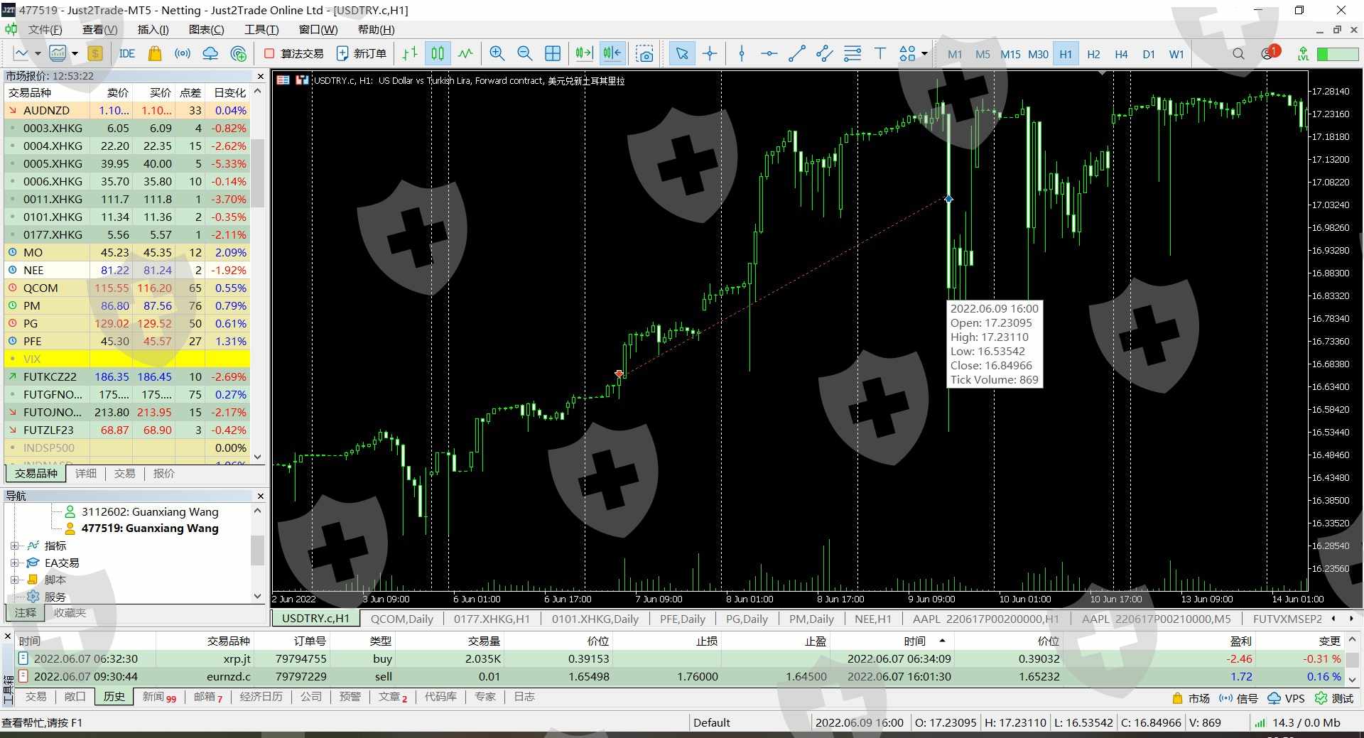 我于2022/6/9在mt5平台上的两单usd/try被强平.