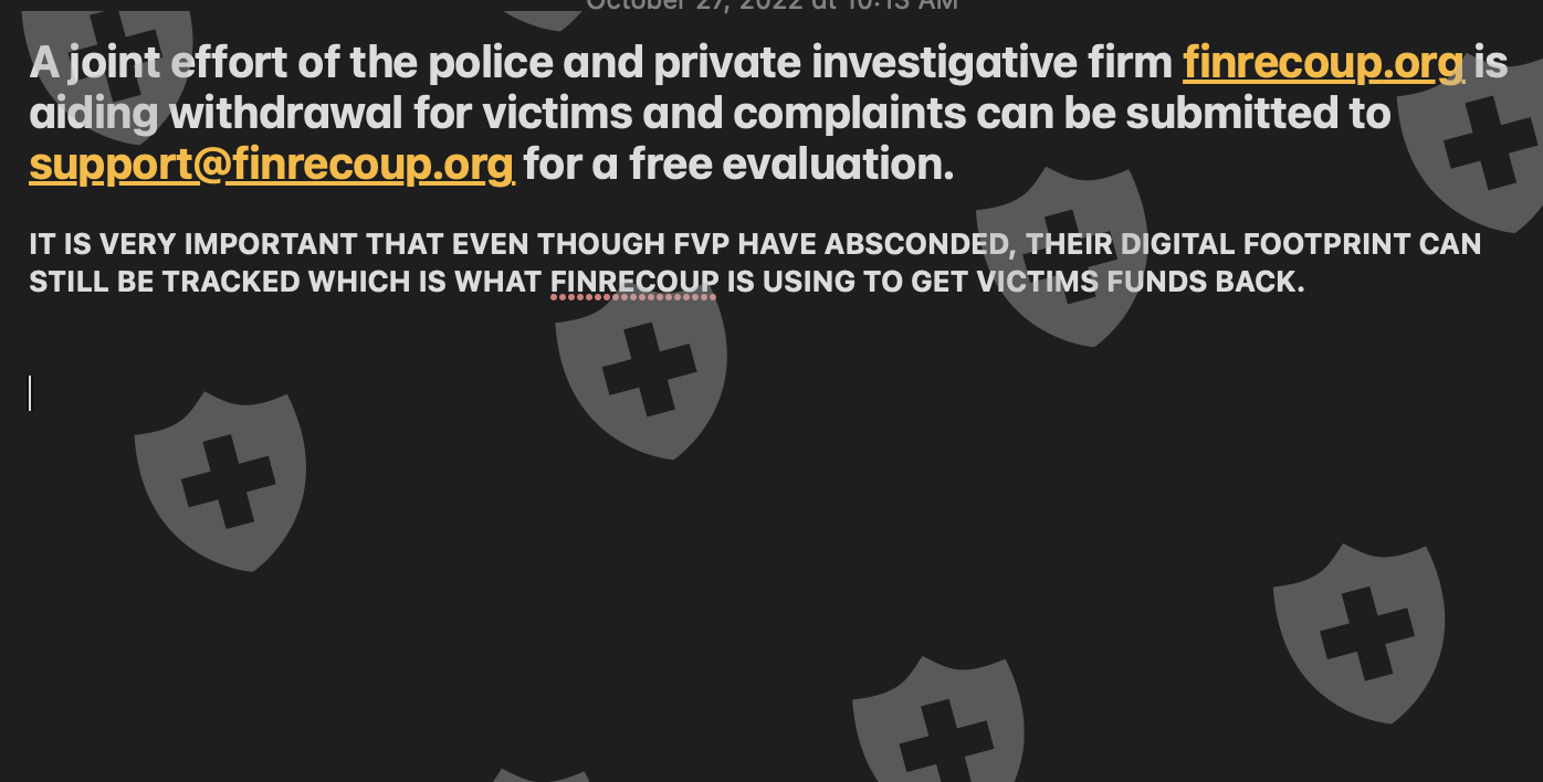FVP Trade骗了我们很多人并跑路了,但他们不能像那样卷走我的资金。这一切都始于我被一位在线朋友介绍给该经纪人时,后来我意识到他是整个骗局的一部分。我从我的交易所将资金转移到 fvp 钱包地址,以便为我的 mt5 账户提供资金并开始交易。我交易到了某个点,我决定退出,所有的提款请求都被拒绝了。请求被拒绝后不久,他们的网站就被关闭了,那时我痛苦地意识到我卷入了一场骗局。我咨询了一位技术朋友,他建议我与私人调查公司联合向网络犯罪警察部门报告,结果如下所示,我的证明如下,显示了我的存款和其他。