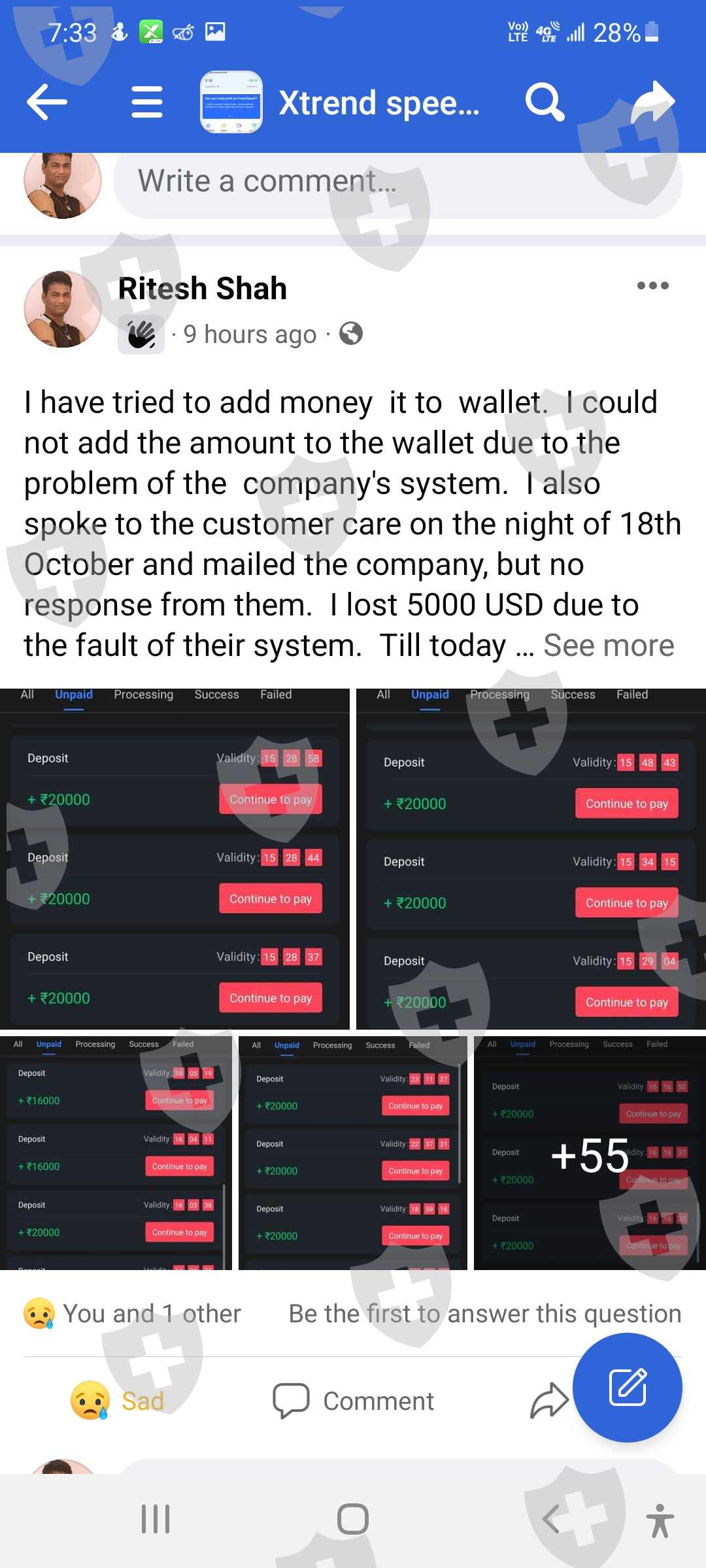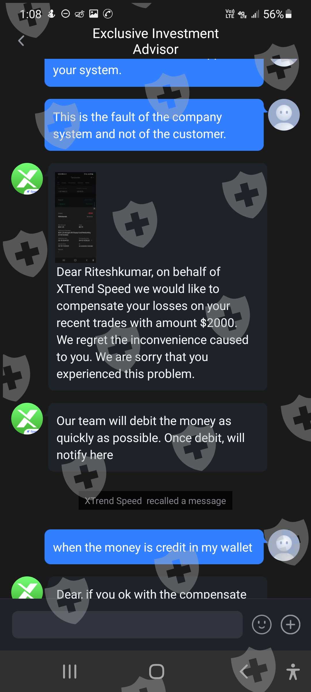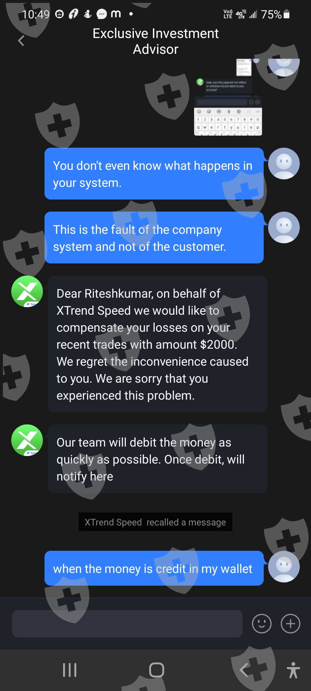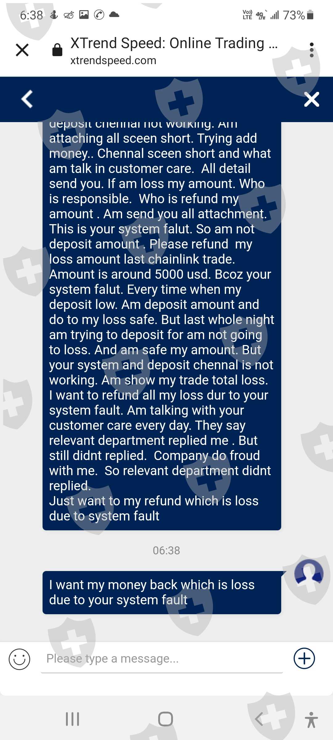 这是我的客户id 62301107。我叫Ritesh shah,我在10月18日的投诉尚未解决,10月26日我又面临了新的问题。由于系统故障。系统平仓了我2笔交易。这一次,为了保持交易的保证金平衡,我存入了存款。存款通道正常工作。即便如此,你们还没有关闭我的交易。骚扰客户是贵公司的政策。即使在今天,由于您的系统故障,我也看到了 1471 美元的损失。这是与客户一起玩的方式。 10 月 18 日,我损失了大约 5000 美元。由于您的系统故障,今天在 10 月 26 日损失了 1471 美元。由于您的系统故障,我想退还我的金额,我今天附上了短片。您的相关部门是否在处理我的投诉?他们没有时间回复客户这是公司的作弊方式吗?这家公司通过这个系统赚钱他们在客户marzinge leval低时关闭存款。客户想要存款,但他们没有通过他们的 xtrend 收入系统添加资金。他们对客户做空我有所有的证据。并上传听到。你想和客户服务谈谈。那些人会让我们等上7个小时。这家公司提供服务吗?这是骗子公司。不要相信他们