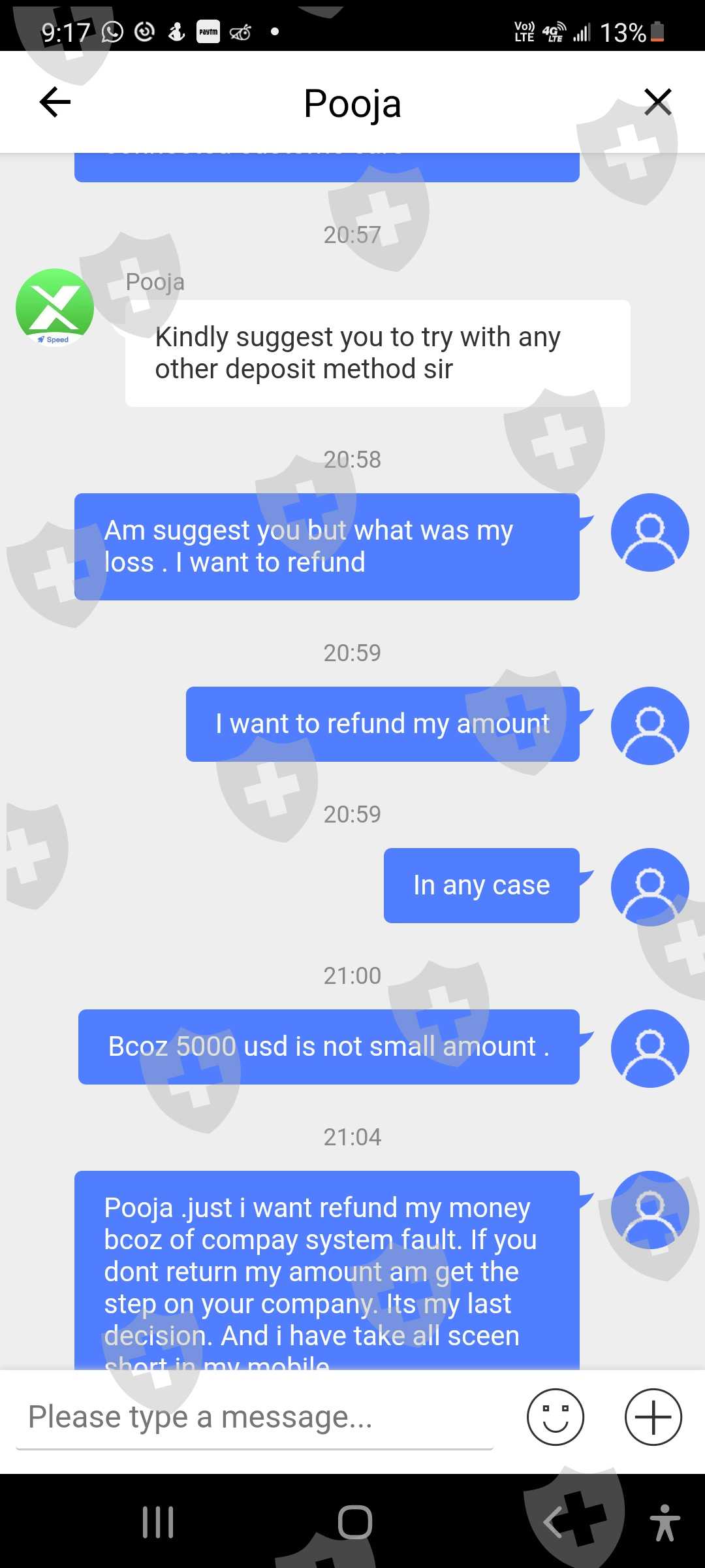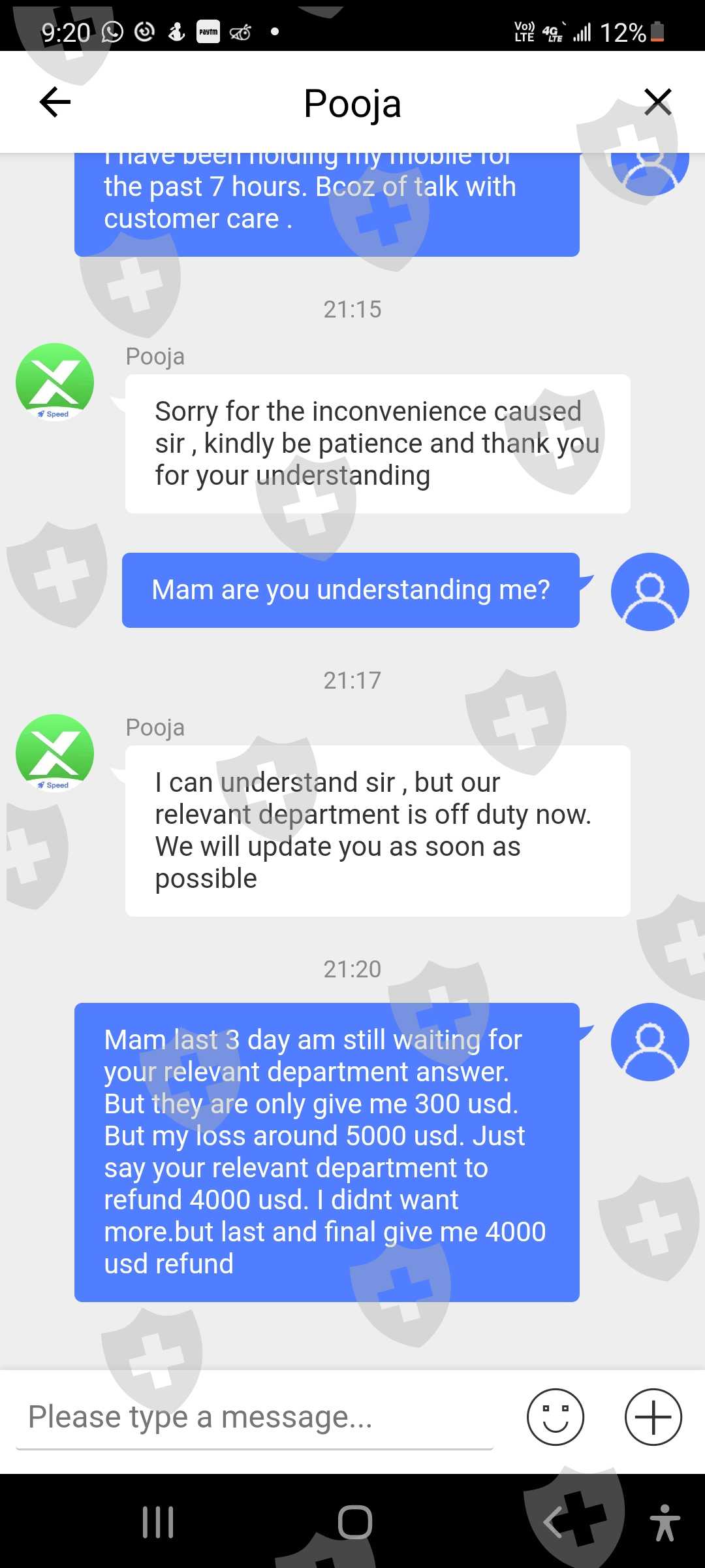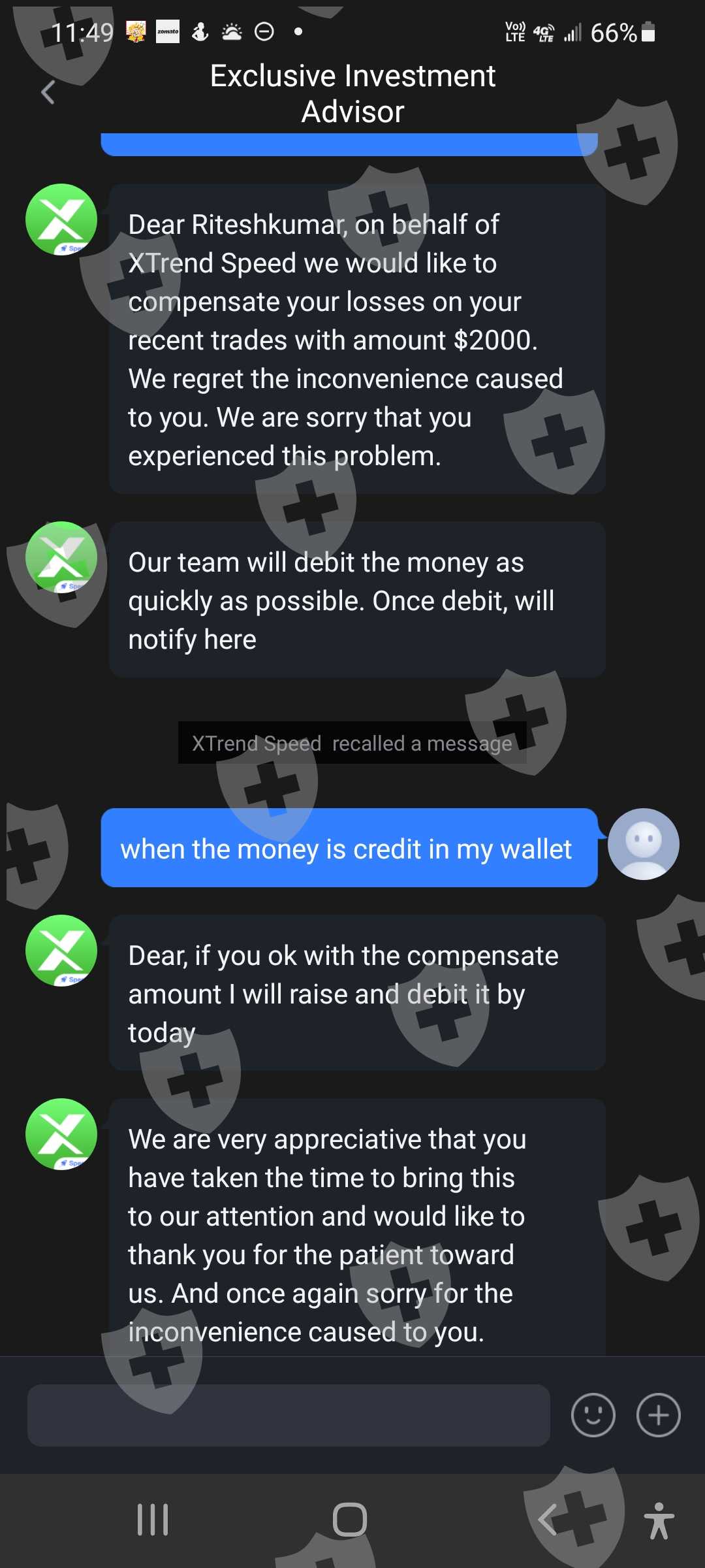 这是我的客户id 62301107。我叫Ritesh shah,我在10月18日的投诉尚未解决,10月26日我又面临了新的问题。由于系统故障。系统平仓了我2笔交易。这一次,为了保持交易的保证金平衡,我存入了存款。存款通道正常工作。即便如此,你们还没有关闭我的交易。骚扰客户是贵公司的政策。即使在今天,由于您的系统故障,我也看到了 1471 美元的损失。这是与客户一起玩的方式。 10 月 18 日,我损失了大约 5000 美元。由于您的系统故障,今天在 10 月 26 日损失了 1471 美元。由于您的系统故障,我想退还我的金额,我今天附上了短片。您的相关部门是否在处理我的投诉?他们没有时间回复客户这是公司的作弊方式吗?这家公司通过这个系统赚钱他们在客户marzinge leval低时关闭存款。客户想要存款,但他们没有通过他们的 xtrend 收入系统添加资金。他们对客户做空我有所有的证据。并上传听到。你想和客户服务谈谈。那些人会让我们等上7个小时。这家公司提供服务吗?这是骗子公司。不要相信他们