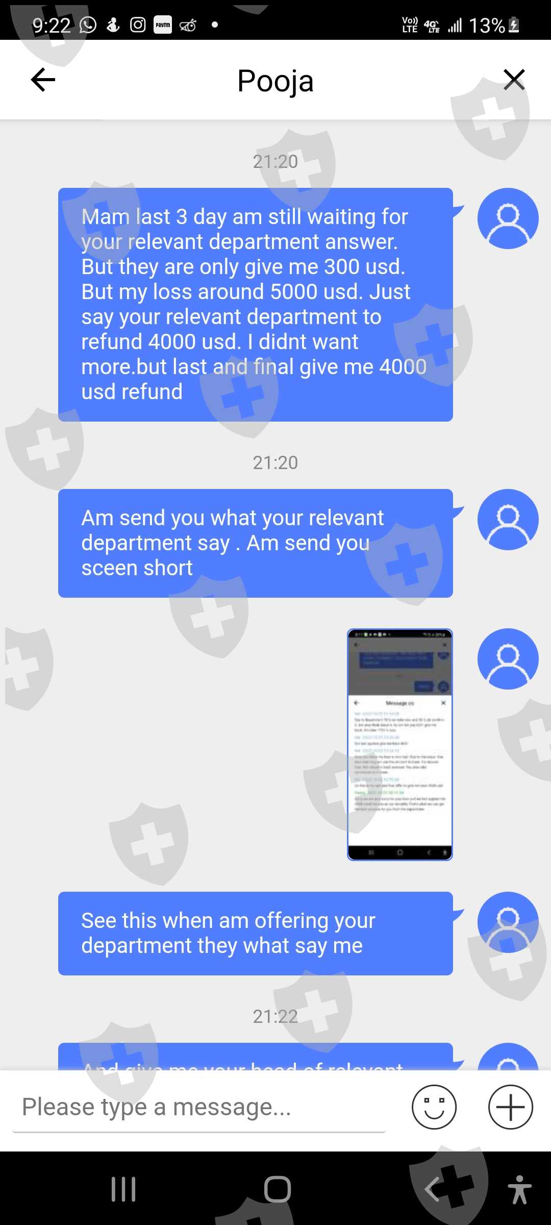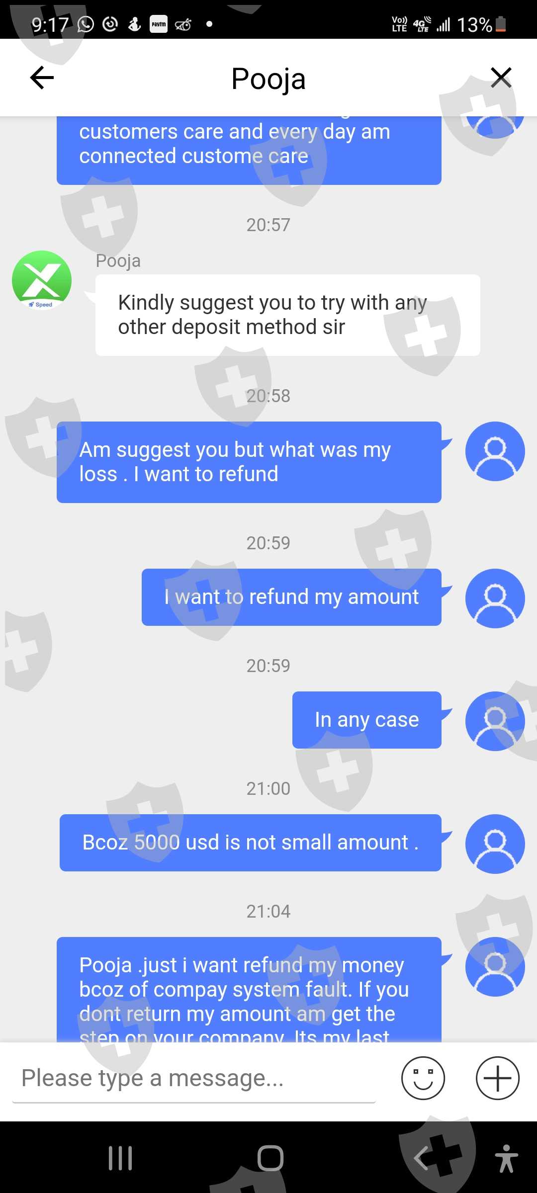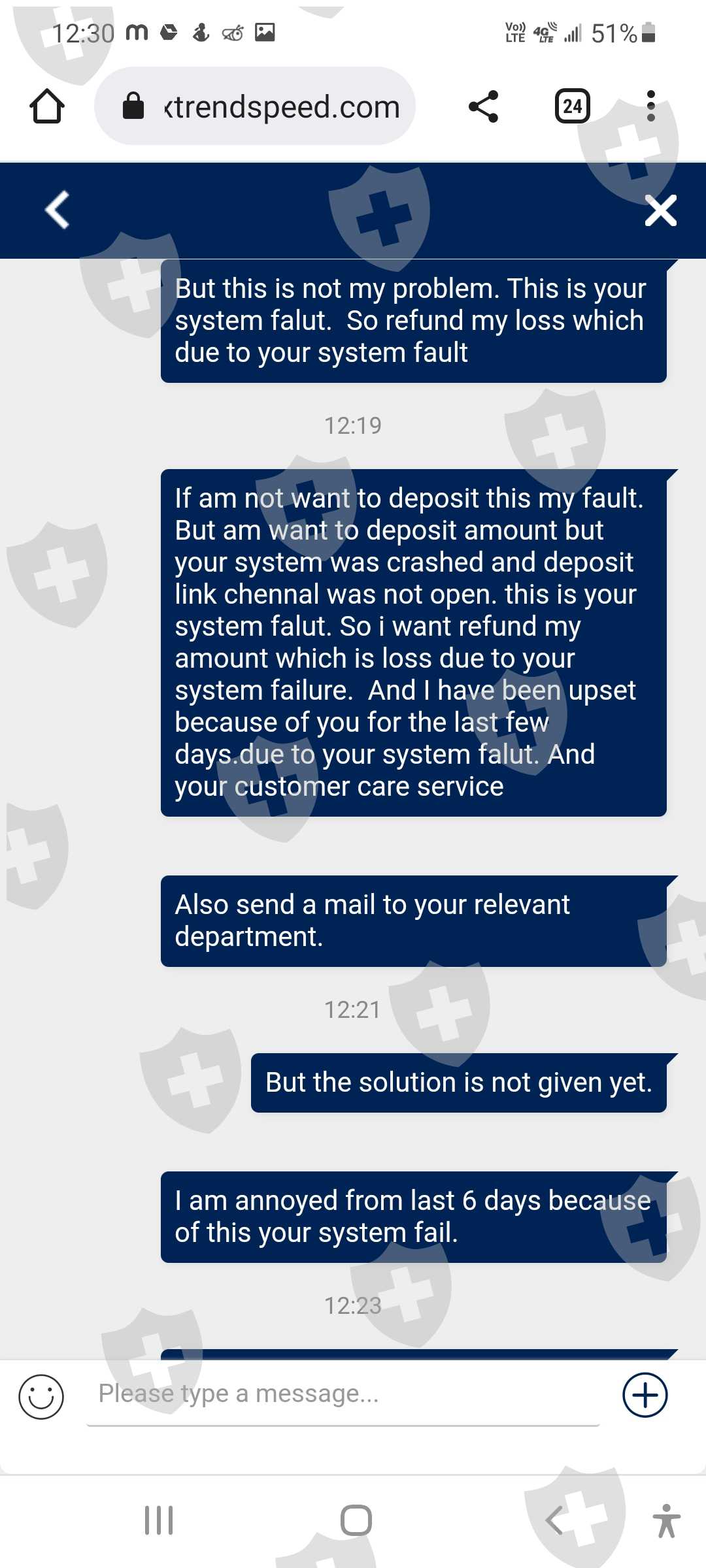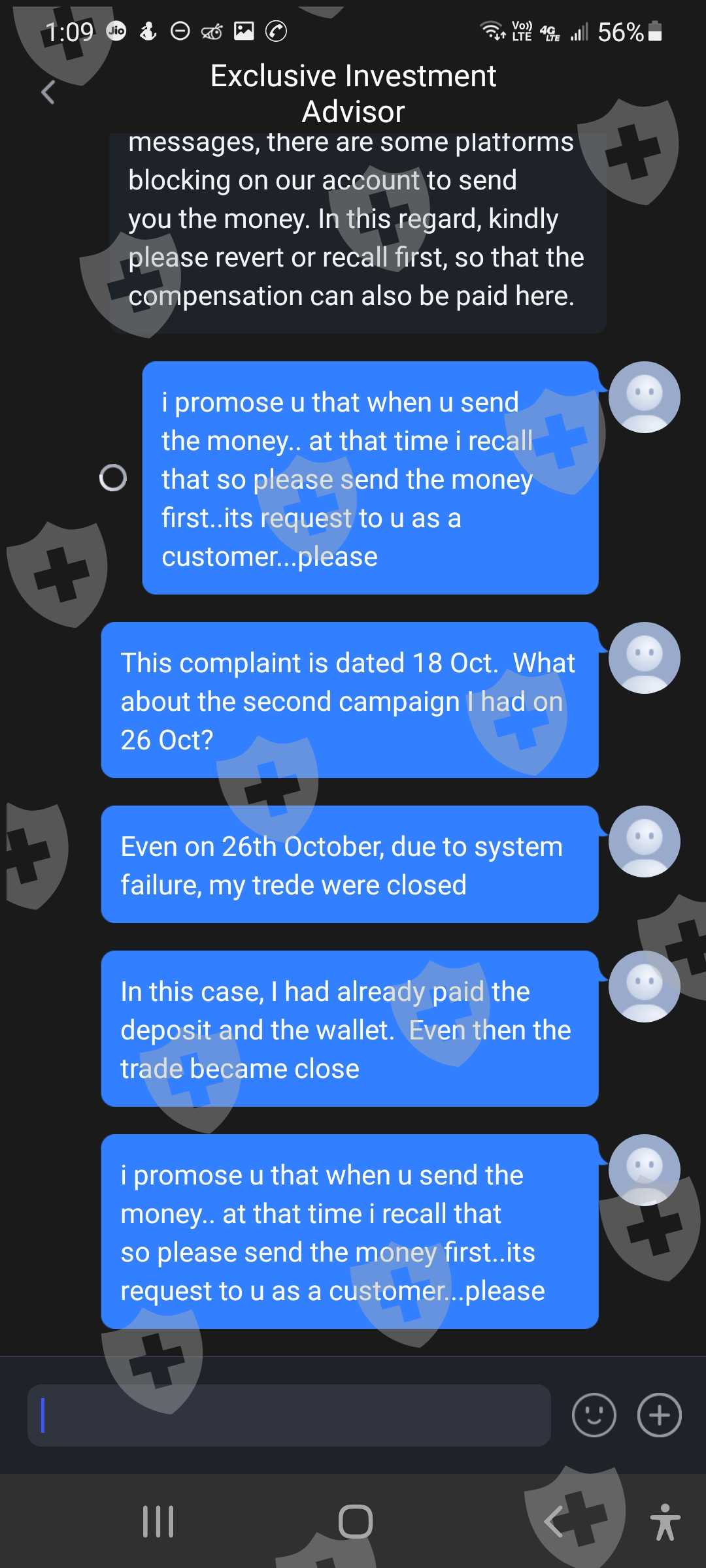 这是我的客户id 62301107。我叫Ritesh shah,我在10月18日的投诉尚未解决,10月26日我又面临了新的问题。由于系统故障。系统平仓了我2笔交易。这一次,为了保持交易的保证金平衡,我存入了存款。存款通道正常工作。即便如此,你们还没有关闭我的交易。骚扰客户是贵公司的政策。即使在今天,由于您的系统故障,我也看到了 1471 美元的损失。这是与客户一起玩的方式。 10 月 18 日,我损失了大约 5000 美元。由于您的系统故障,今天在 10 月 26 日损失了 1471 美元。由于您的系统故障,我想退还我的金额,我今天附上了短片。您的相关部门是否在处理我的投诉?他们没有时间回复客户这是公司的作弊方式吗?这家公司通过这个系统赚钱他们在客户marzinge leval低时关闭存款。客户想要存款,但他们没有通过他们的 xtrend 收入系统添加资金。他们对客户做空我有所有的证据。并上传听到。你想和客户服务谈谈。那些人会让我们等上7个小时。这家公司提供服务吗?这是骗子公司。不要相信他们