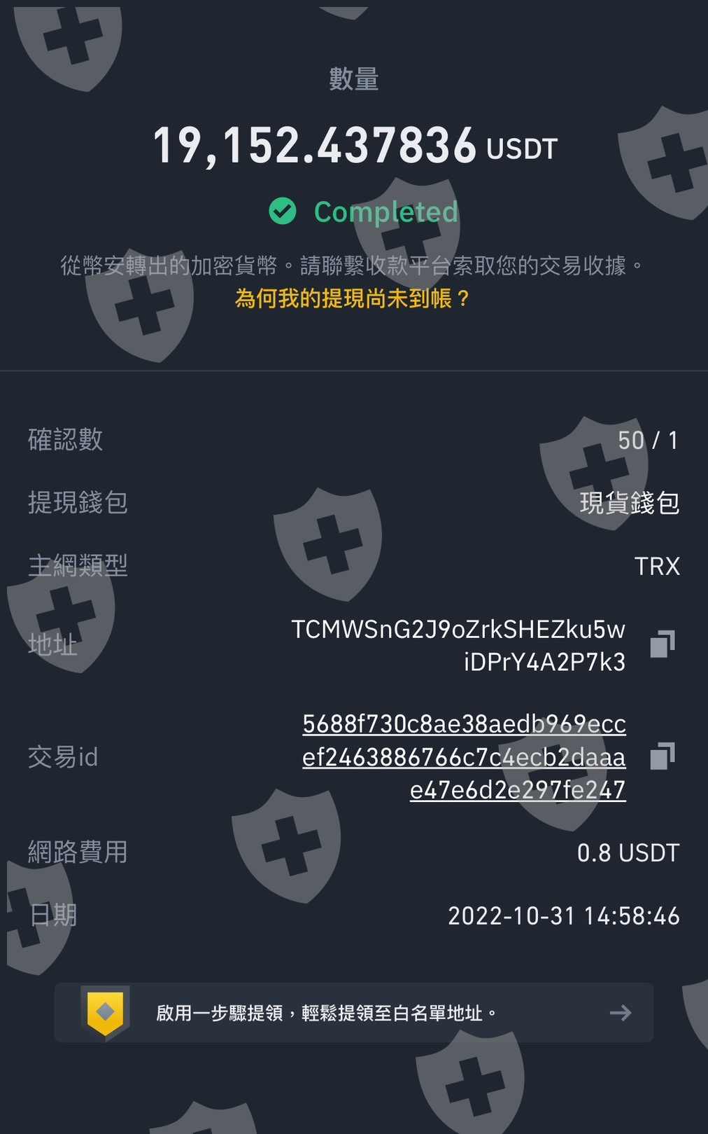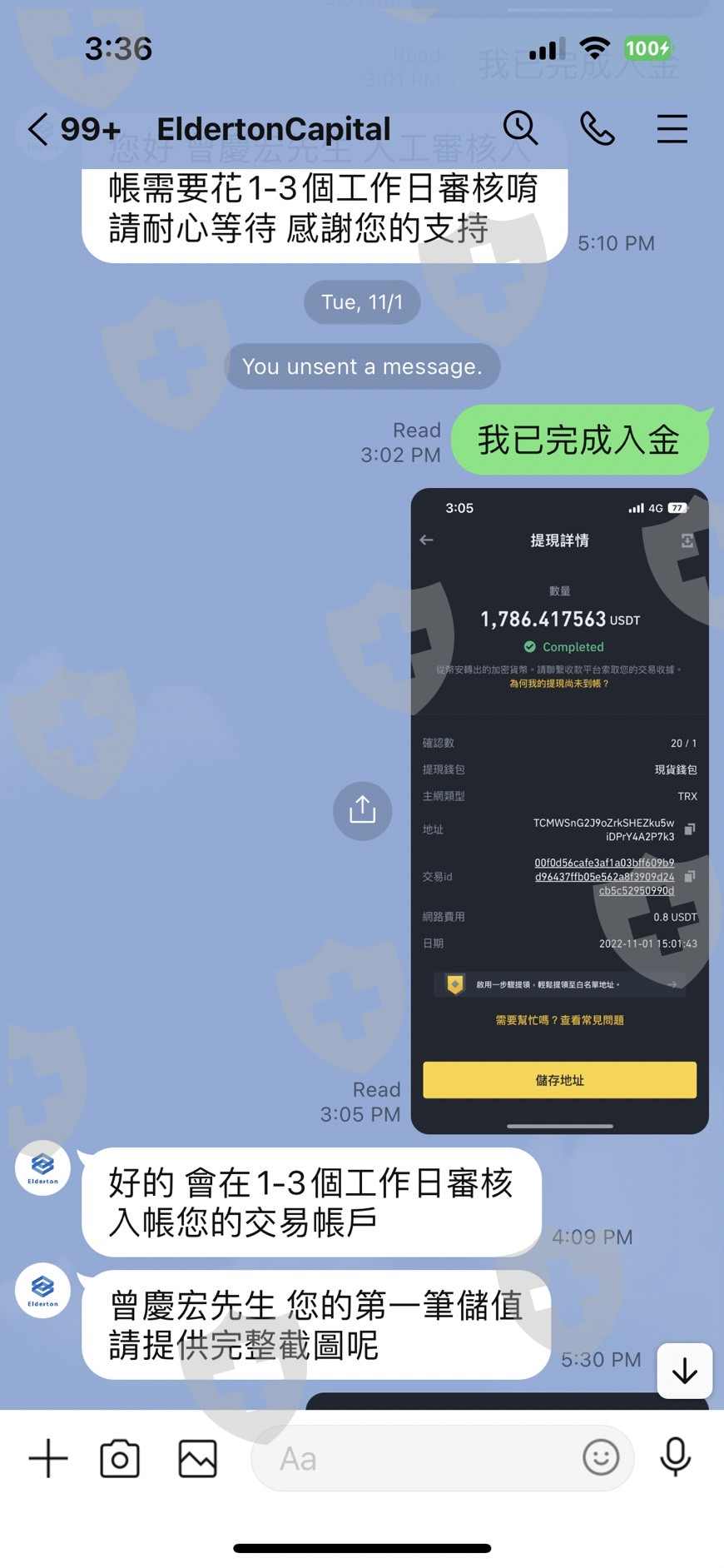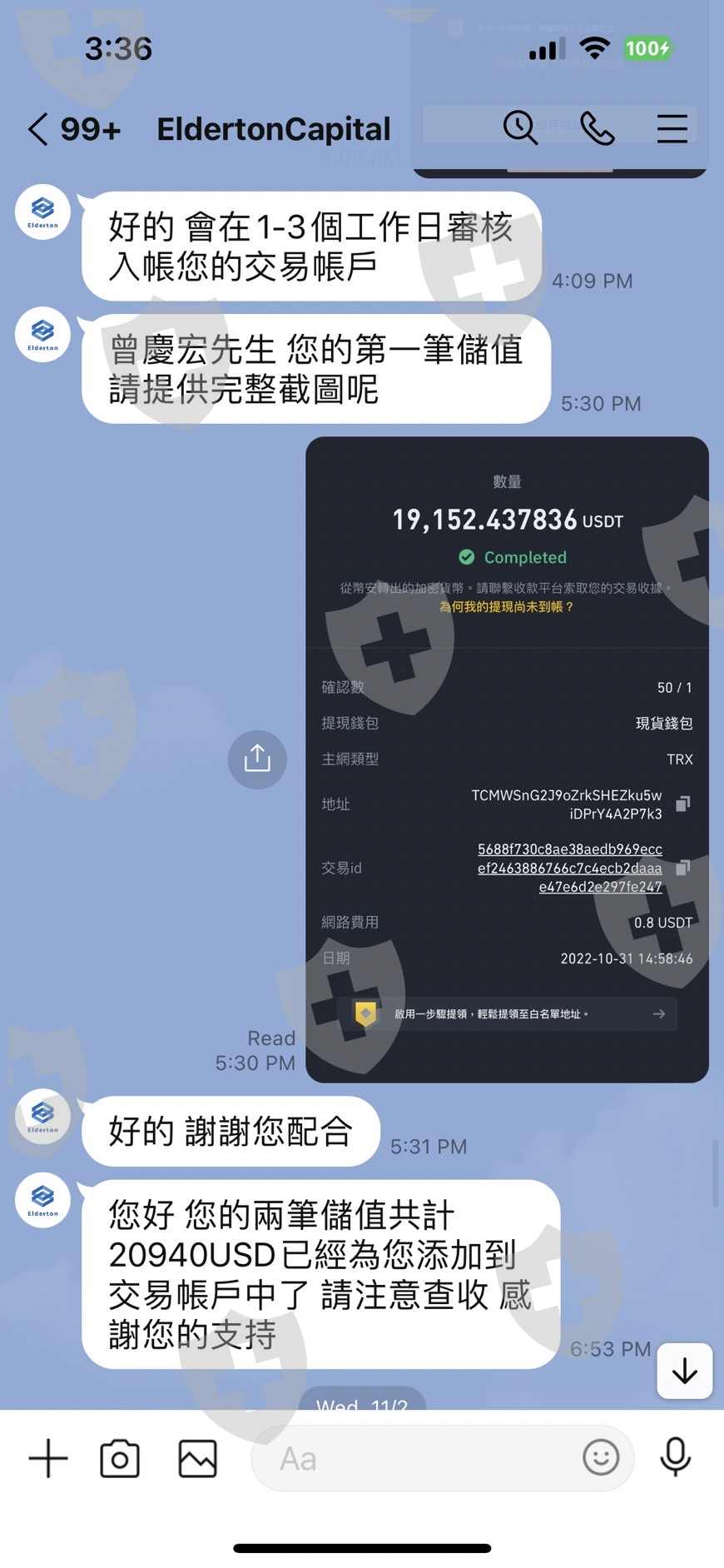 10月分被KangDa客服通知轉移至EldertonCapital,原KangDa交易資金也轉移到EldertonCapital,陸續再入金36906美金,本金共77218.43美金,後面操作獲利268651.52美金要求出金時,被凍結帳戶和要求繳納獲利3%稅金8059.5456美金至TRC20電子錢包地址