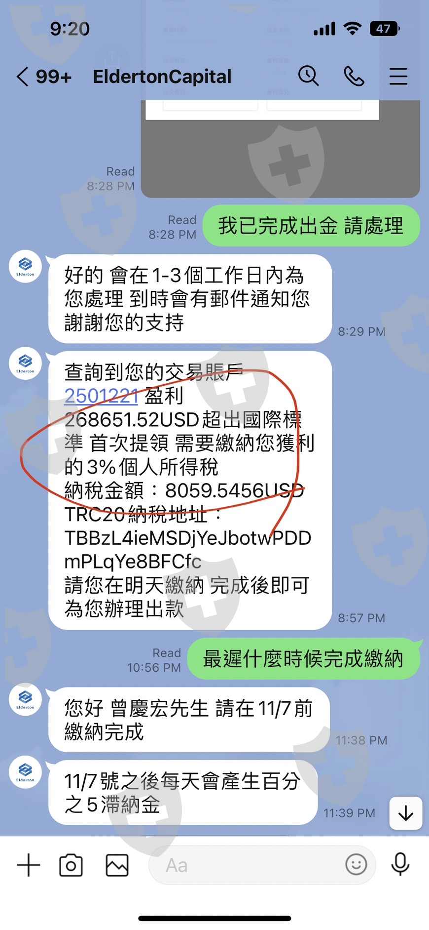 Elderton Capital黑平台獲利出金,凍結交易賬戶要求繳稅