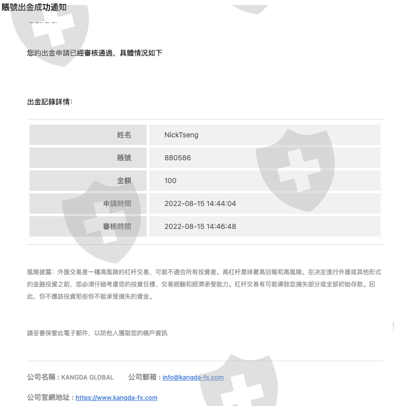 KangDa平台交易外匯,入金三筆總計37455,操作兩週獲利2857美金,出金一次100美金電子錢包出金順利到帳,九月5號平台維護升級10月三號平台通知轉移EldertonCapital,在新平台EldertonCapital操作獲利268651.52美金,出金10000美金時,凍結交易帳戶被要求繳納稅金獲利的3%至納稅地址