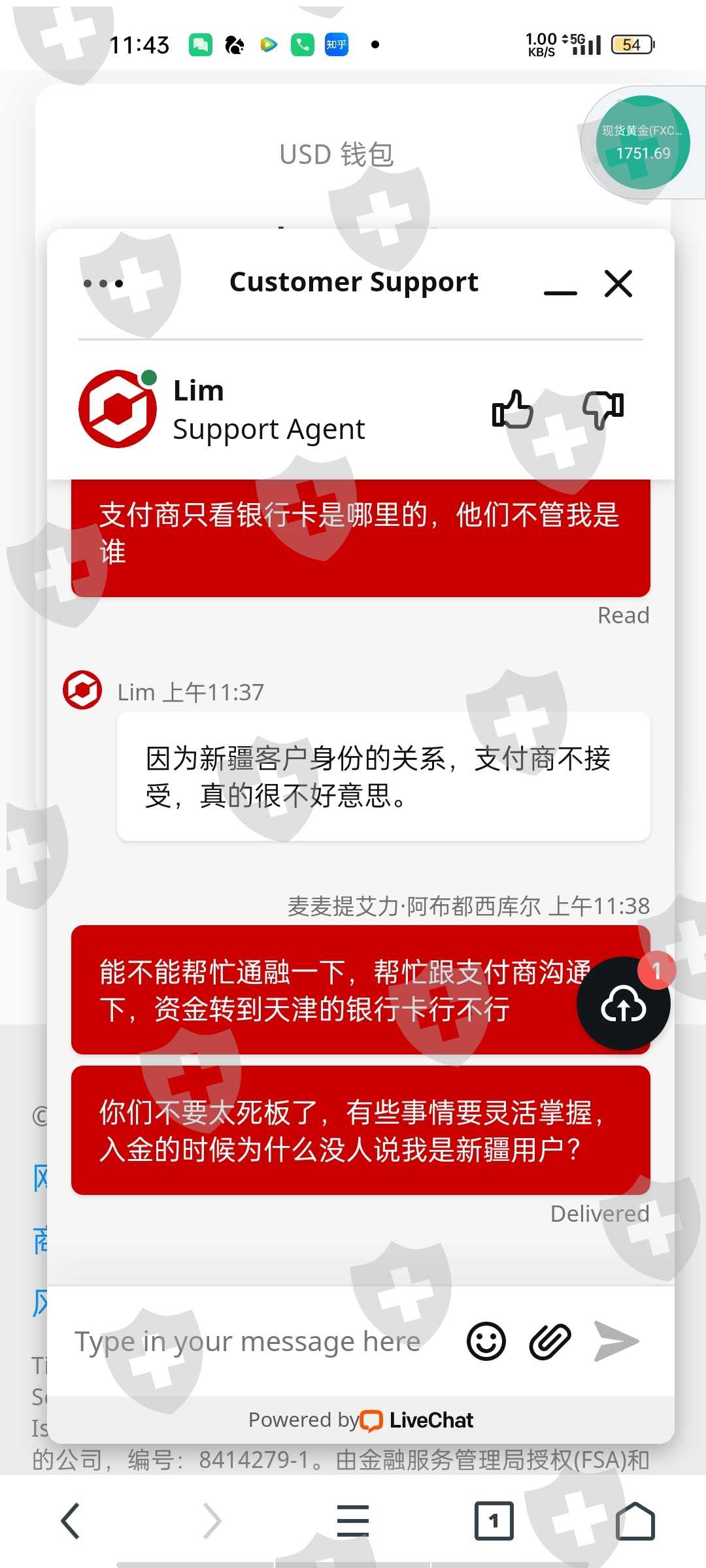 找了在线客服无数次了,说我是新疆客户,不能出金,但入金渠道很流畅,入金很快,没人说我新疆用户,出金却不行。 平台把责任推到支付商身上,把我折腾了2个多月。恳请帮忙解决一下,谢谢。
