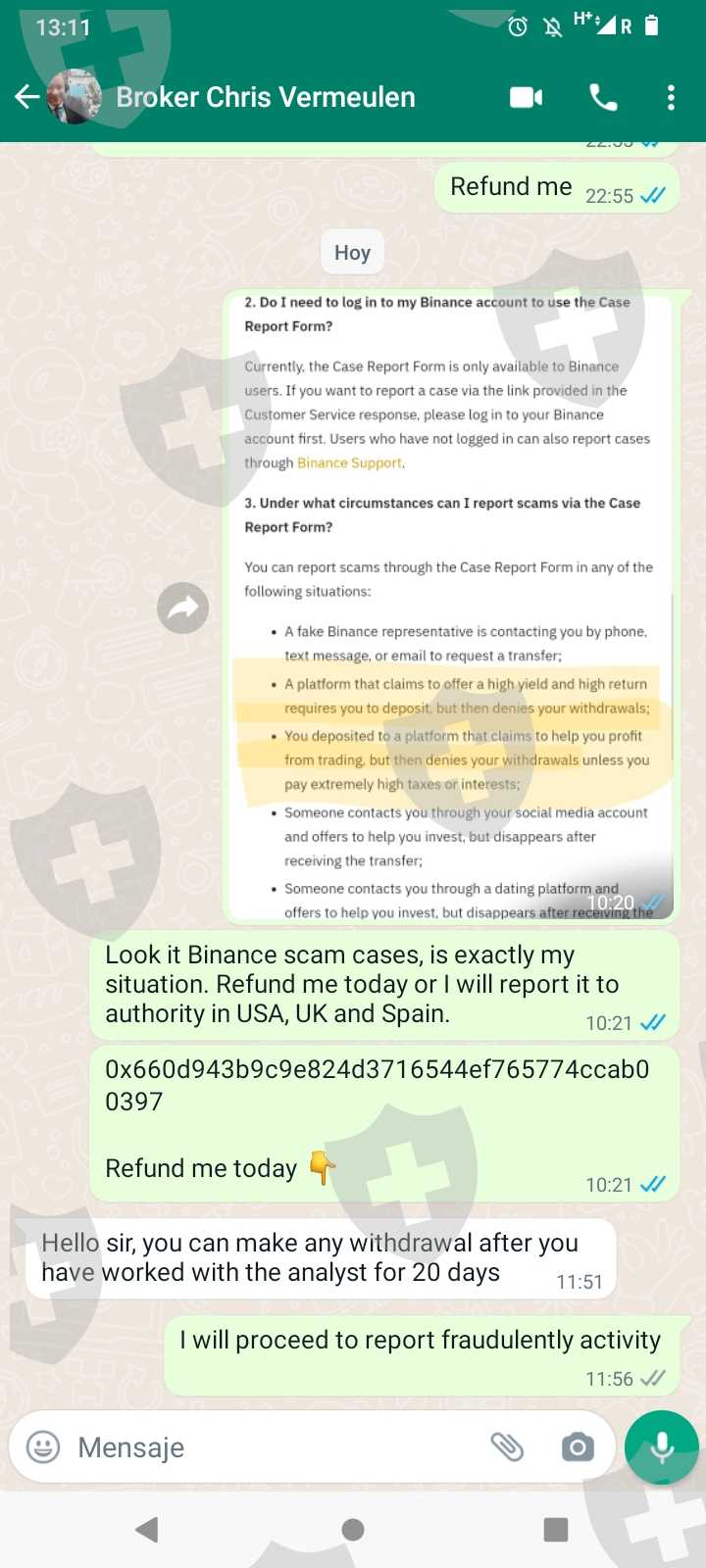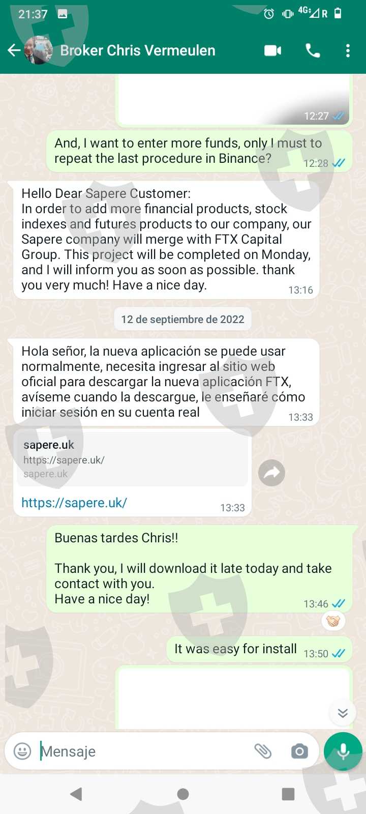 Eleanor Wilson(英国)和 Chris Vermeulen(美国)。这些是向您承诺巨额利润的骗子的名字。我相信他们,因为他们有使用许可证和一个看起来很严肃的平台。我从 1k 欧元开始,通过 binance 到 FTX Capital Group我通过交易看到了增长,并要求提款进行测试,没问题。然后我投资了 30k 并承诺聘请私人分析师(布鲁斯,来自英国)以免冒险交易,一切进展顺利,但在要求提款时,他们要求我用额外的存款纳税或者我无法撤回。我不知道我被骗了,现在我正在谴责当局追回我的资金。我不知道这些身份是否真实,但她是因为我们有时会通过视频通话。要非常小心,它们会把你引向一个严重的问题。以前他们是 sapere 财富管理英国公司,使用 mivolis prime 运营,然后改为 cang limited。然后据说买了它们 FTX Capital Group.我希望找到一种方法从这些小偷那里拿回我的钱