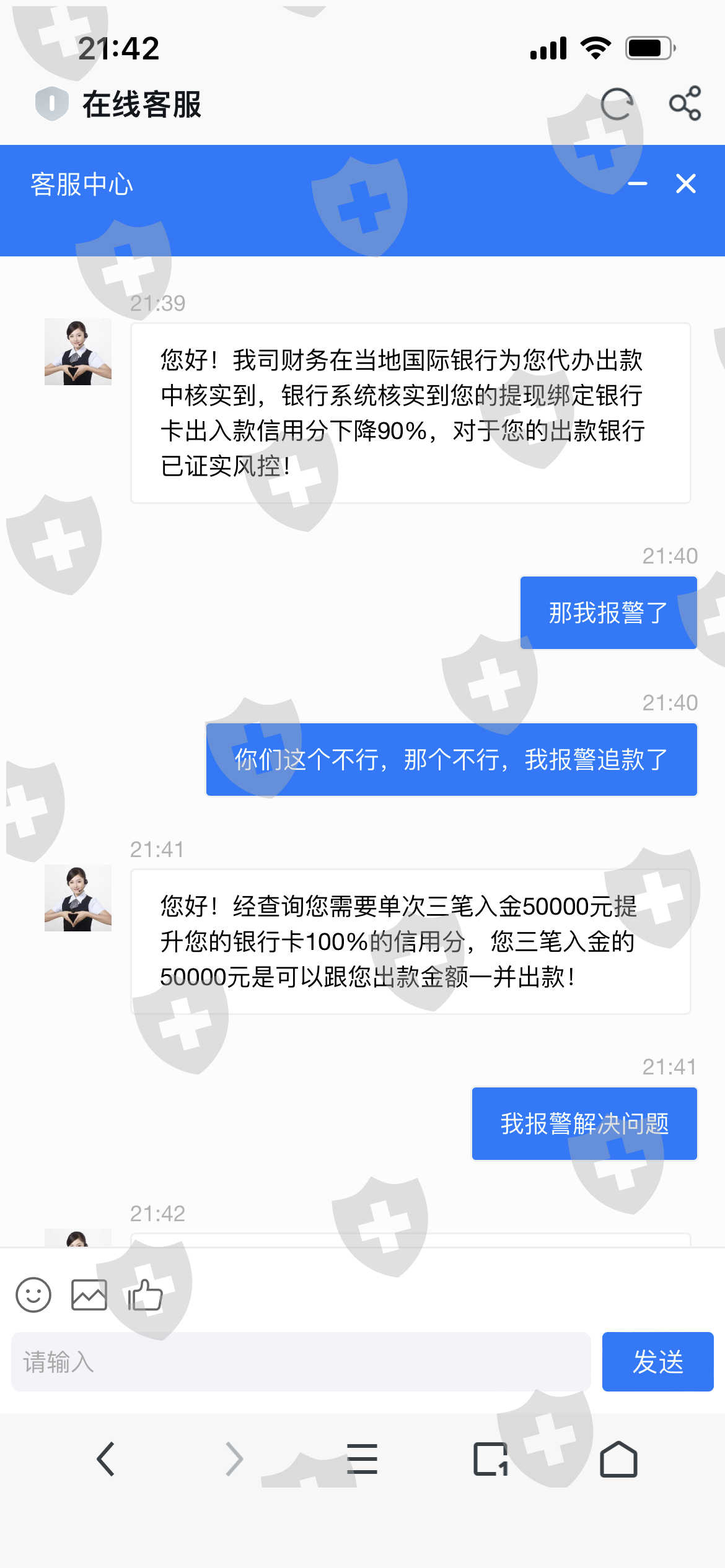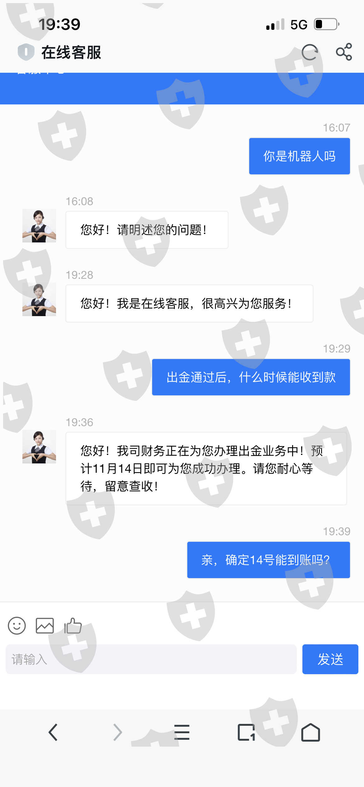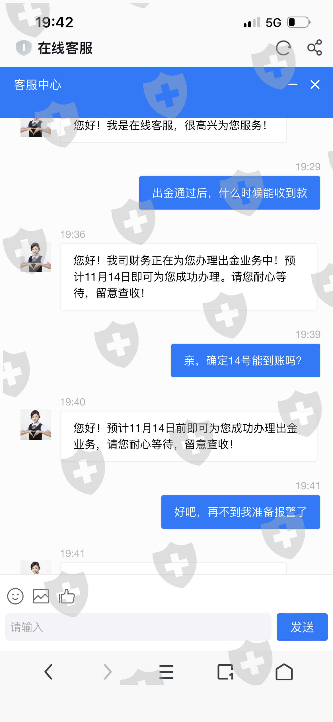 从11月5日开始财务那边审核通过了,我就问具体到账时间,被告之说要晋级国际通道出金,后又补27万入金,11月8日再次审核通过,问什么时候到账,3天后客服回复说14号前到账的,过一天后面再确认,说我银行卡信用分不够又要交15万才出金。而且每次都在敷衍我,拖时间,就是让我不停交钱