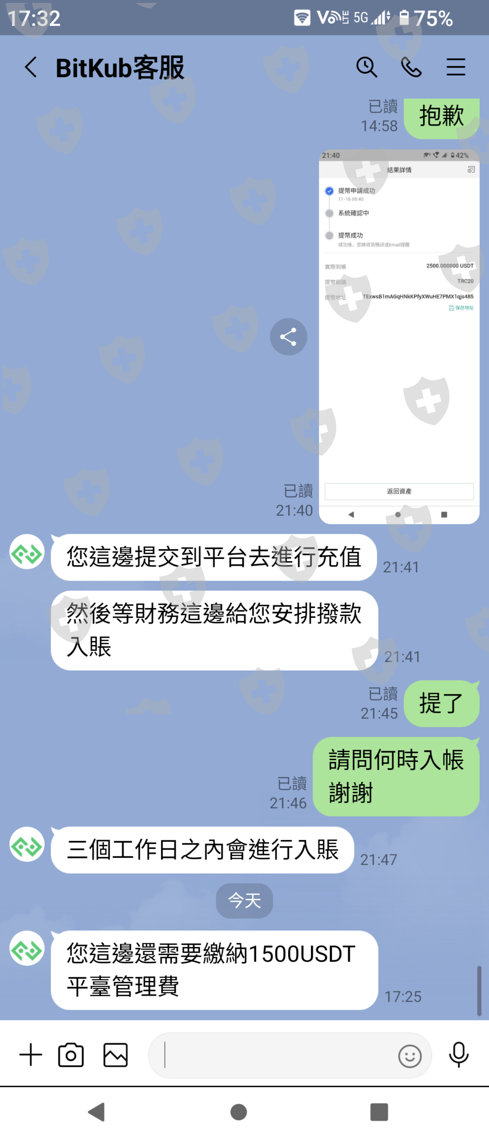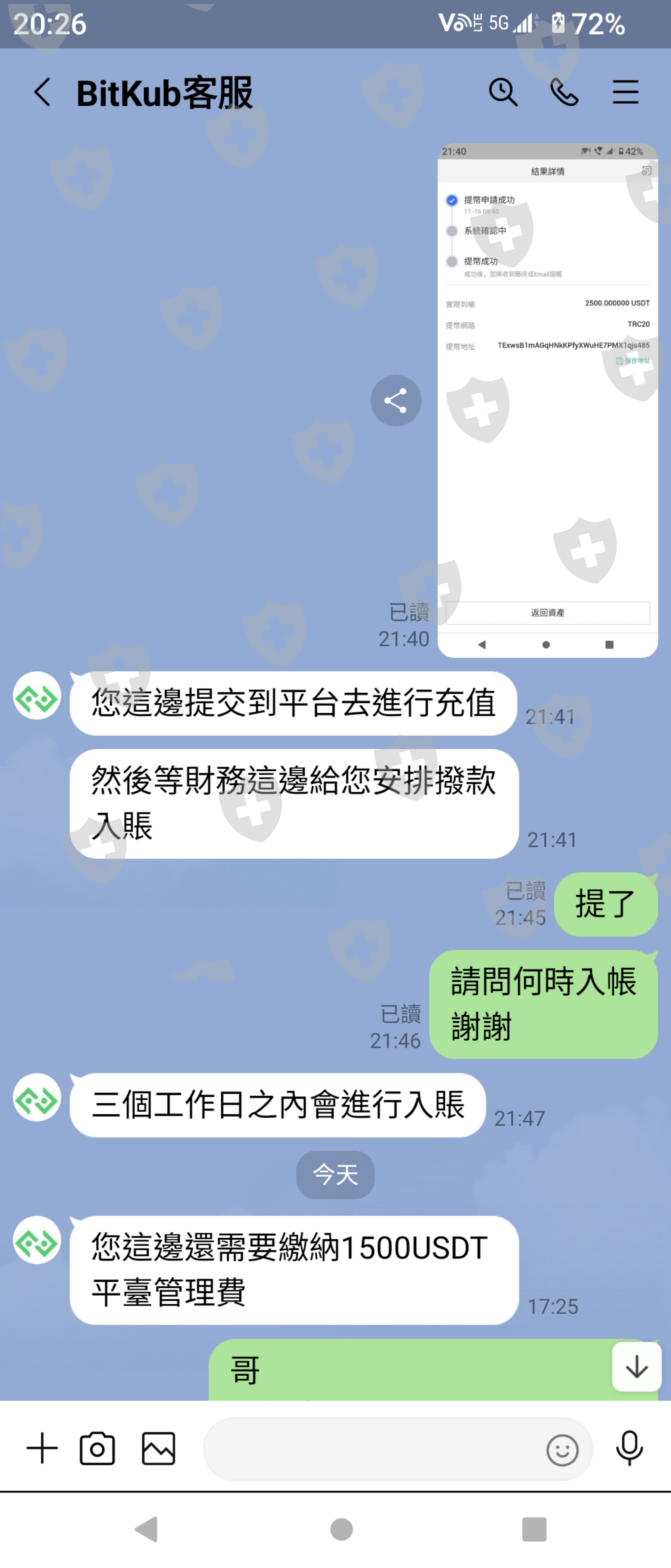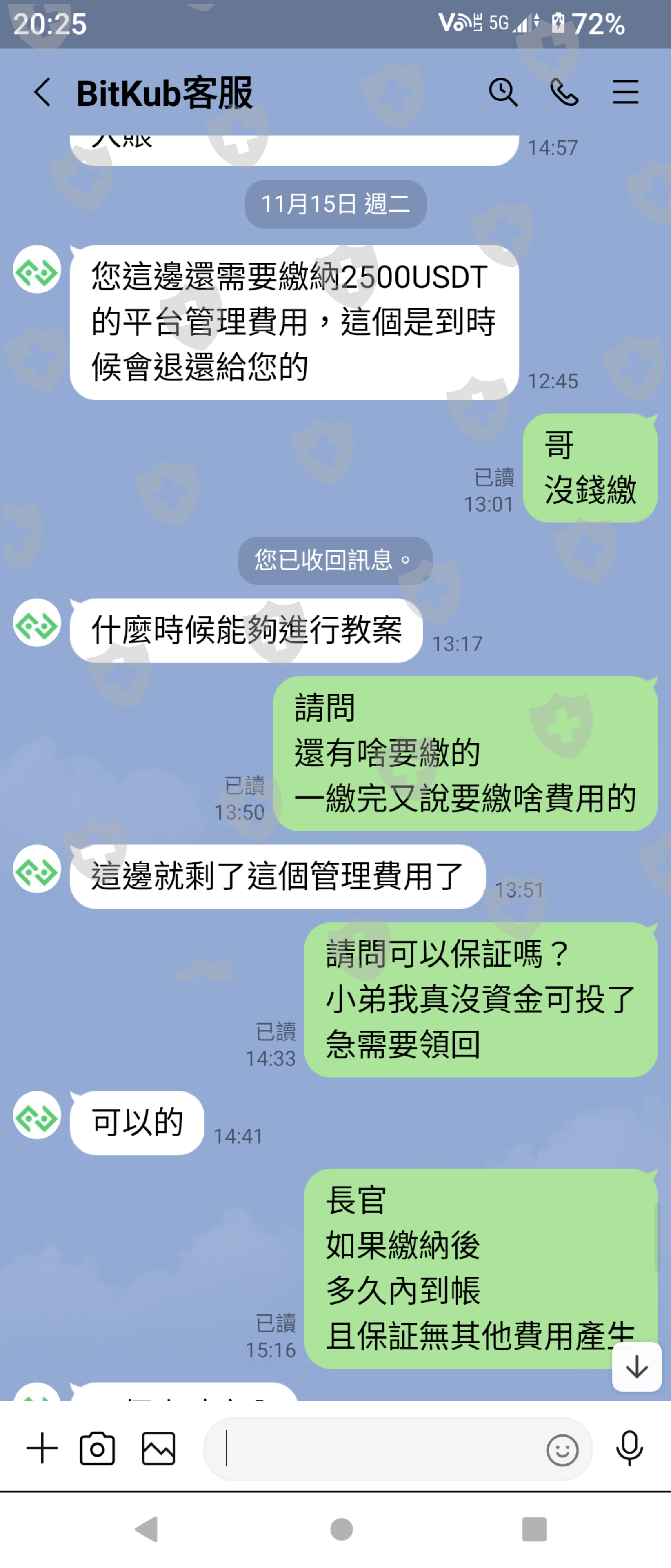 剛剛繳完2500ustd給 bitkub平台客服且詢問過客服有無其他費用客服保証沒有3天內保証撥款今天2022/11/18又要求繳納平台管理費1500usdt一直不出金請求協助已影響生活