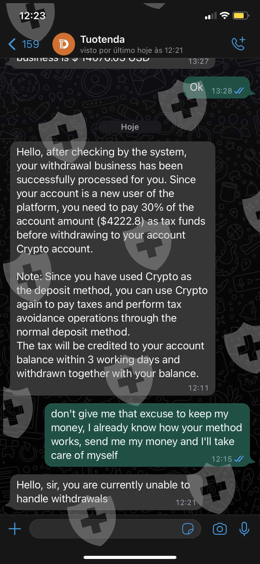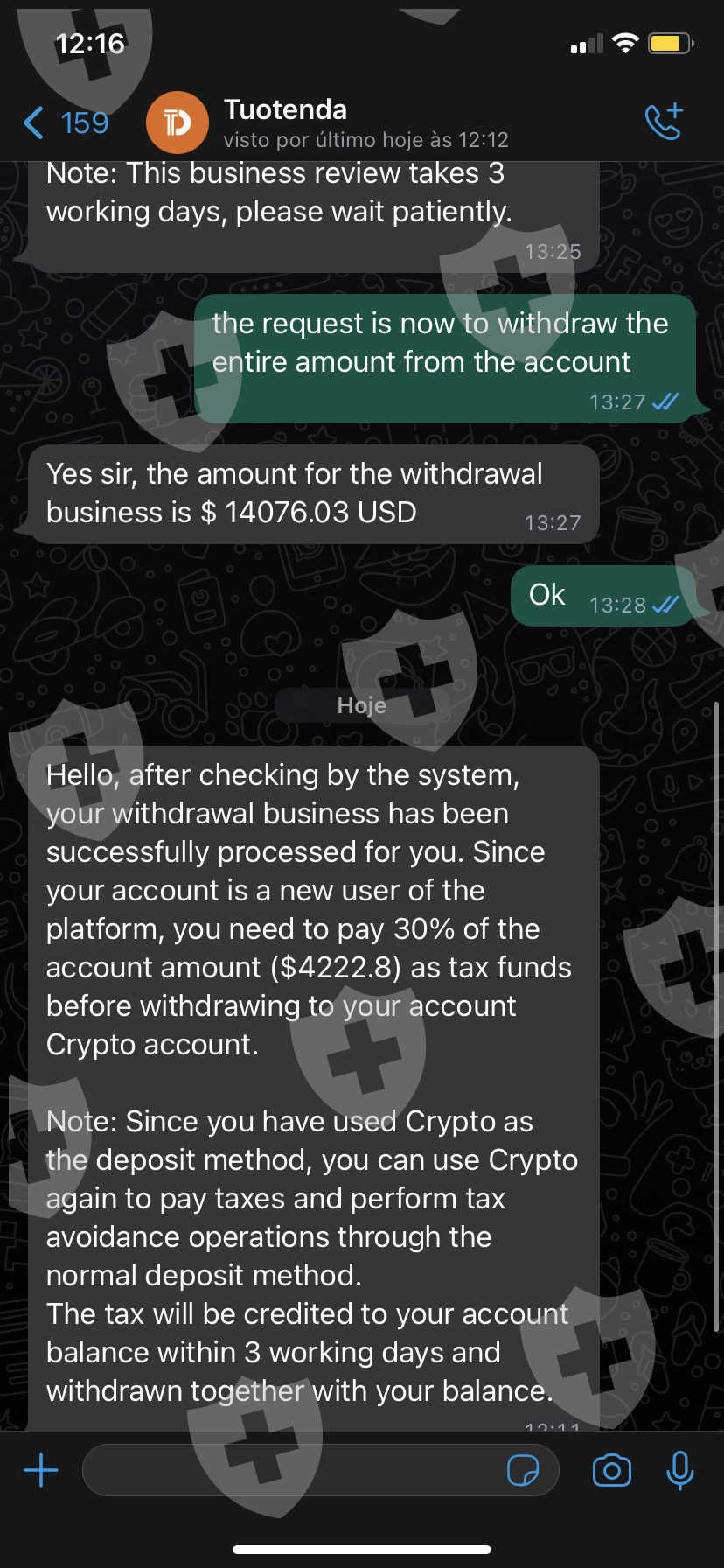 fiz o pedido de saque, mas estão pedindo para que eu deposite mais 30% do valor na conta para poder sacar o dinheiro, provavelmente seja um golpe