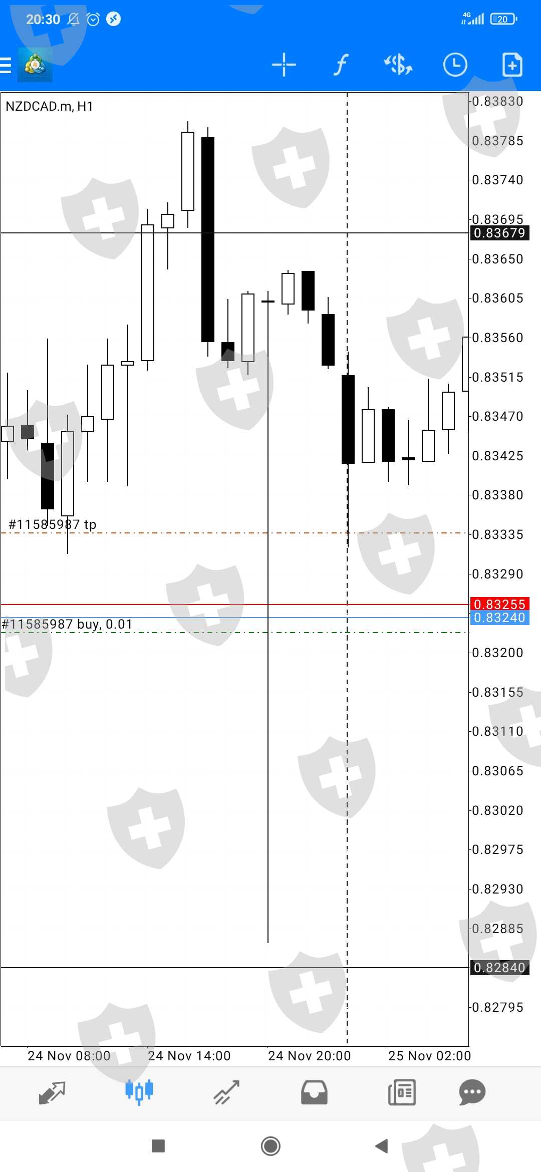 突然交易在 20:00 mt4 服务器自行关闭,价格为 0.83679,尽管当时的价格没有达到 0.83679 的价格,好吧也许那个时候点差扩大了,但我从来没有想关闭交易,而且我当时试着查了下mt4的journal没有平仓的交易记录,特别可惜 MIFX是一个大的合法经纪人,我试着比较图表 MIFX使用 MT5 演示版的图表,NZDCAD 货币对在 22 年 11 月 24 日 20:00 有很大不同
