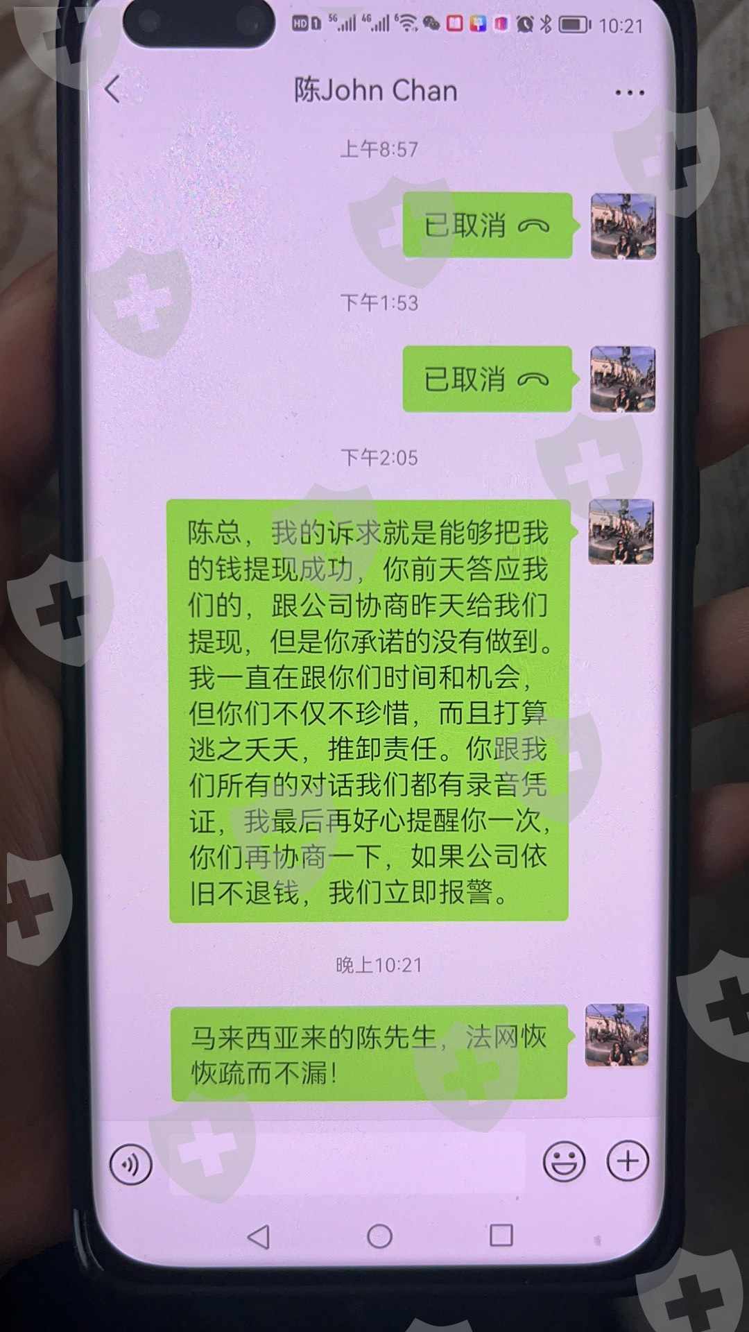 马磊、潘、陈承诺资金安全,可以随时提现。后本人申请提现,资金均不能提现到账,且马磊、潘、陈均以各种理由搪塞欺骗。马垒、潘、陈系同一公司合谋诈骗行为,经多次协商催要投入资金无果(有通话录音全程记录过程),马,潘,陈(系马来西亚籍华人,护A55543807),陈一直说自己是新加坡人,均以各种借口拒不返还。此三人的诈骗行为已经触犯法律,构成诈骗罪。
