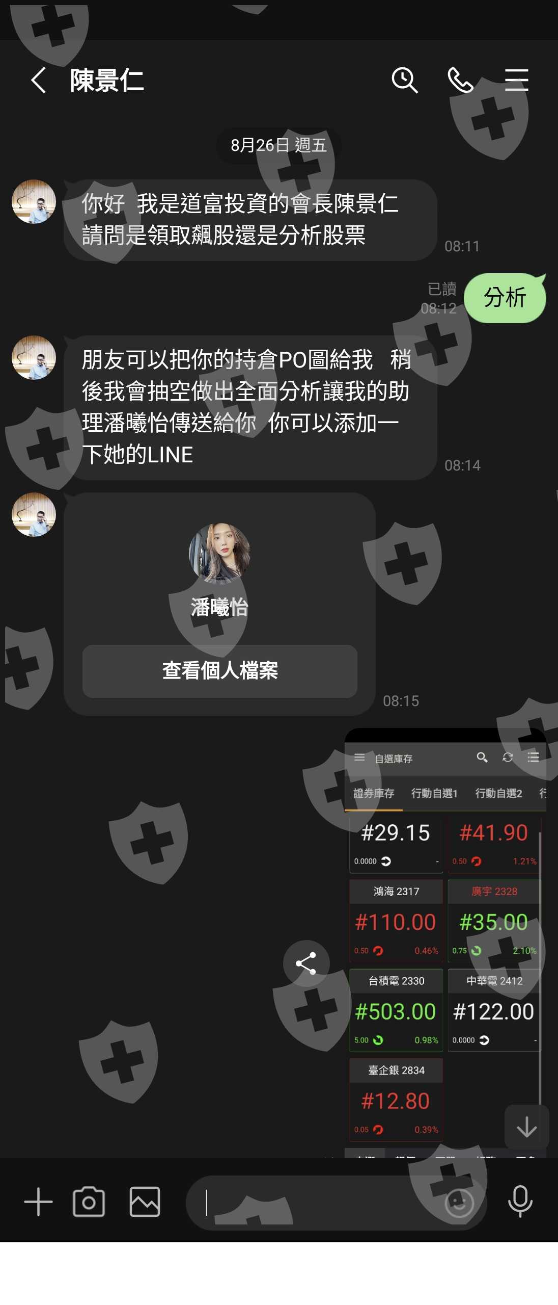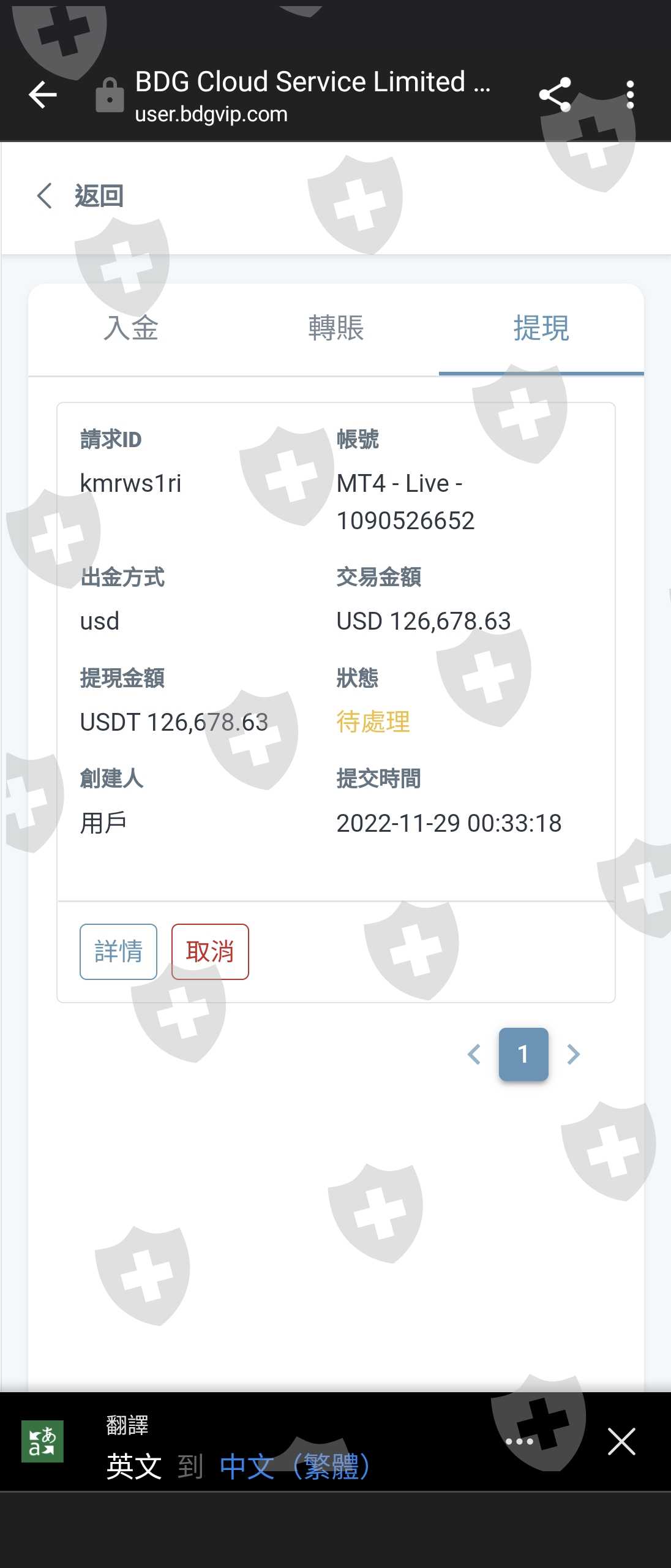 一個月前(2022/11月初),透過line自稱「道富環球」開戶入金,期間跟隨陳景仁及張芸嘉線上操作,獲利率近100%,至後期便交由助理潘曦怡以line訊息下達指令操作,獲利率亦近100%。為期不到一個月,11/28助理潘曦怡突然通知月底結算,須繳獲利分成44,500_USD,否則將不能提領平台裡的資金...此刻方察覺陷入詐騙手法!再繳分成就是「肉包子打狗」。所以,試著提領時,都顯示「待處理」,直至今日,提領網頁已無法登入!操作平台也顯示「帳戶無效」