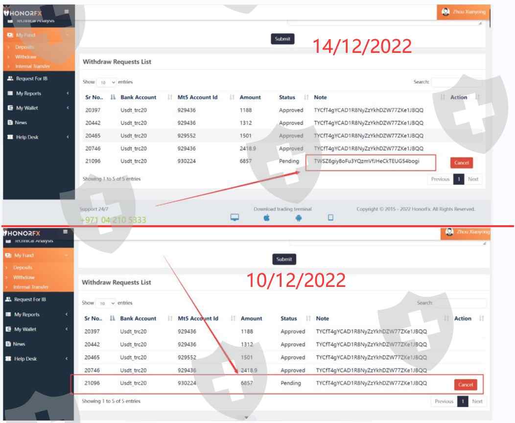 我在Honor有三个交易账户:929436,929552,930224,入金$14894,之前提款$6419,在10/12/2022提款$6857到14/10/2022一直未到账,14突然发现在CRM申请的提款地址突然被平台私自篡改,估计是要跑路了