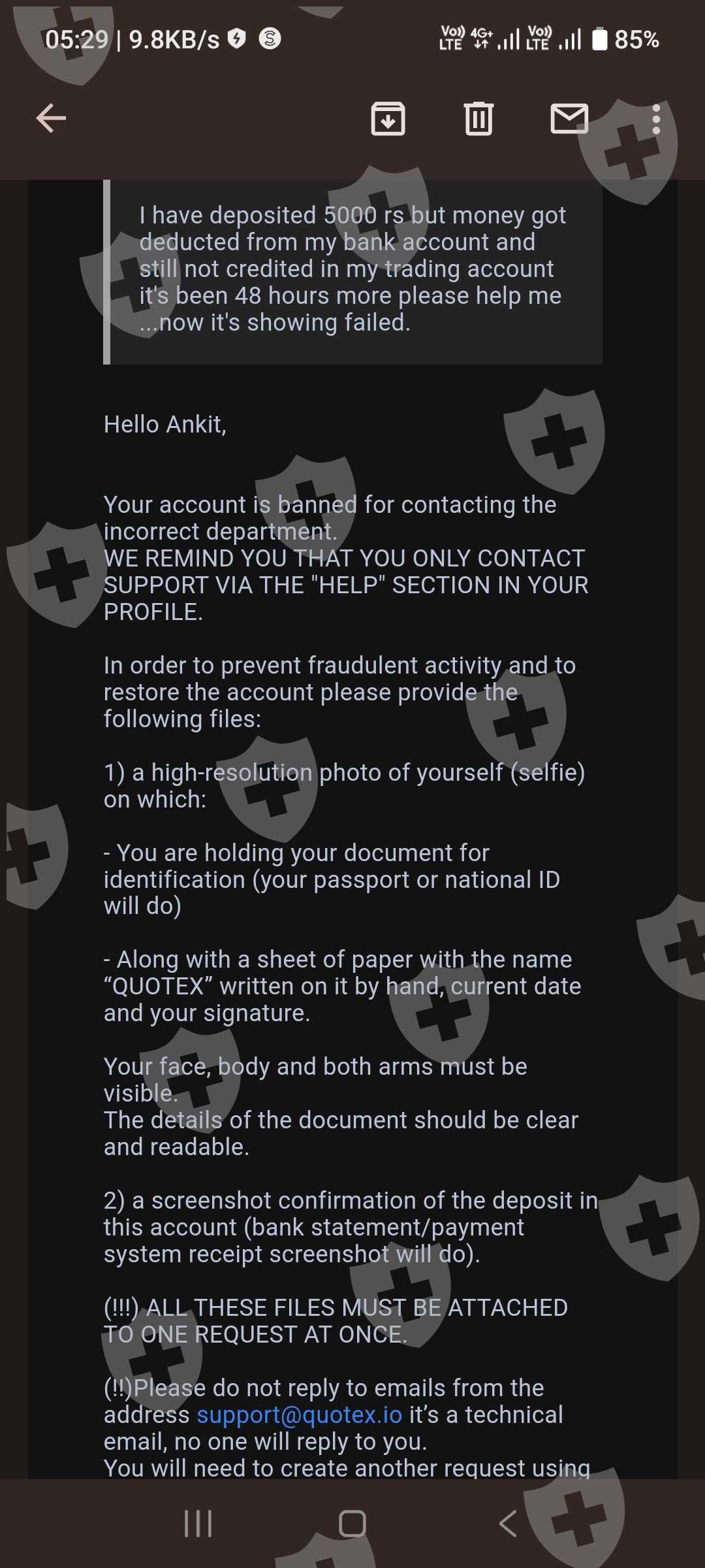 On date 16 dec i deposits 5000 inr through UPI on my quotex trading account but money got deducted from my bank account and didn't get credited in my trading account...i contacted support team but they didn't respond i writes them emails many times but no response at all but today they emailed me that my account has been banned because I contacted them...no help at all scam broker... please help me