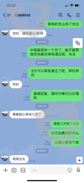 8月份申请提现5.7万多美金再加上已到期限的锁仓金额共达10万美金以上,当时客服说网络拥堵耐心等待几天,现在连交易网页也看不到了客服也消失了。明显的欺诈行为。天眼可以帮我赎回投在CoinFirst里的所有资金吗?I did the expenditures application of 5, 70,000 usd in August. It becomes 100,000 usd when I add capital. I cannot access the trading site either, and the communication situation that died out with the person in charge continues with continuing being said that I wait for a few days as I am crowded from the person in charge at the time. I think that it is fraud. I hope that you can get back the fund which you invested in CoinFirst eagerly8月に5,7万usdの出金申請をしました。元本を加算すると10万usdになります。当時の担当者からは込み合っているので数日待ってくださいと言われ続けたまま、取引サイトにもアクセスできないし担当者との連絡もと絶えた状況が続いています。詐欺だと思っています。CoinFirstに投資した資金を取り返していただけることを切に願っています