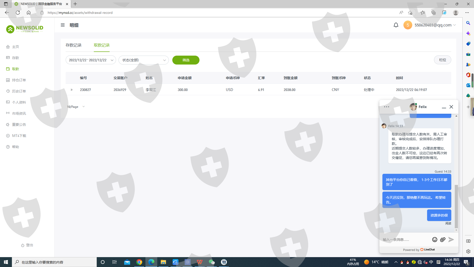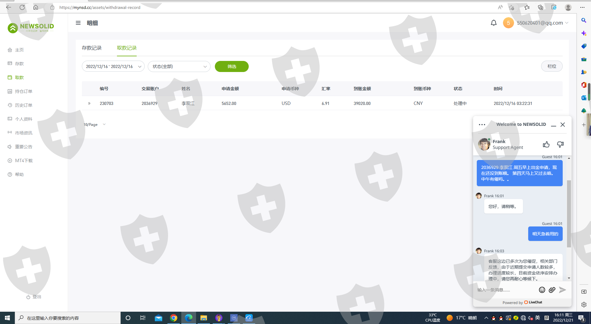 12.16日申请出金,12.23日还没到账。一直显示正在处理。也没进一步的解决方案。一直说在排队。正常的一天就出的。暂时涉及金额41058元。