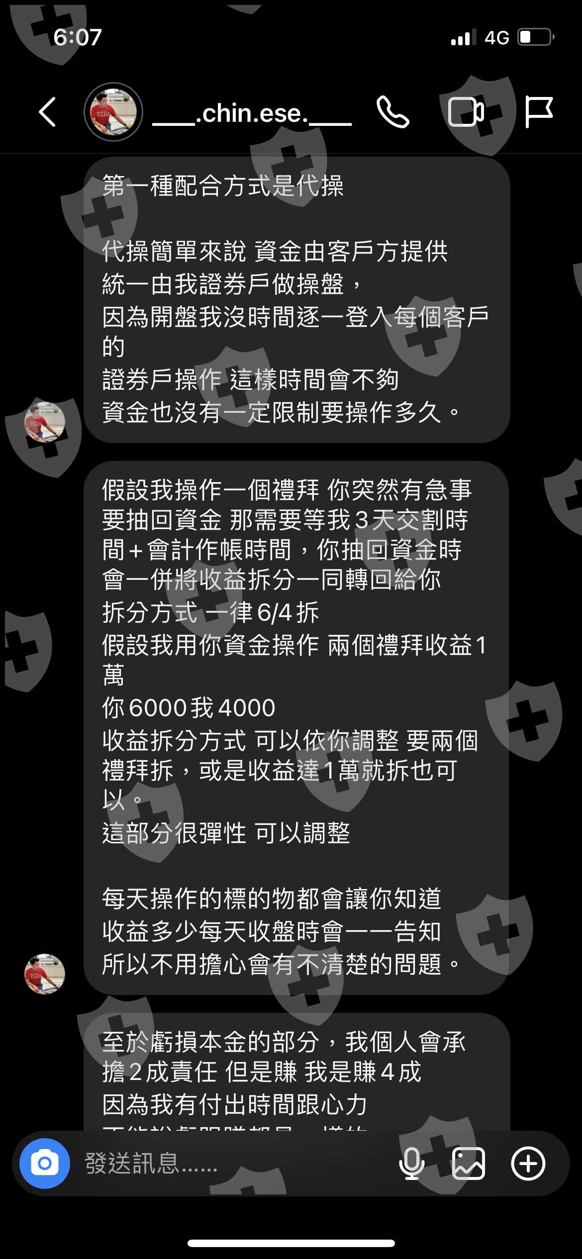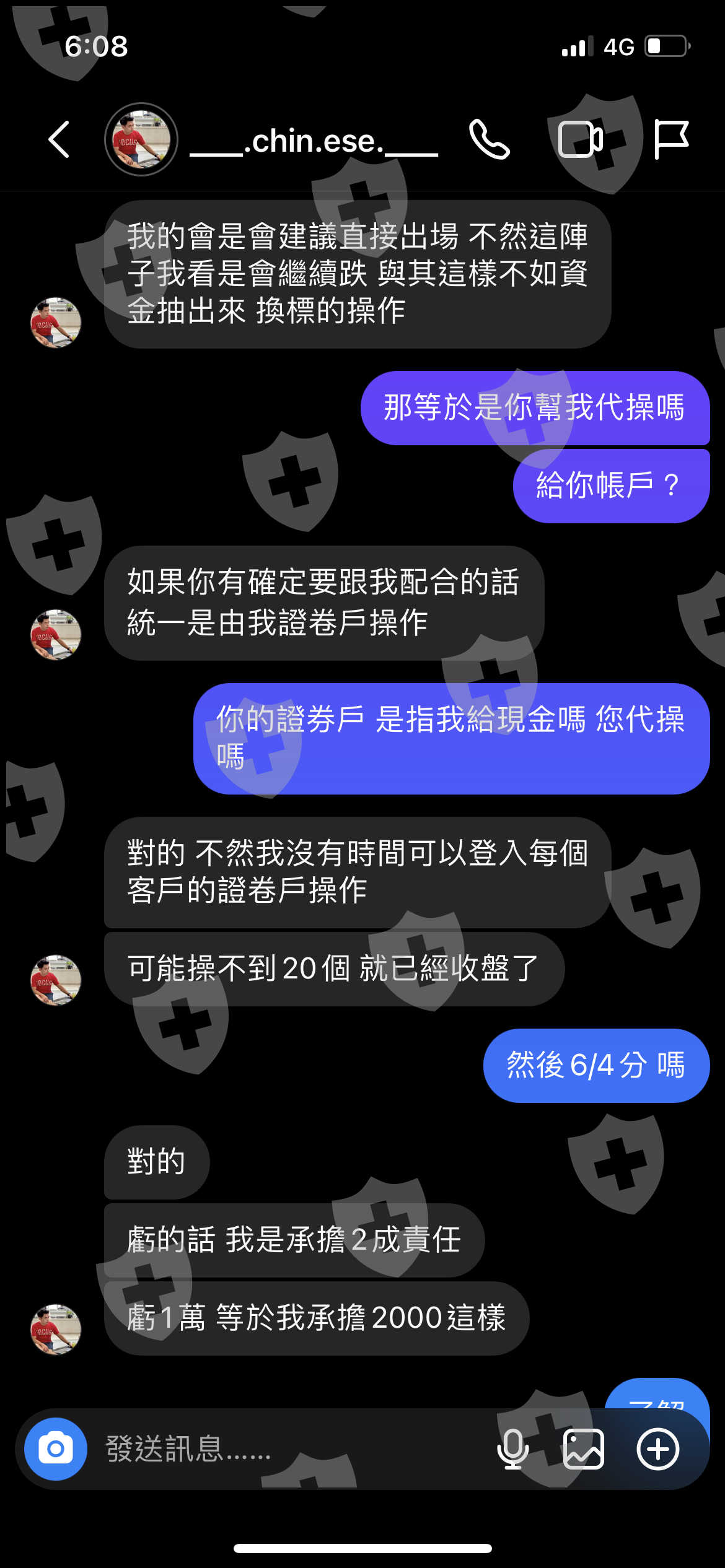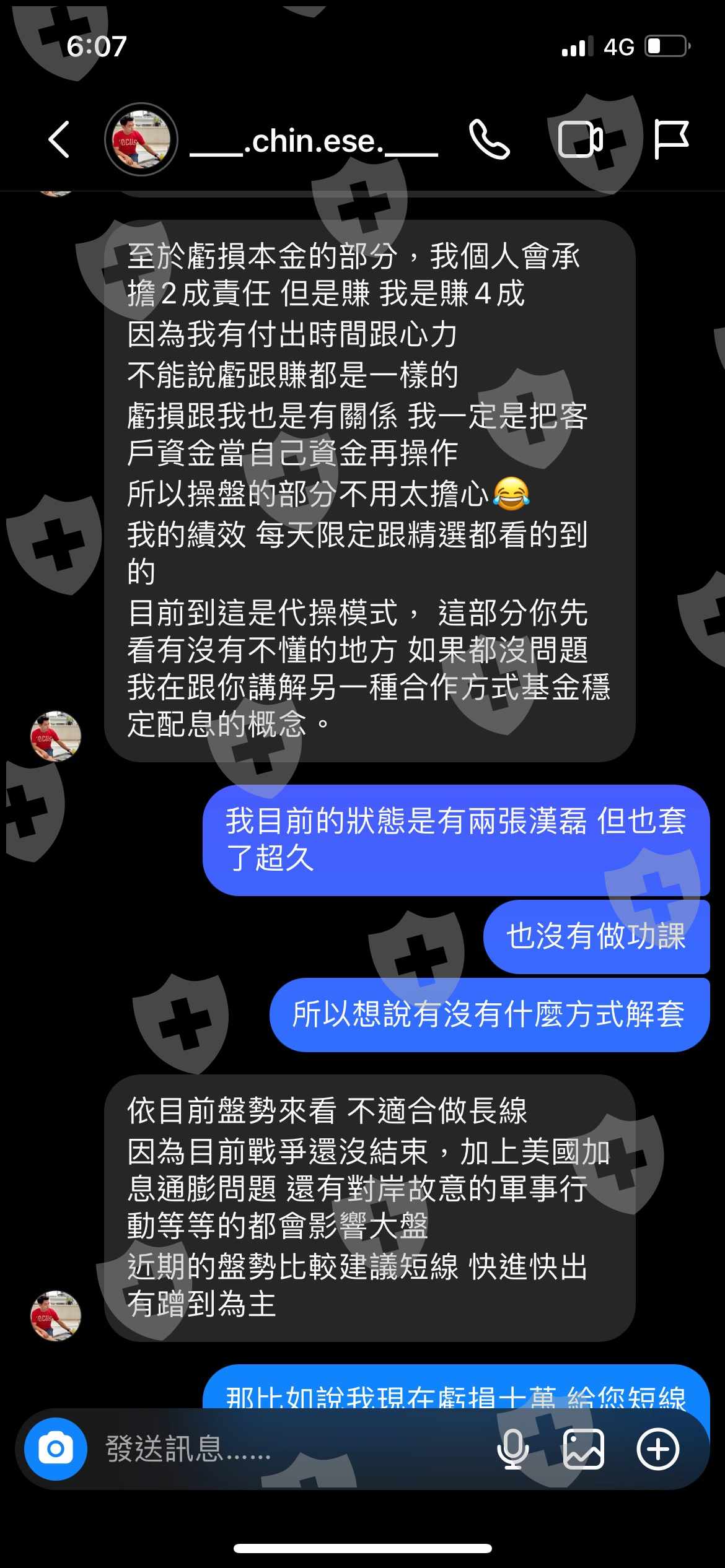 在ig 認識一名男子 標榜代操台股 經了解後 他說可以每個月會每週拆帳 6/4分潤一開始每天都回覆給我損益 後來將錢轉入交易所 要出金時 用各種理由都無法出金問那名男子 他卻說別人可以 又說帳戶凍結前後匯了五十萬左右 但現在仍無下落然後這個人還是在ig line 持續很活躍