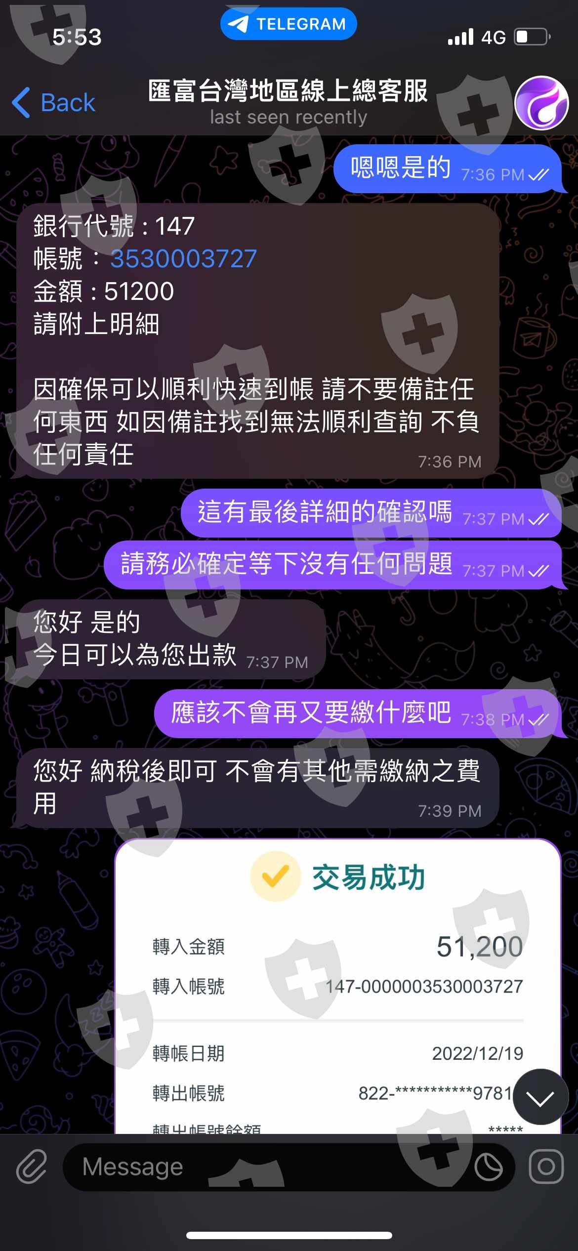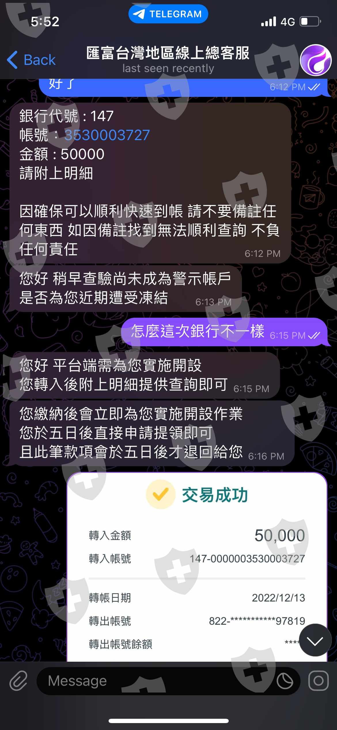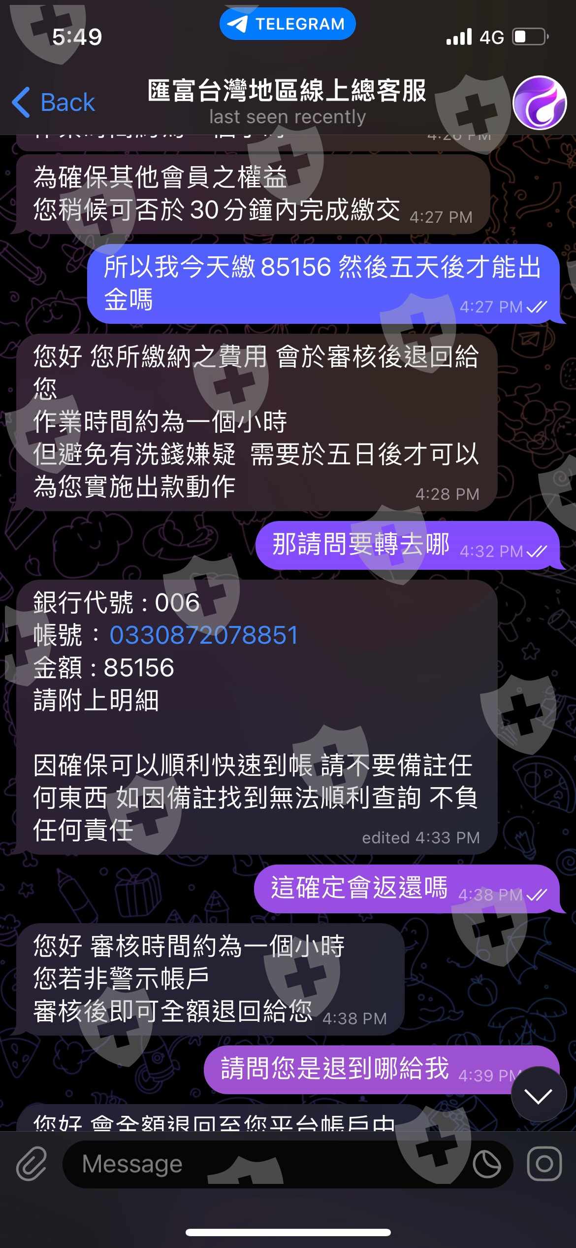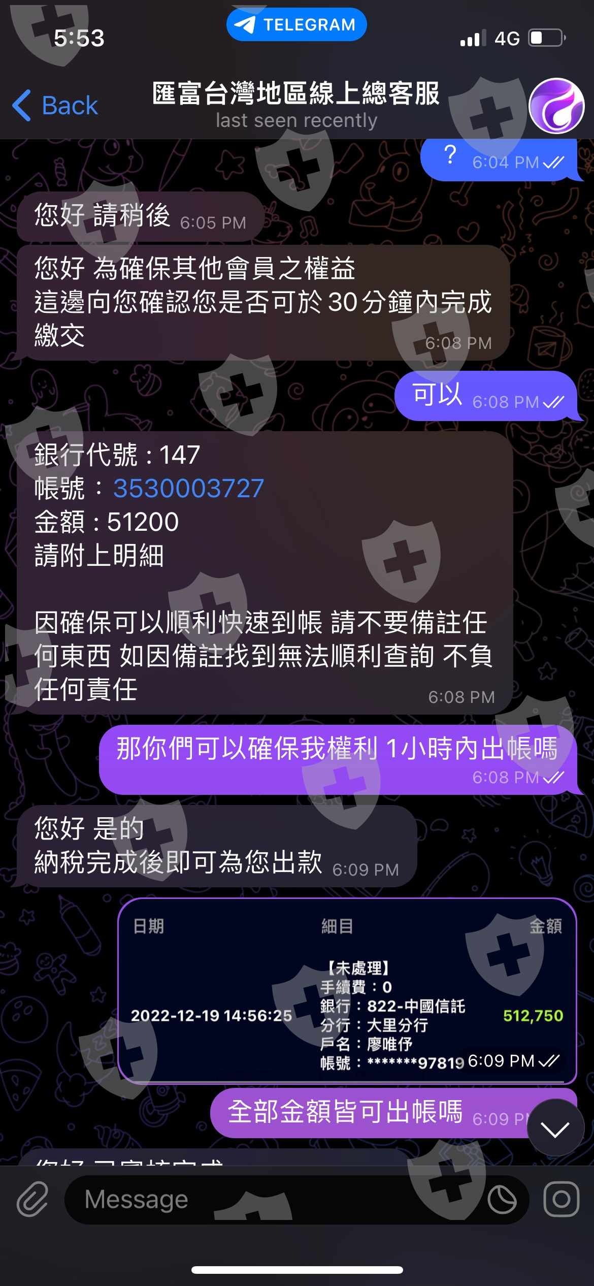 在ig 認識一名男子 標榜代操台股 經了解後 他說可以每個月會每週拆帳 6/4分潤一開始每天都回覆給我損益 後來將錢轉入交易所 要出金時 用各種理由都無法出金問那名男子 他卻說別人可以 又說帳戶凍結前後匯了五十萬左右 但現在仍無下落然後這個人還是在ig line 持續很活躍