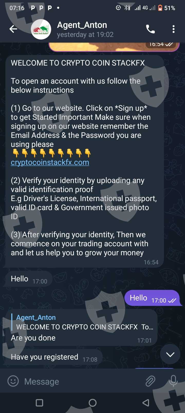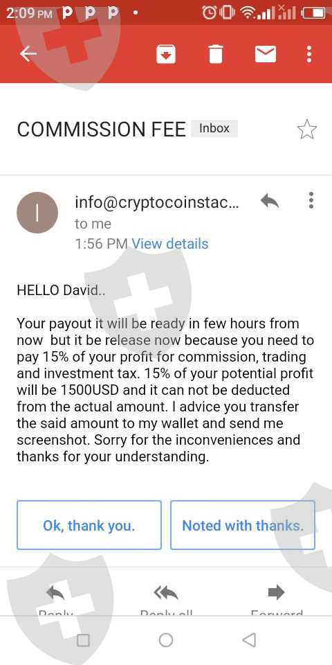cryptocoin stack agent lied me to deposit 100$ and promised to pay for me after 24hrs .after paying the money.they said I had to pay for commission of 15percent of my gain which was $1000.from that day I did not get my money back.