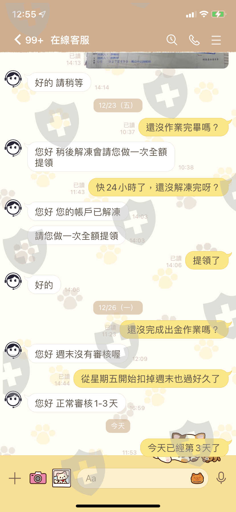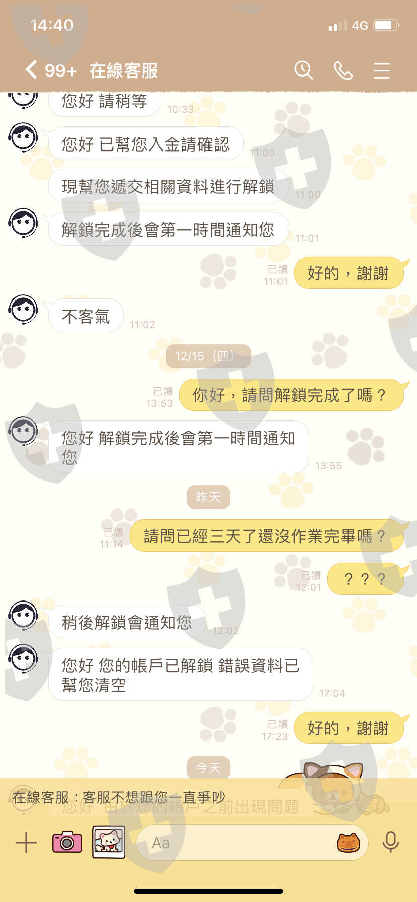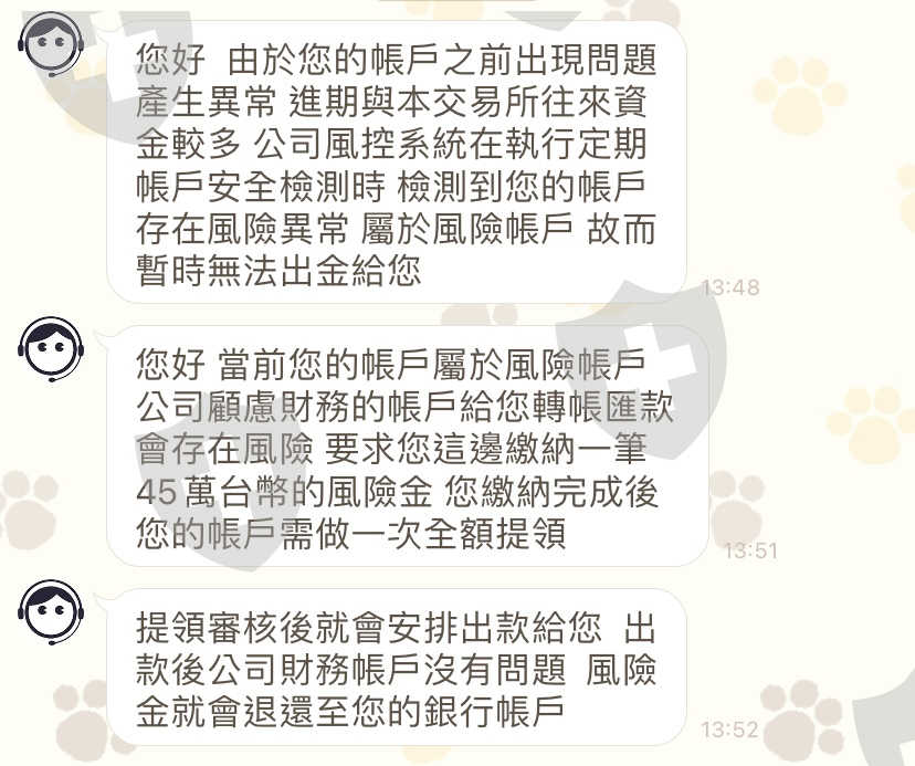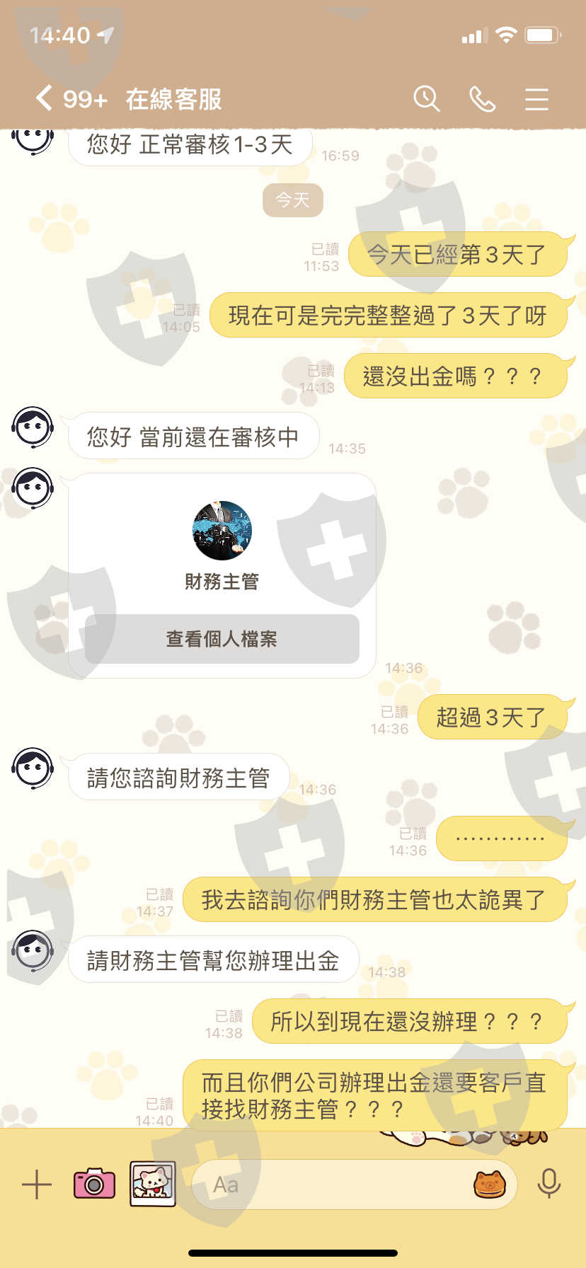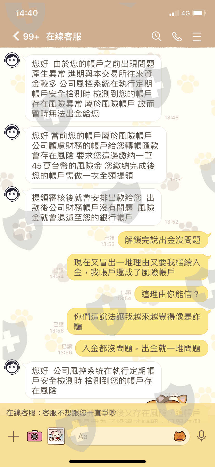 入金都沒問題,之前一次小額出金順利出金,但是後續出金,帳戶多了一個3對方要求繳納5000美金解鎖並帳戶後方可出金,繳納完解鎖後又不讓出金,說系統檢測為風險帳戶須繳納風險金45萬才可出金,繳納完風險金又給你拖了好幾天說讓你聯絡財務主管審核,財務主管又說出金金額較大要金管會要審核帳戶(確認過金管會不管出金問題),然後要匯30萬財力證明到他們的系統帳戶(看起來是人頭帳戶),之後又各種說審核中斷,讓你再匯30萬財力證明,說資金卡在系統裡要審核完才能一次退,風險金也不能領出,第一次聽說過這種凹人到底的系統!!!