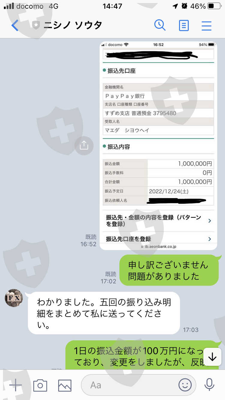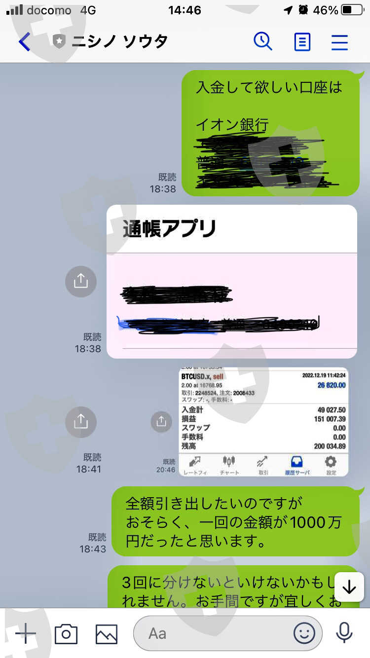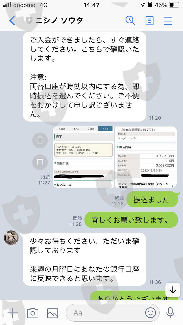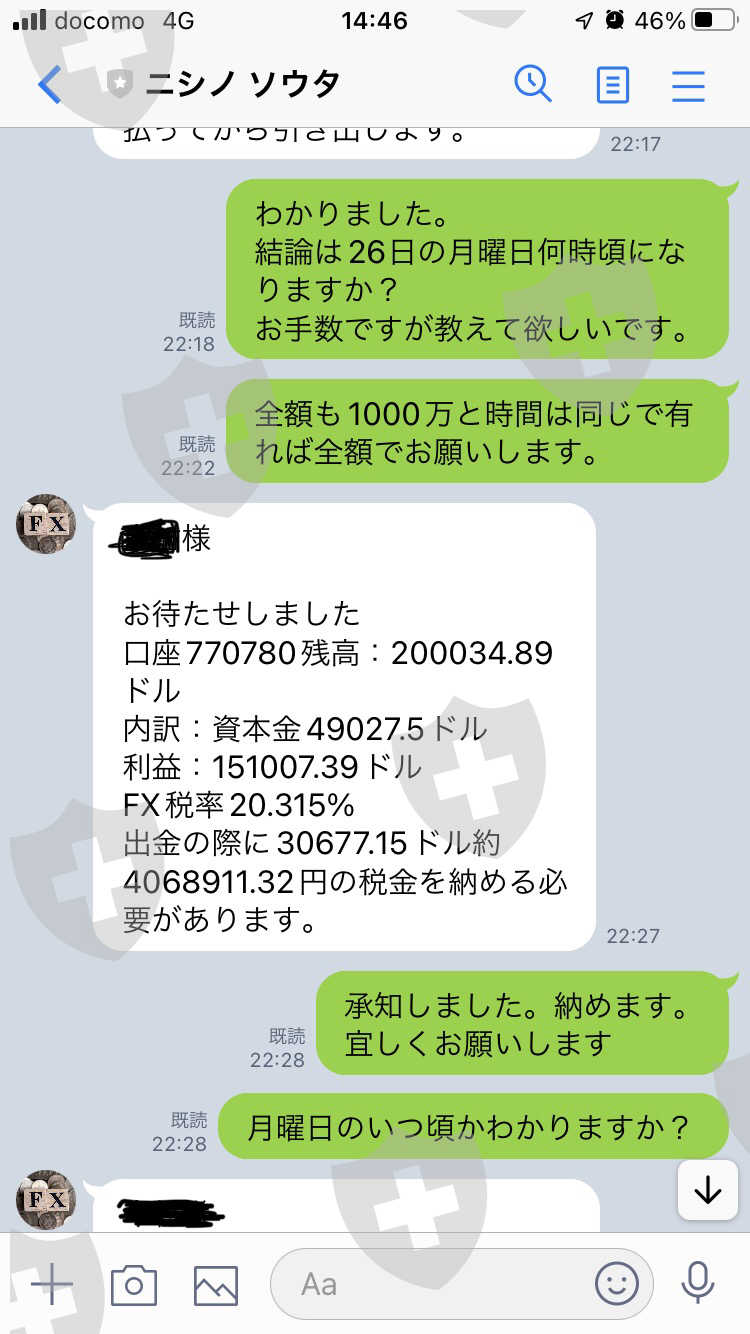 2022年12月26日に税金を納めて、出金手続きを行いましたが、未だに入金されていません。担当の西野ソウタさんと連絡が取れなくなりとても不安です。2022.11.26に口座の開設しました。口座番号は770780です。その後、計670万円振込ました。それを資金にFX取引を行い、20,034.89ドルまで資金を増やしました。出金を依頼しましたら、税金を納めないと出金出来ないと言われ、税金として4,068,912円を振込ました。税金を振込んだのが2022.12.25です。入金の次の週の月曜日に入金されるとのことでしたが、出金が混み合っているのでいつになるか分からないと言われ、年が明けてからは連絡が取れなくなってます。どうか解決宜しくお願い致します。