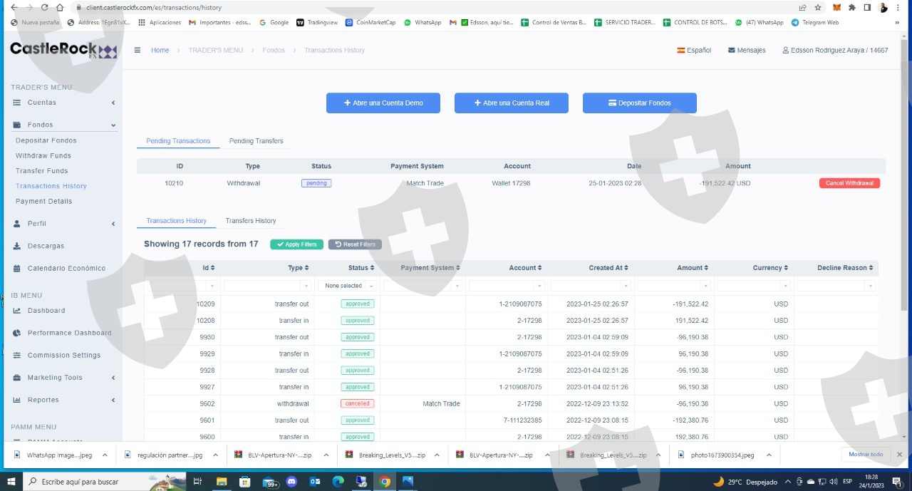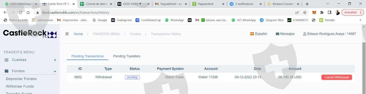 El 09 de diciembre 2022 solicité un retiro por $96038 USD y a inicios de enero de 2023 no había sido procesado, me informaron que tenían problemas con el procesador de pagos por cripto, que estaban solucionando. Devolví el dinero para volver a tradear, sin embargo hpy acabo de solicitar de nuevo el retiro del total de mi capital $191522.42 USD, a la espera de que puedan procesar el retiro. Por contacto con soporte del broker se que aún no han solucionado el inconveniente y que tienen varios retiros pendientes por ejecutarse.