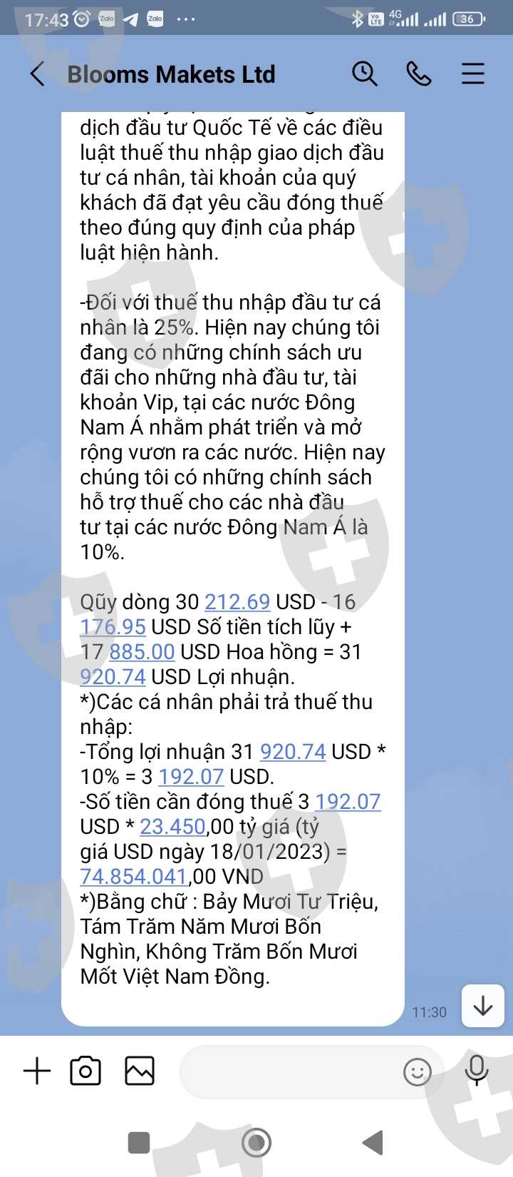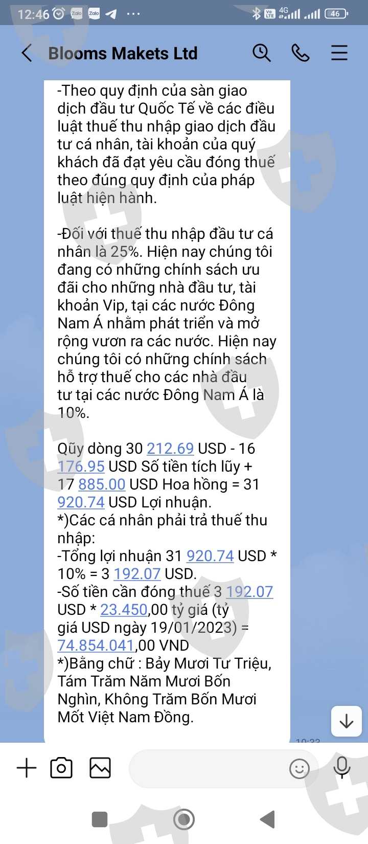 tôi có nạp tiền và tham gia giao dịch tại sàn blooms markets limited khi giao dịch có lãi muốn rút tiền thì sàn đã trừ tiền trên tài khoản mà không chuyển tiền cho tôi bắt đóng thuế và bây giờ là khoá tài khoản của tôi,đề nghị và mọi người giúp đỡ tôi lấy lại được tiền,xin chân thành cảm ơn!