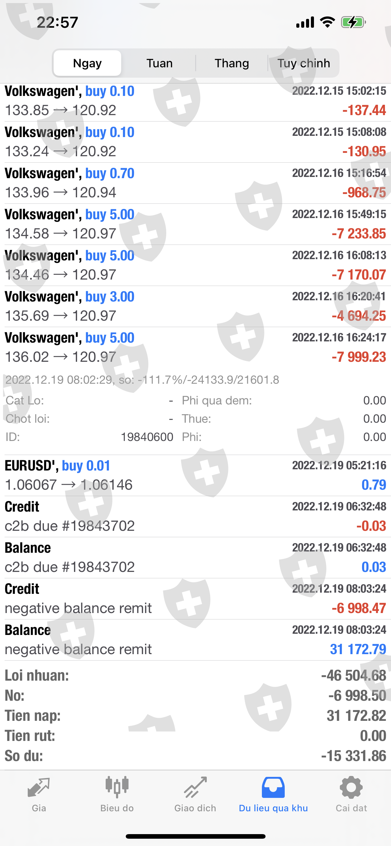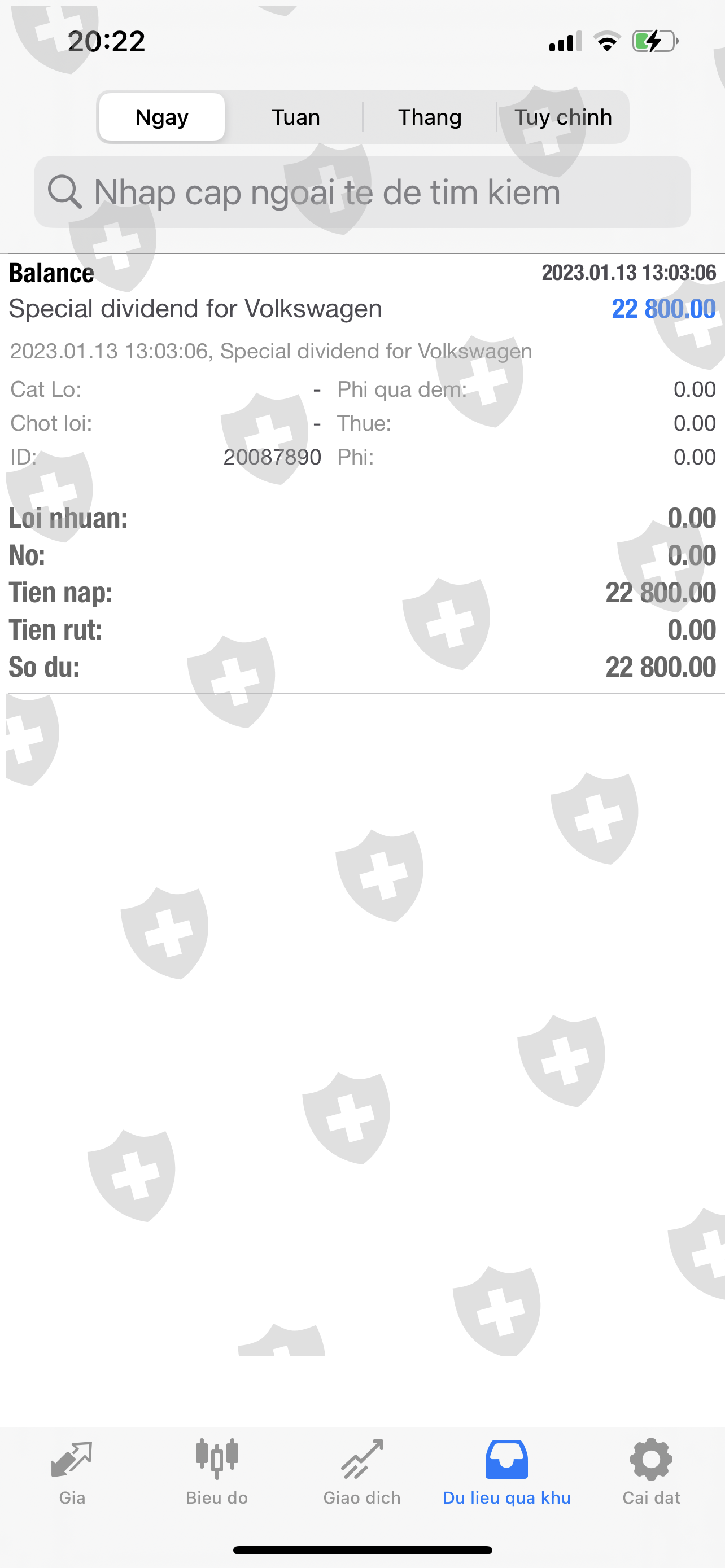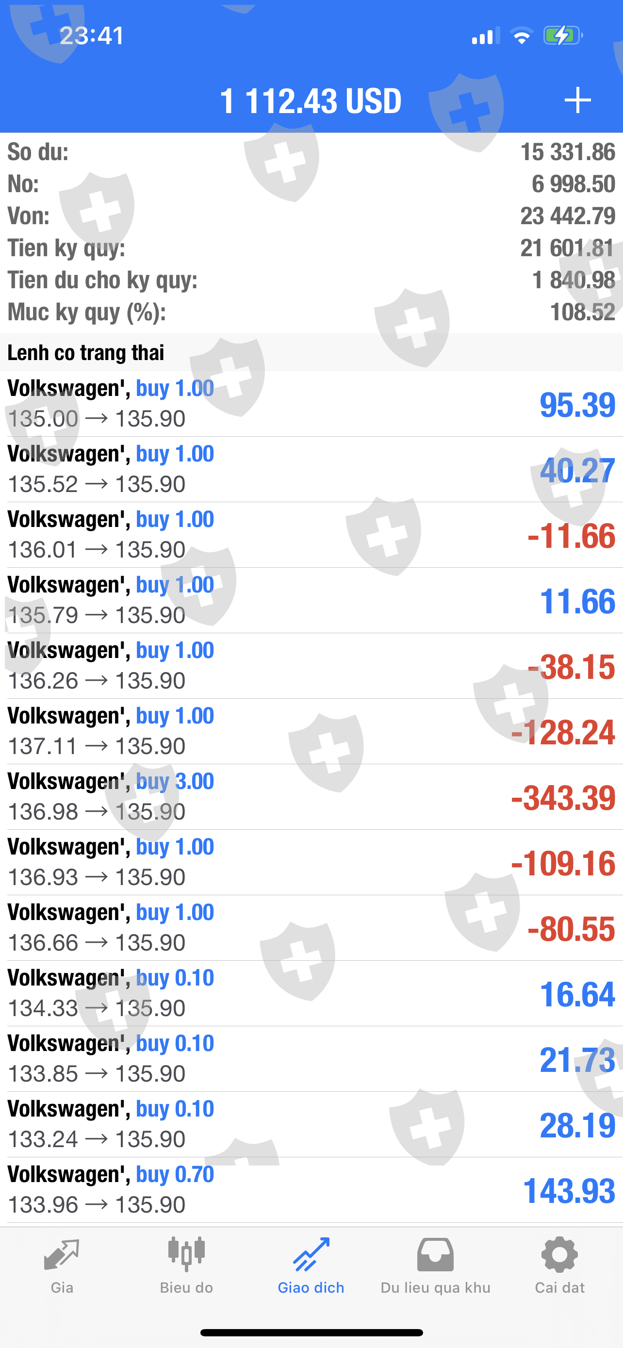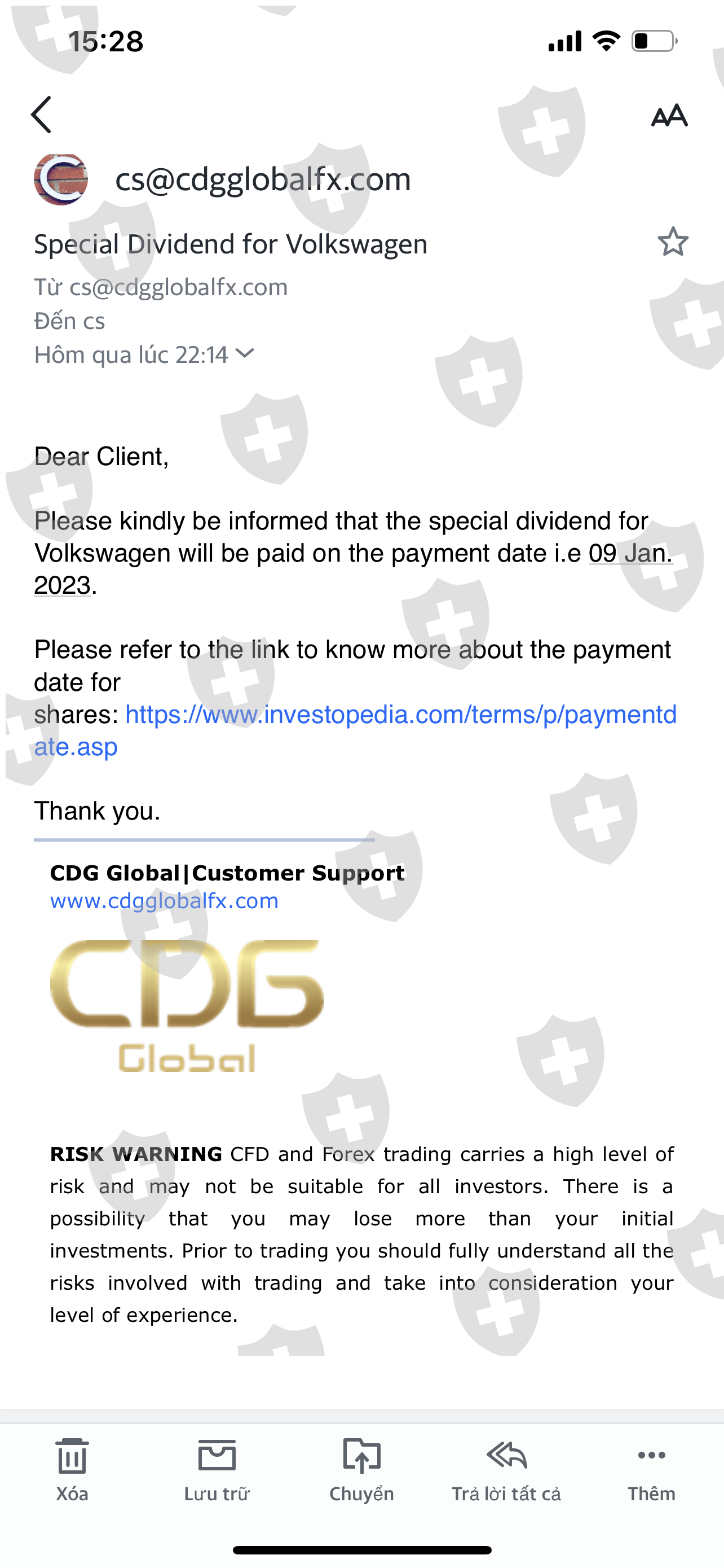 Tôi nạp tiền vào tài khoản MT4 từ ngày 12/9/2022 với tổng số tiền là 14.100$ . Ngày 15/12/2022 Tôi mua 3.000 cổ phiếu Volkswagen AG VZO O.N để nhận cổ tức vào ngày 19/12/2022 ,nhưng ngày 19/12/2022 CDG không chi trả cổ tức Volkswagen cho Tôi (trong khi tất cả các sàn trên thế giới đều chi trả cổ tức Volkswagen vào sáng ngày 19/12/2022) , đến 15g ngày 19/12/2022 phiên Âu mở cửa, cổ phiếu Volkswagen rớt giá thảm hại làm cho tài khoản của Tôi bị cháy và âm số dư là-31.172$ , sau đó đến 22g ngày 19/12/2022 CDG email cho Tôi và thông báo sẽ chi trả cổ tức Volkswagen vào ngày 9/1/2023 . Tôi trông đợi từng ngày đến ngày 9/1/2023 để nhận cổ tức, nhưng đến ngày 13/1/2023 CDG chi trả cổ tức Volkswagen cho Tôi chỉ có 22.800$ (trong khi tiền cổ tức của Tôi là khoản 61.000$) không đủ bù đắp vô số dư âm , hiện giờ tài khoản Tôi còn âm -8.372$ . Nên Tôi yêu cầu CDG kiểm tra lại và chi trả đủ (khoản 61.000$) tiền cổ tức Volkswagen cho Tôi, để Tôi tiếp tục đầu tư và kiếm lợi nhuận. CDG đã giam số tiền cổ tức của Tôi từ ngày 19/12/2022 đến nay hơn 1 tháng rồi, Tôi rất lo lắng và đau khổ . Thanks !