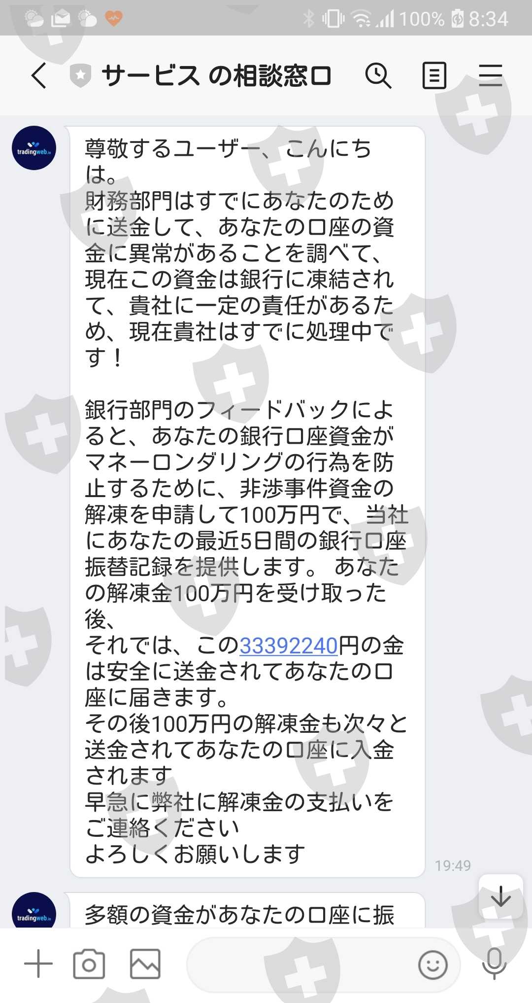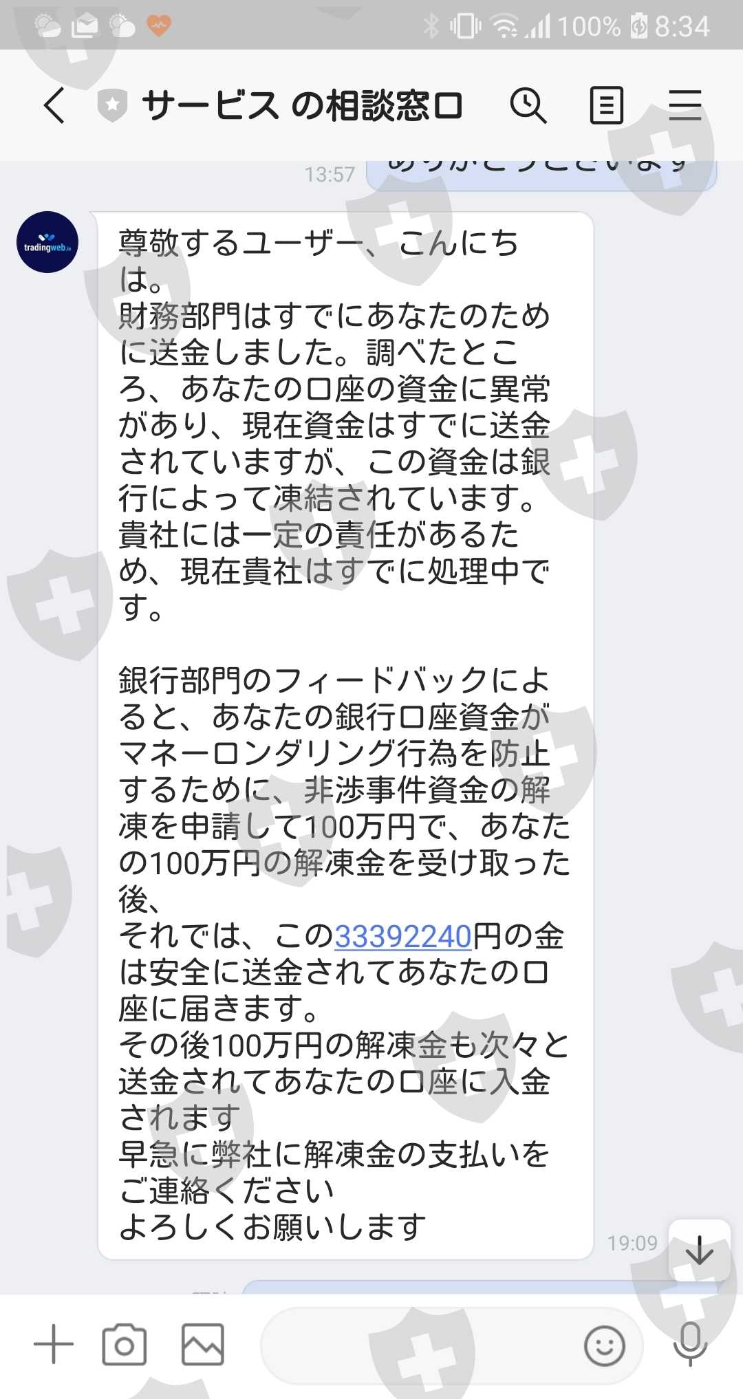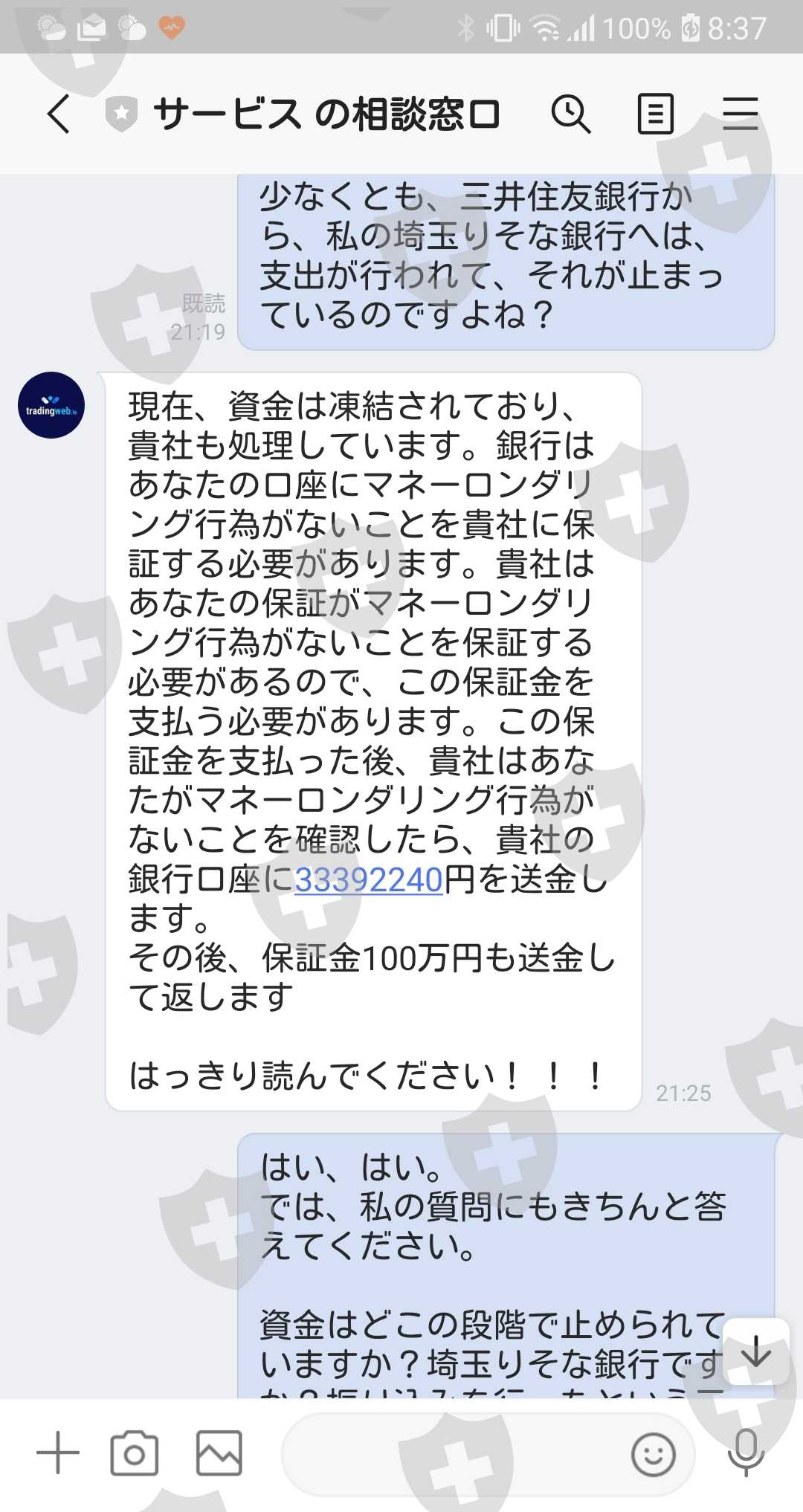 渋々それを支払ったが、今度はマネーロンダリングの疑いがあるということで資金が凍結。解凍には3%の保証金(100万円)が必要との説明。(保証金は後日返されるとの説明。)