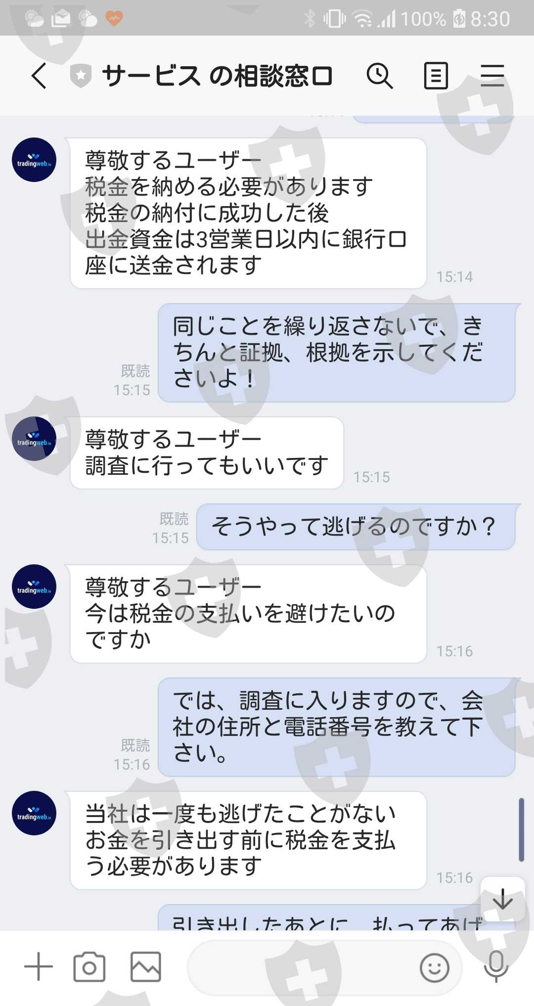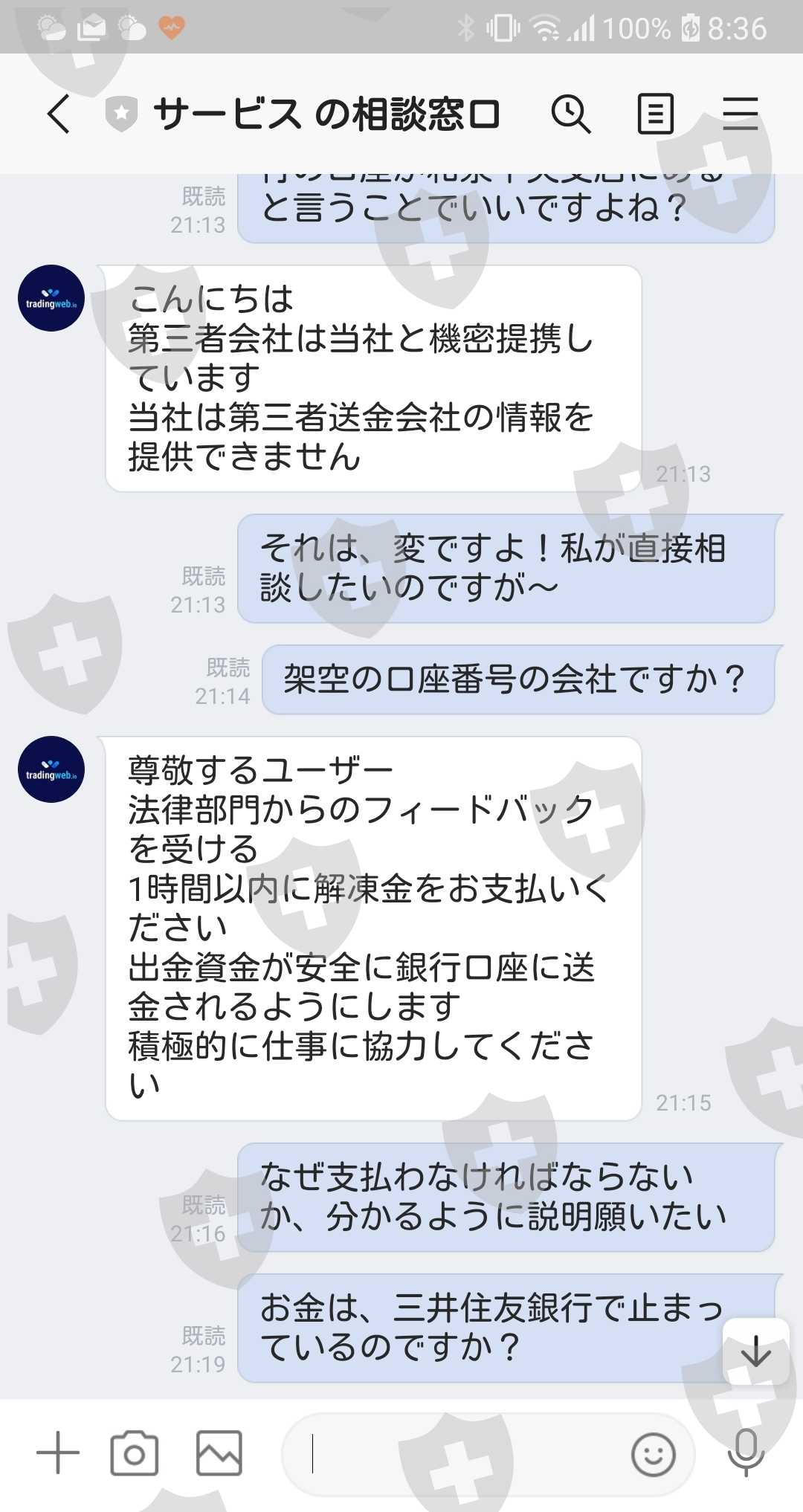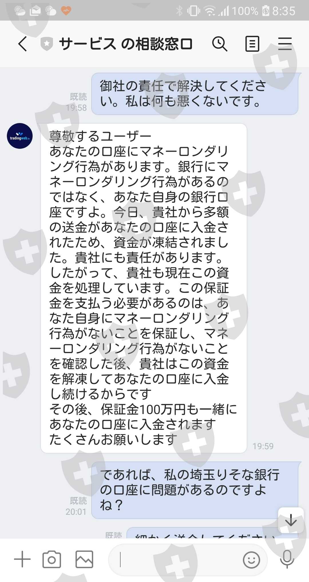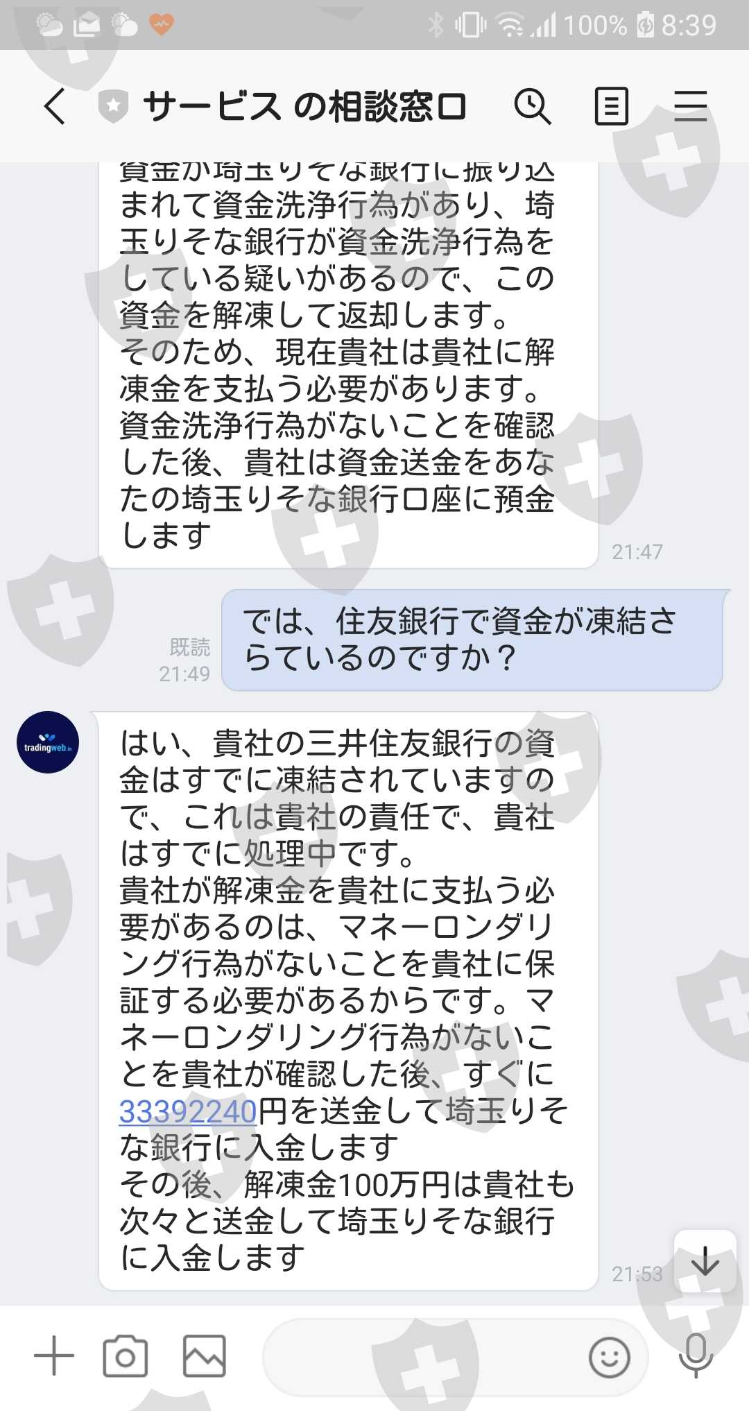 渋々それを支払ったが、今度はマネーロンダリングの疑いがあるということで資金が凍結。解凍には3%の保証金(100万円)が必要との説明。(保証金は後日返されるとの説明。)