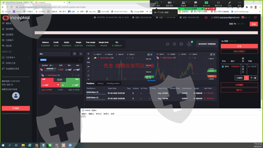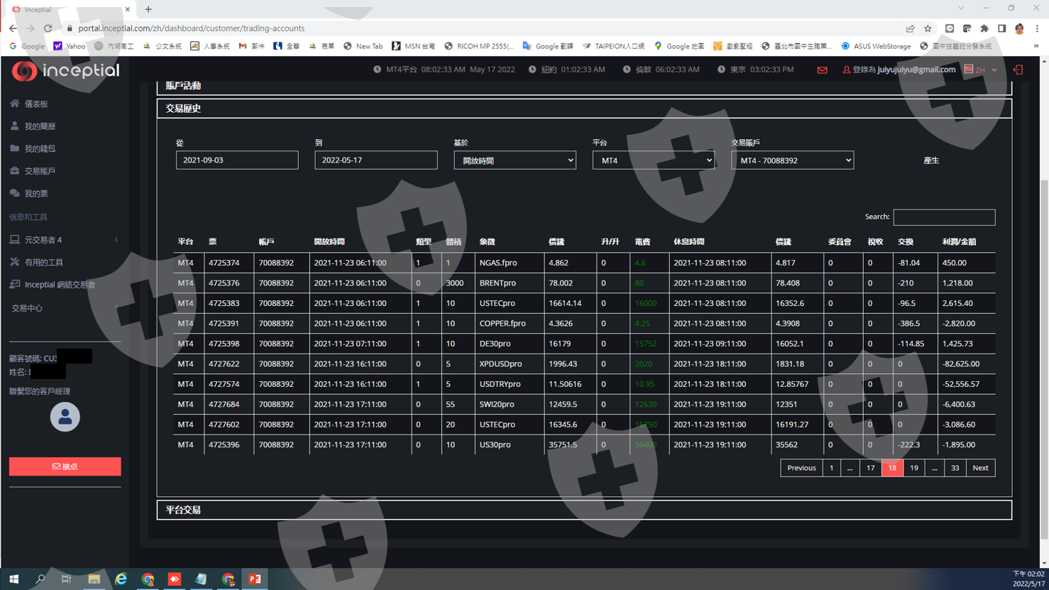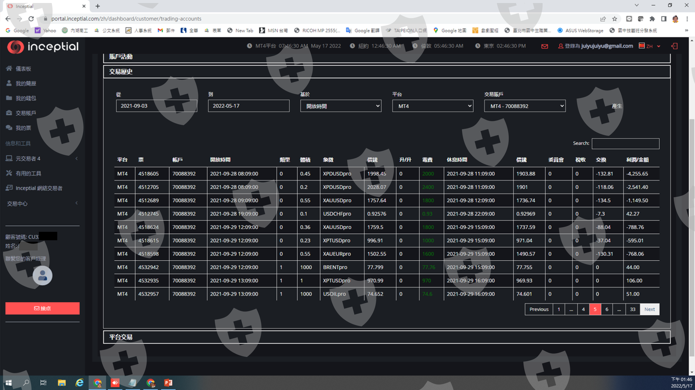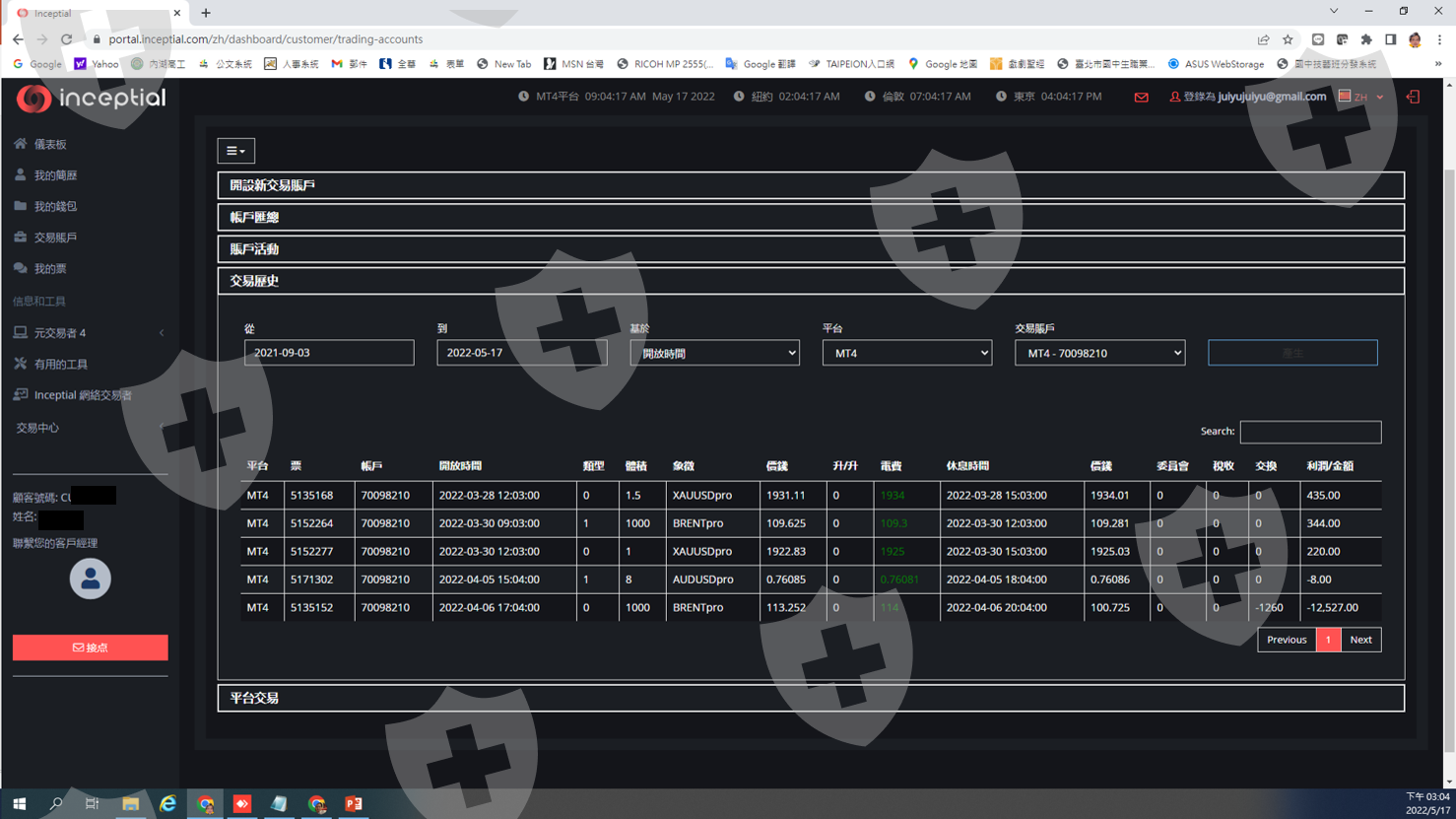 自從2021年9月,被eXcentral公司(之前在這個平台也爆掉約3萬多美金)轉介至Inceptial公司,該公司不斷要我存入保證金投資,帶我操作投資,一有賺錢就會爆倉,爆了倉就換一位經理人,說要幫我把虧損賺回來,但一次又一次全部都爆光,最後由該公司的副經理接手,說他是高層,有更精確的消息,要我再投入資金參加一個專案投資,可以幫我將之前的虧損賺回來,結果該投資說已賺進30萬美金,為了要拿到該筆金額,又不斷要我入金,說什麼要繳手續費、稅金、刷投資量…等等,結果這些錢也在平台上都爆光光,副經理都說不影響,現在投入的資金全都爆倉光了,那30萬美金說2022年4月5日可以進來,但至今音訊全無。(交易照片很多,僅列部分參考)