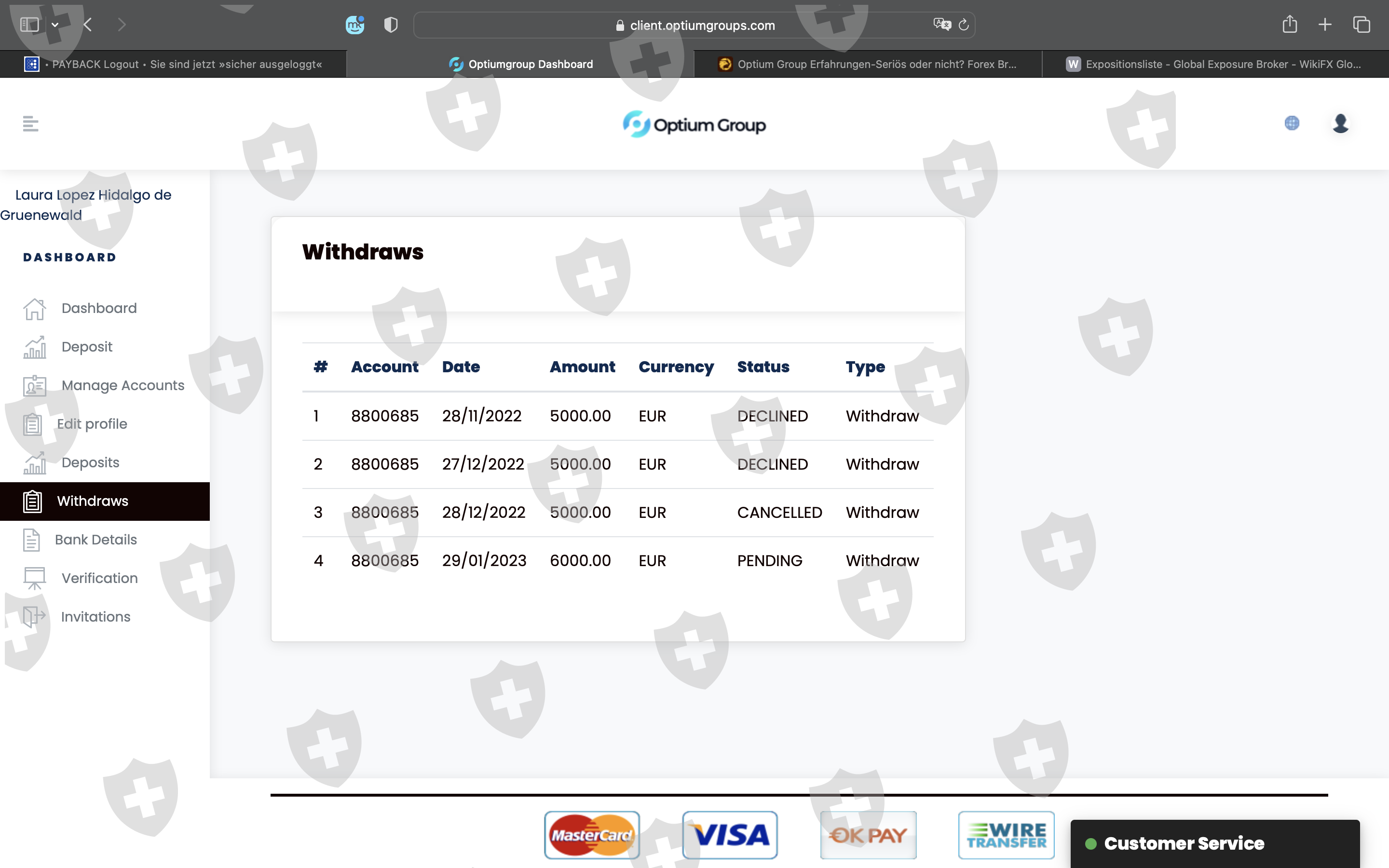 我在一周前提交了提款请求,但它正在由 Optium Group未处理,未付款。我也没有来自支持团队的信息或反馈 Optium Group收到。已经取消了数周未处理的提款请求,并开始了新的尝试。这给人的印象是他们想要 Optium Group阻止客户的提款请求,并且通常不偿还已支付和赚取的钱。非常悲惨的商业行为。你必须避免这个经纪人!