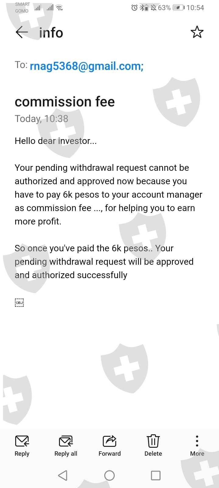 I paid a couple of fees then when they say i can withdraw my profit, they send me an email saying I need to pay a 6kPhp commission fee to the account manager before my profit will be recieved..