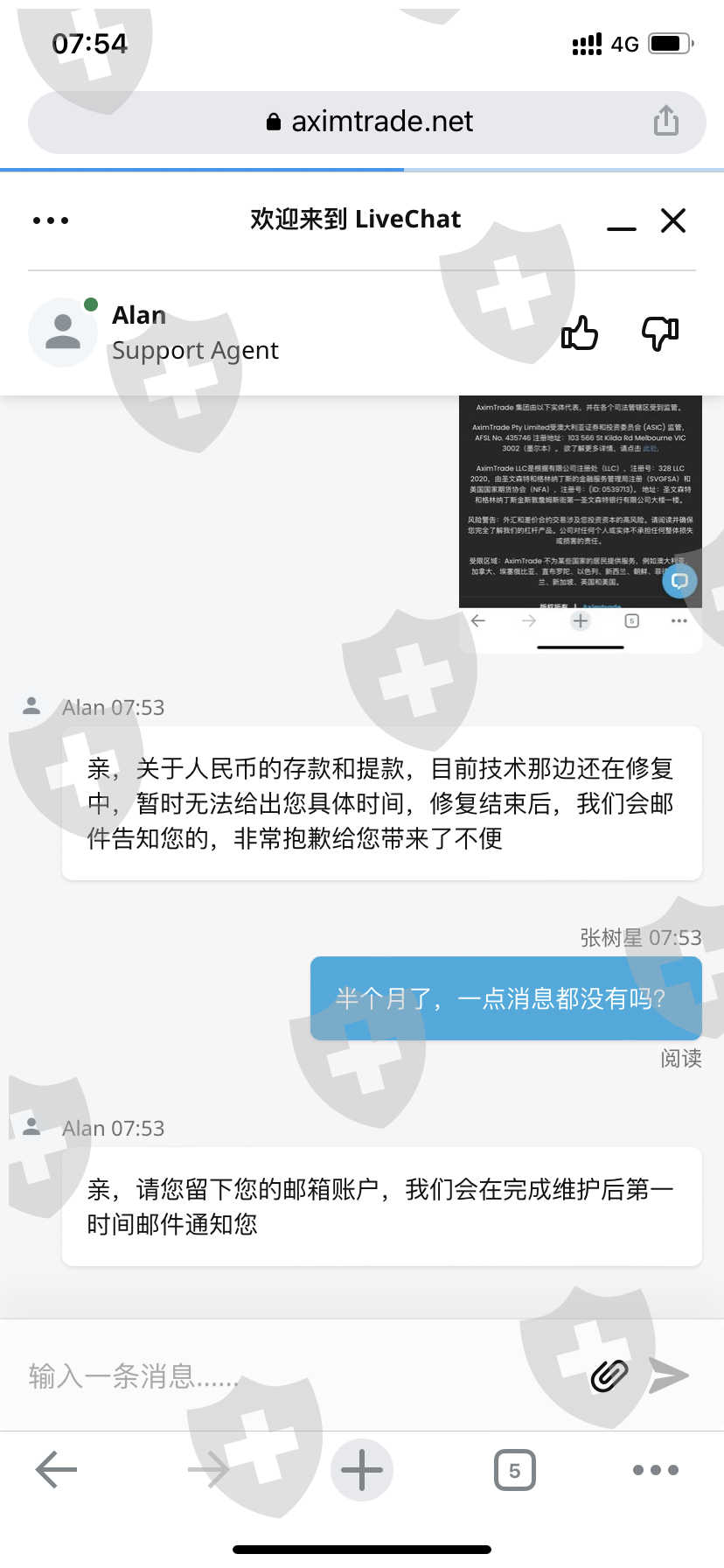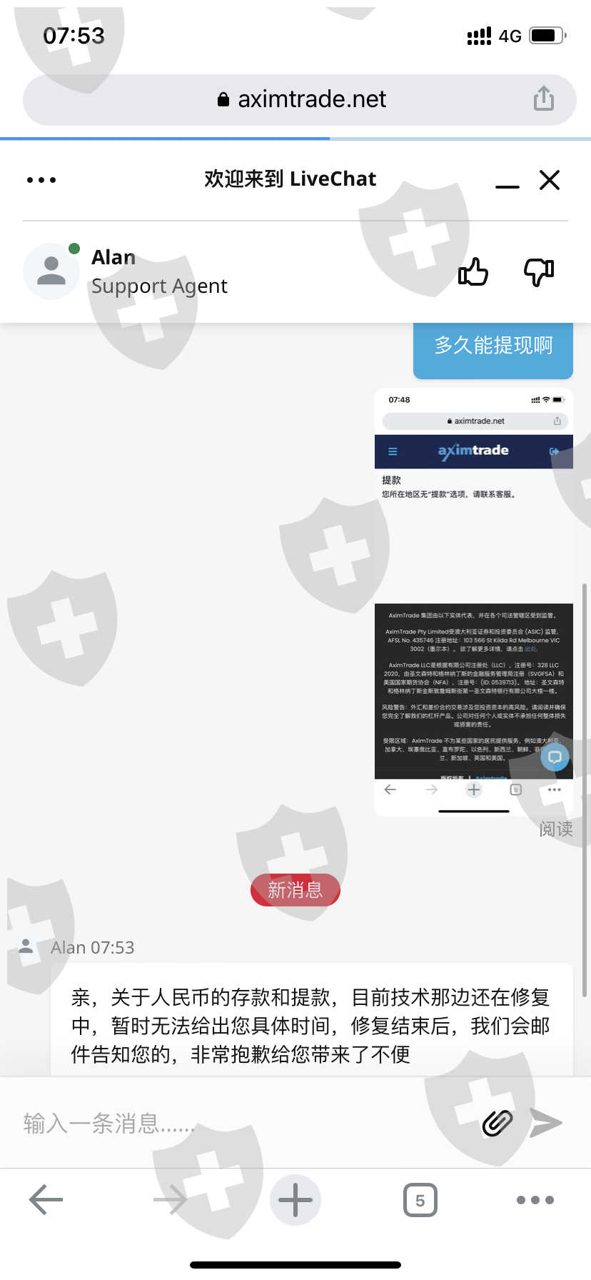 我的自己的账号不能出金入金,客户的也是一样,这个平台一直说人民币在维护,维护多久开始的都没有通知,多久结束也没有通知,一直询问他们也给不出答复,让一直等待,客户有几千美元出不了金
