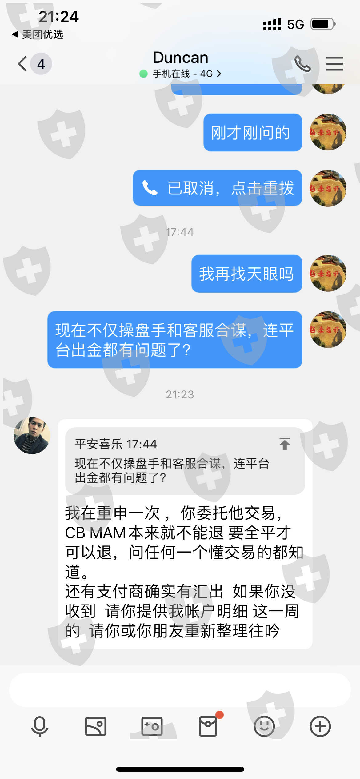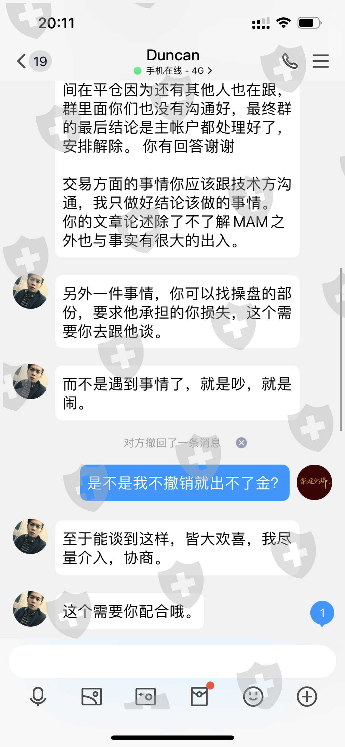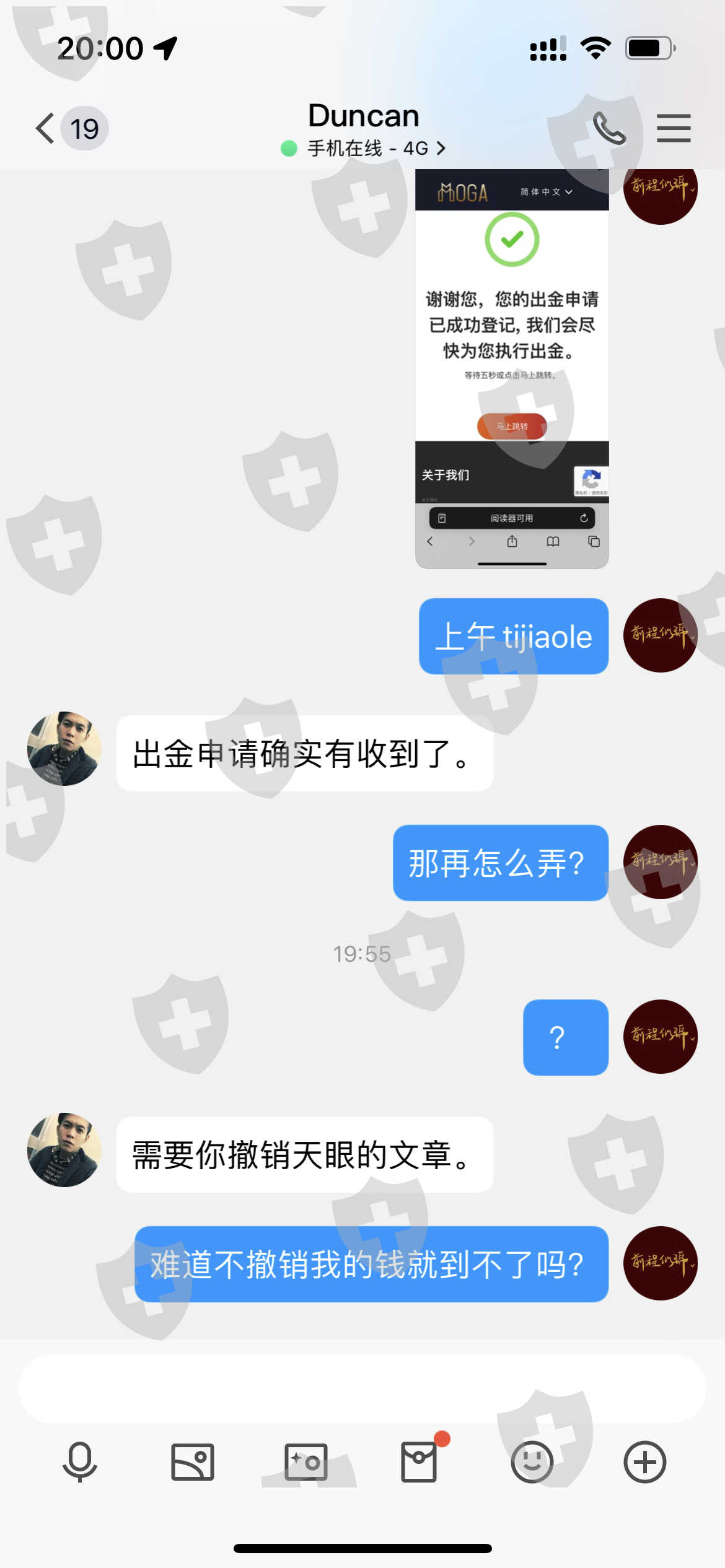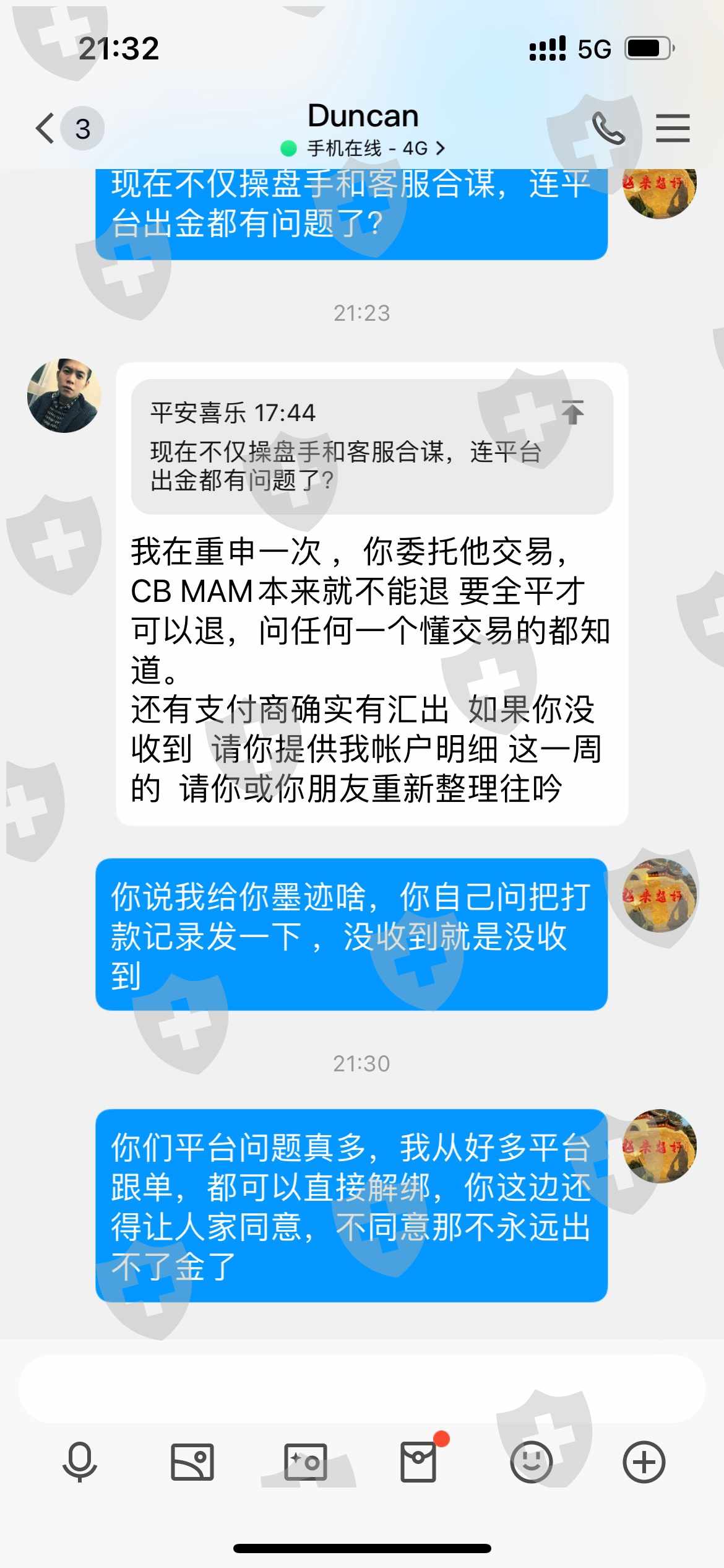 外汇界的骗子,真人真事,用生命起誓,后面说的话都是真的,我要平仓不给我平,在我说要出金的时候,第二天就导致我爆仓,忽悠我最大回撤百分之30为什么直接给我爆仓,单子看不到,虚假交易,客服说承认因为他的失误,导致我的单子看不到,这就是虚假交易数据单,客服合谋维护操盘手不给我割单,客服为什么要维护,为什么还说他单方面解绑会弄得他尴尬,我是客户,我砍自己的单,赔自己的钱还不行吗,其实就根本没有做单,每次我想看净值就给我发张制作好的单子,还有1000美金目前moga出金都没到账,已经1个星期了,别的绑定跟单自己都可以解绑,我解绑必须经过人家同意才可以,如果人家不同意解绑,难道每个人都要打爆仓才可以吗 ,看净值每次都给我发做的数据,moga平台就是自导自演欺诈钱财的,平台问题很严重,也没有监管,为什么我要出金客服为什么要维护还给我讲黄金拿着怎么怎么样