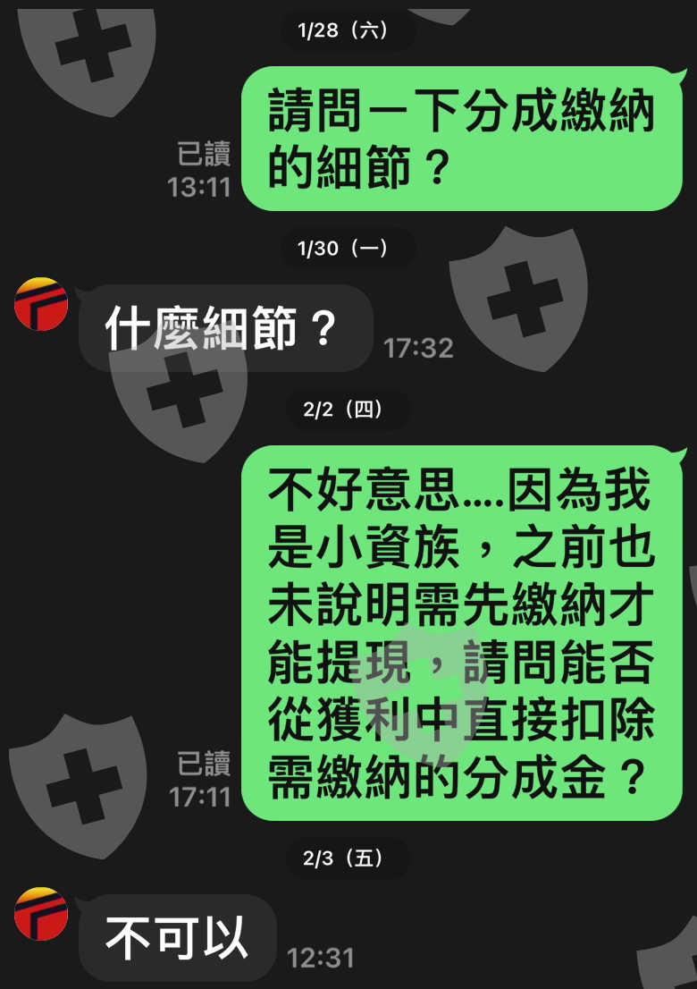 獲利要提現時,服務人員告知需先繳交代操獲利分成金,並且無法從獲利中扣除,或是讓我先提現部份獲利,待繳納分成金後,再領取其餘獲利金額,就是要我一直拿錢出來,感謝有這個平台讓民眾有問題可以反應