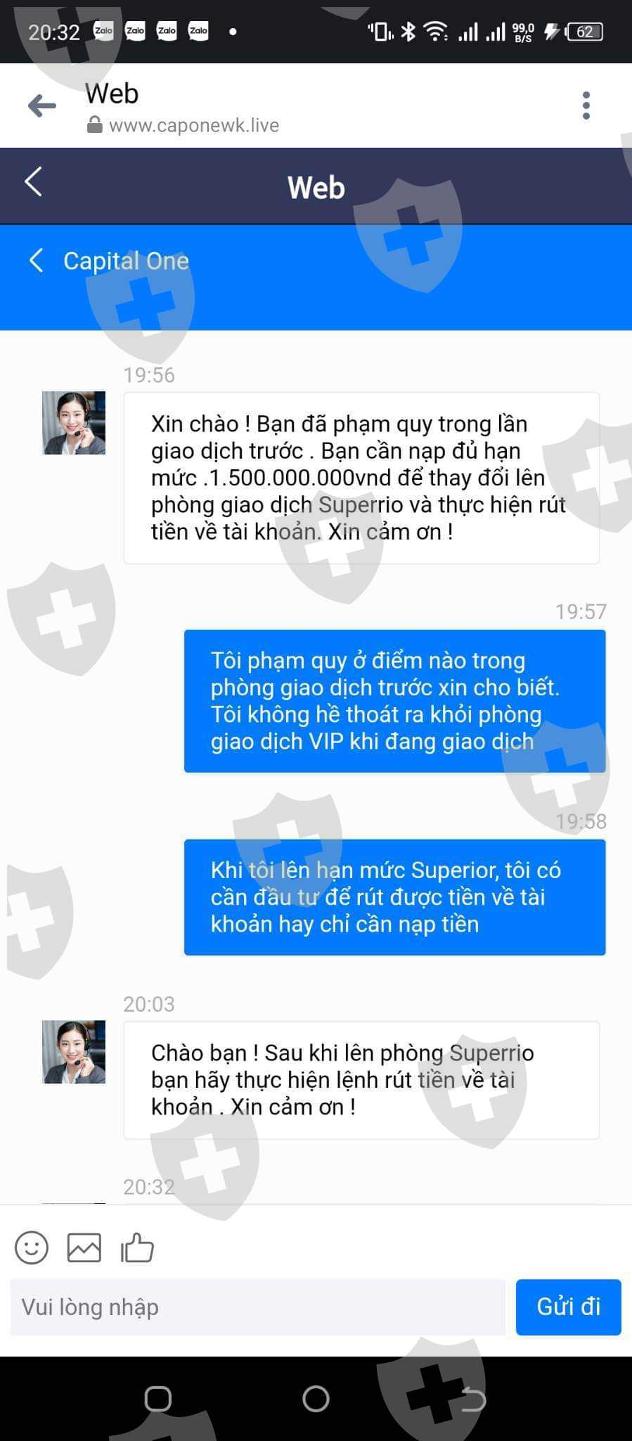 Tôi không thể rút tiền khỏi sàn này sau khi nạp vào nhiều lần , bắt nạp tiền ,nâng cấp tài khoản liên tục trên sàn với lý do khách hàng vi phạm nội quy các phòng giao dịch , trong khi nội quy không hề được niêm yết chính thức trên sàn . Có dấu hiệu Scam lừa đảo. Tôi mong được giúp đỡ, hỗ trợ giải quyết.