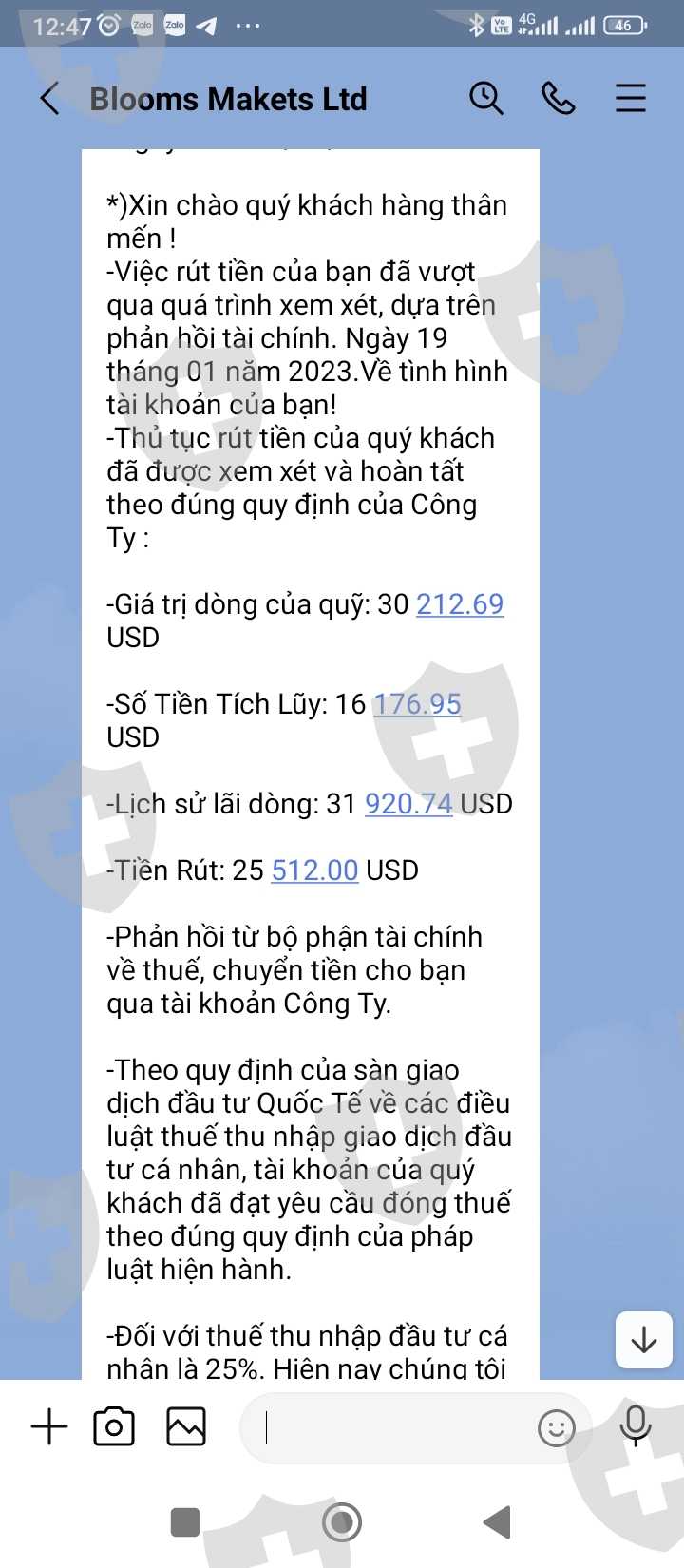 tôi có nạp tiền và tham gia giao dịch tại sàn blooms markets limited ltd nhưng khi giao dịch có lãi muốn rút tiền thì sàn bắt đóng thuế và khoá tài khoản của tôi
