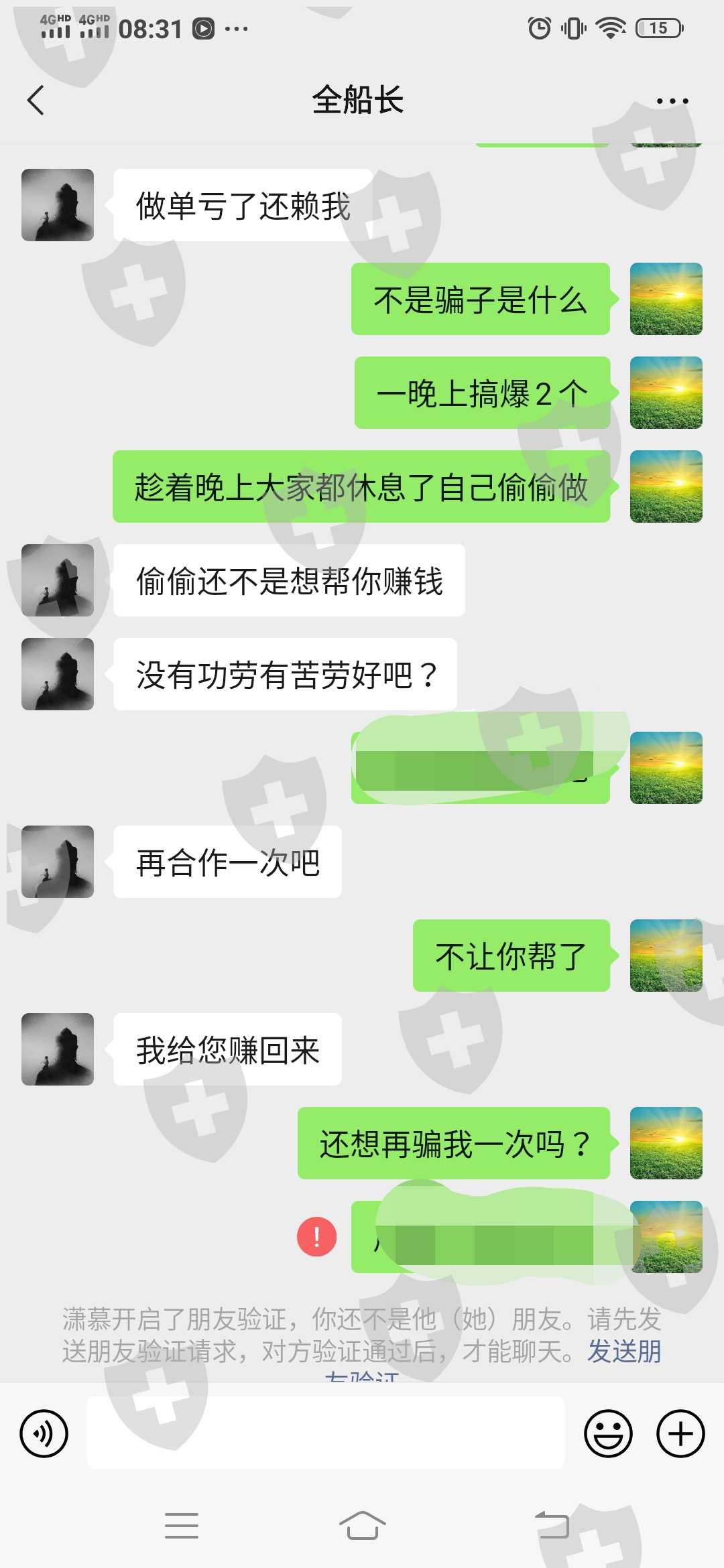 此黑心代理发朋友圈1000美金,盈利合作,因为是黑平台,所以后台能修改数据,入金就爆仓,注意头像不要被骗,此代理在多个平台招摇撞骗,并多次修改头像微信名 ,之前用过潇慕 ,全爷,现在是新头像和微信名。