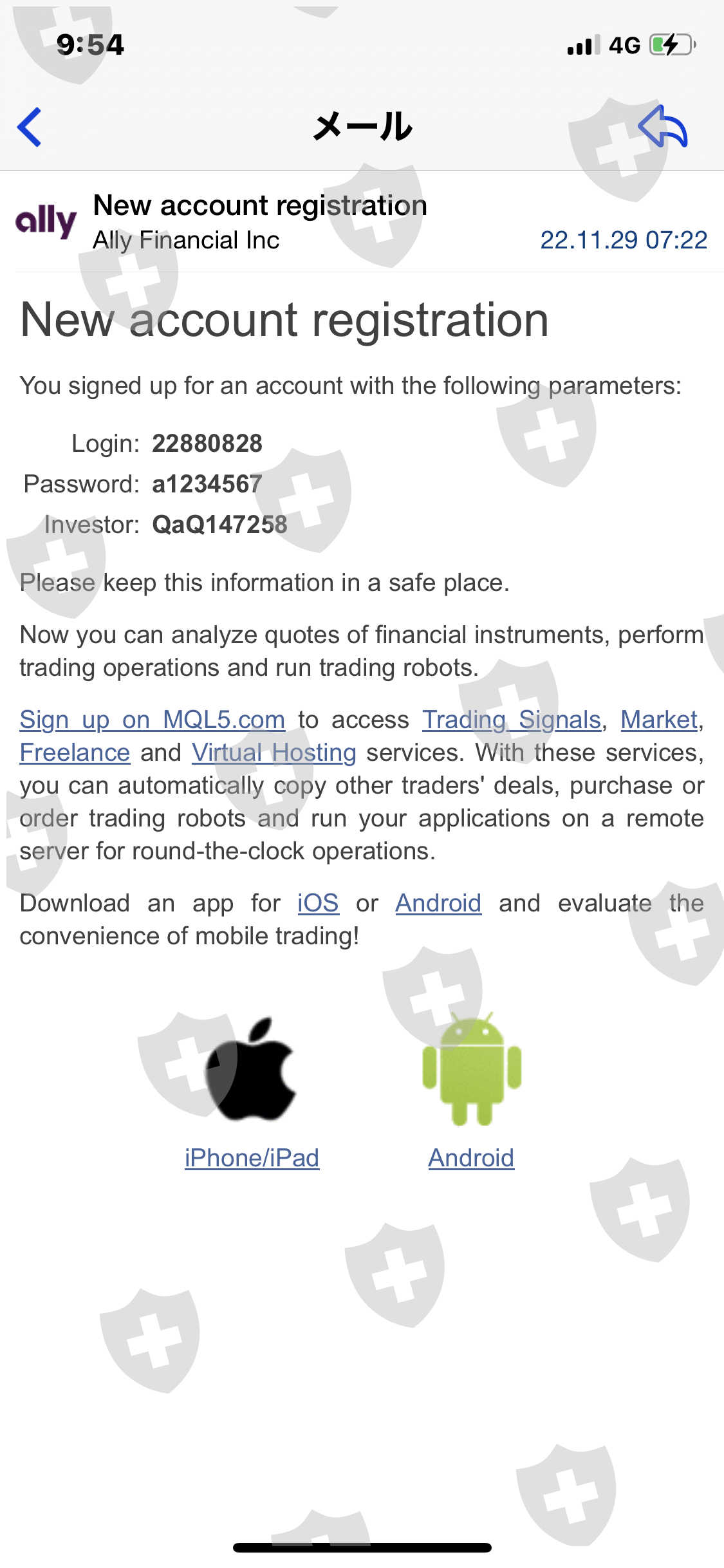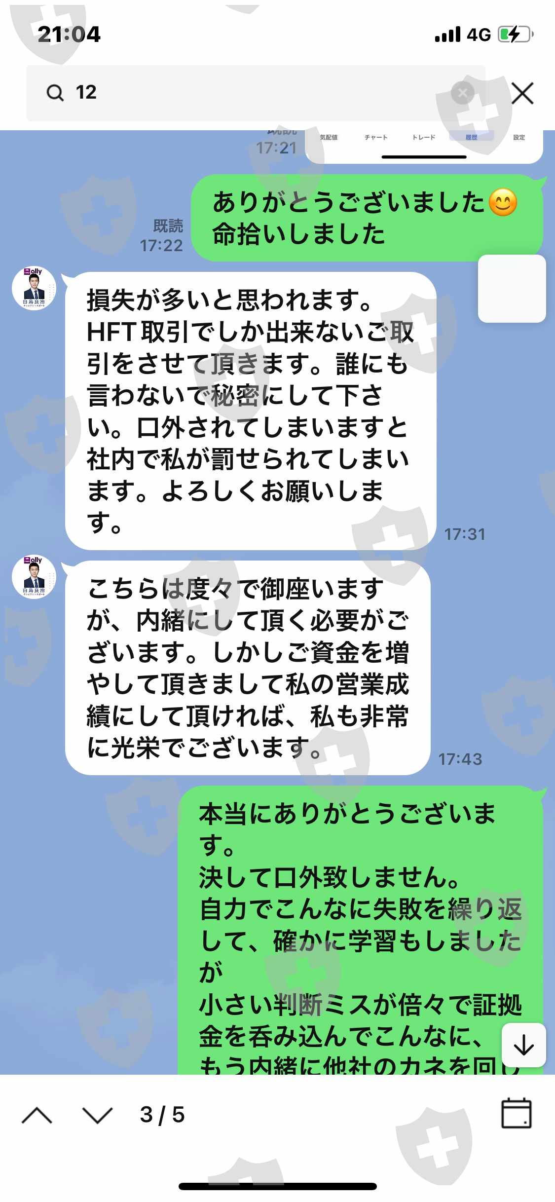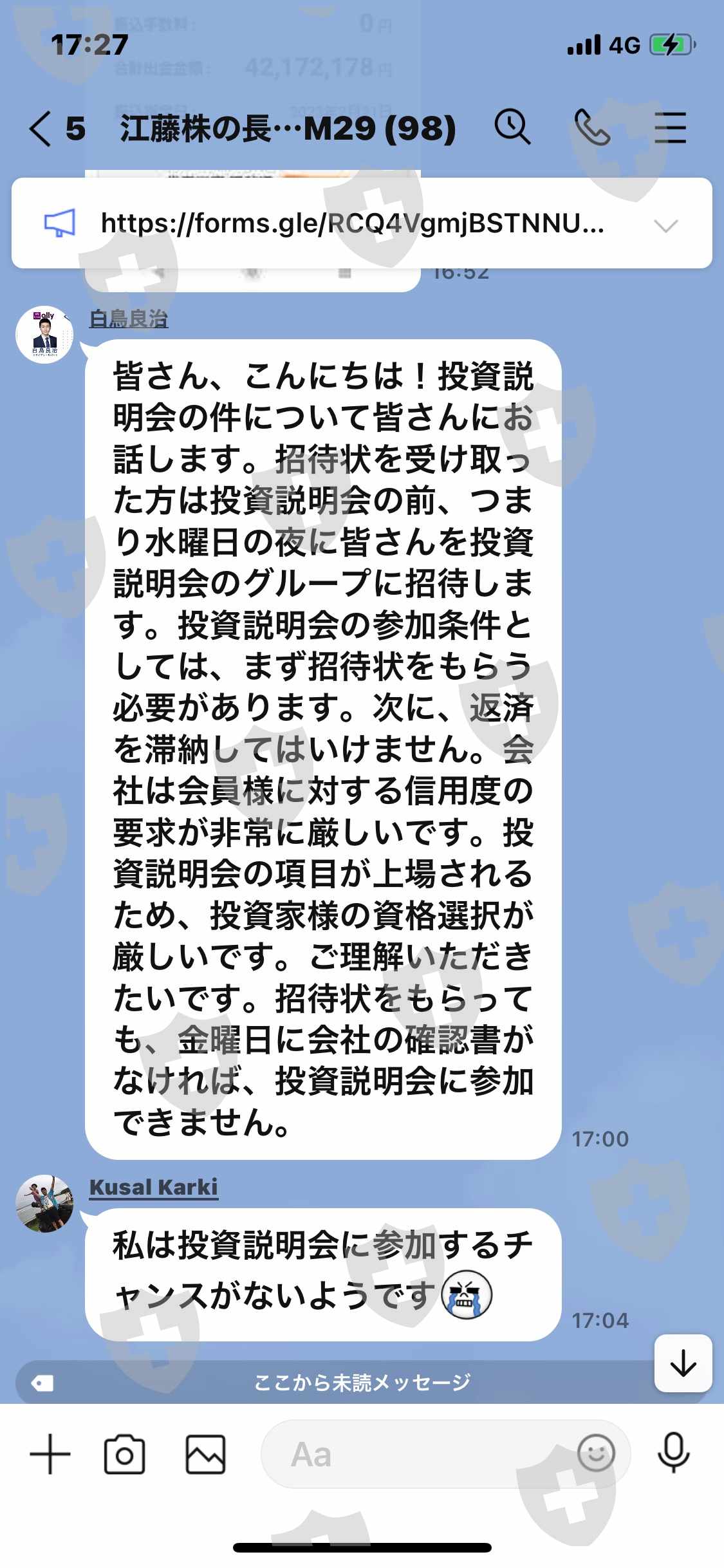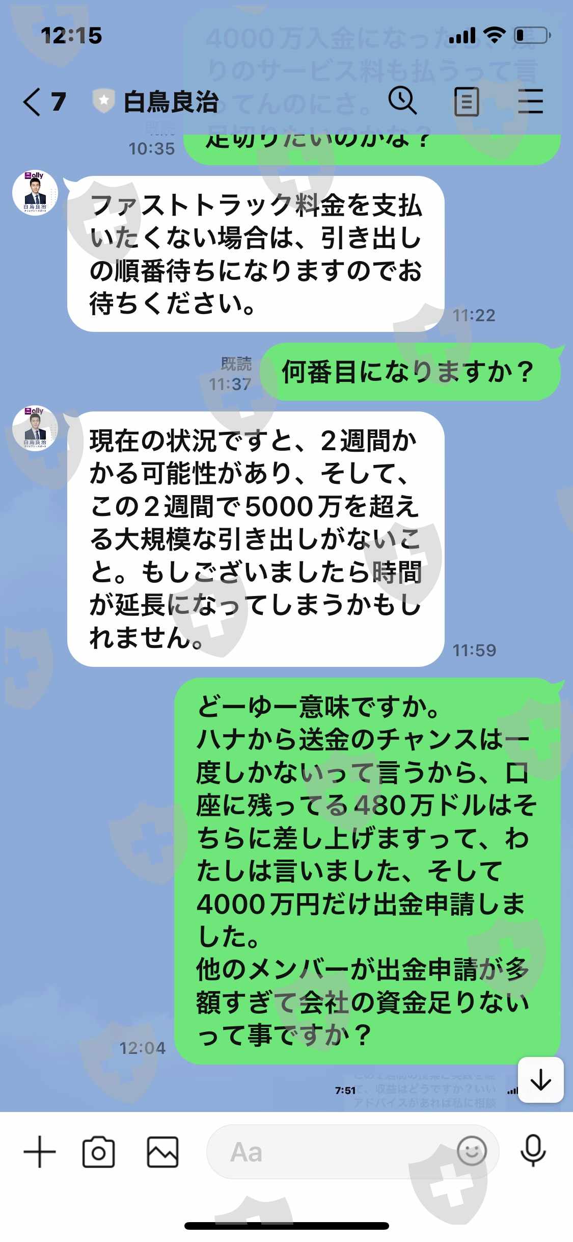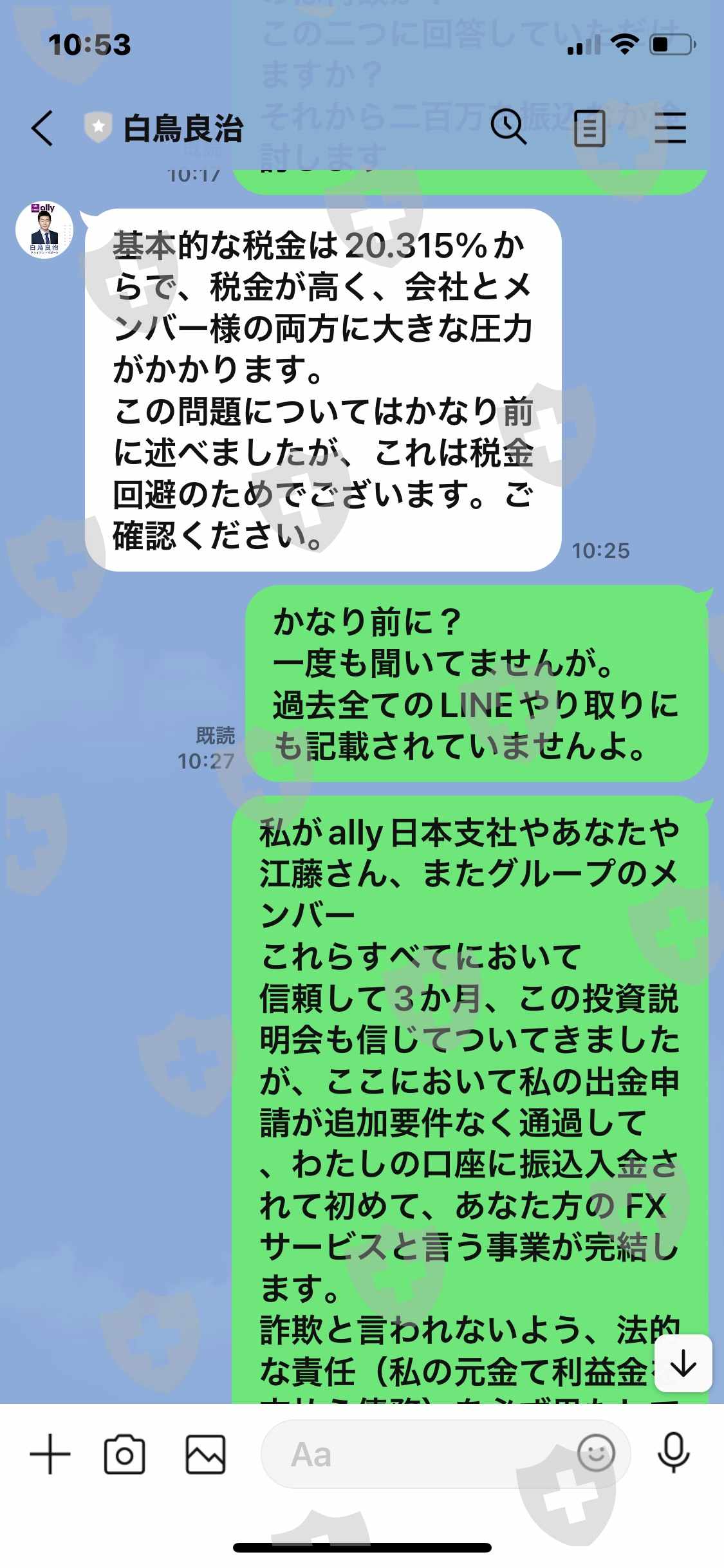 2022年11月29日からallyfinancial日本支社を名乗るLINEグループに非自発的に追加され、利益額を一度は出金できたものの、次に出金要請をすると、委託料5%の支払いを先にするよう求められ、応じで再び出金要請をすると繁忙で遅滞するが、追加の振込をすれば早く引き出せると誘導し更なる金員を要求してくる。グループLINEにおける江藤或いは白鳥の取引指示通りMT5を操作して、